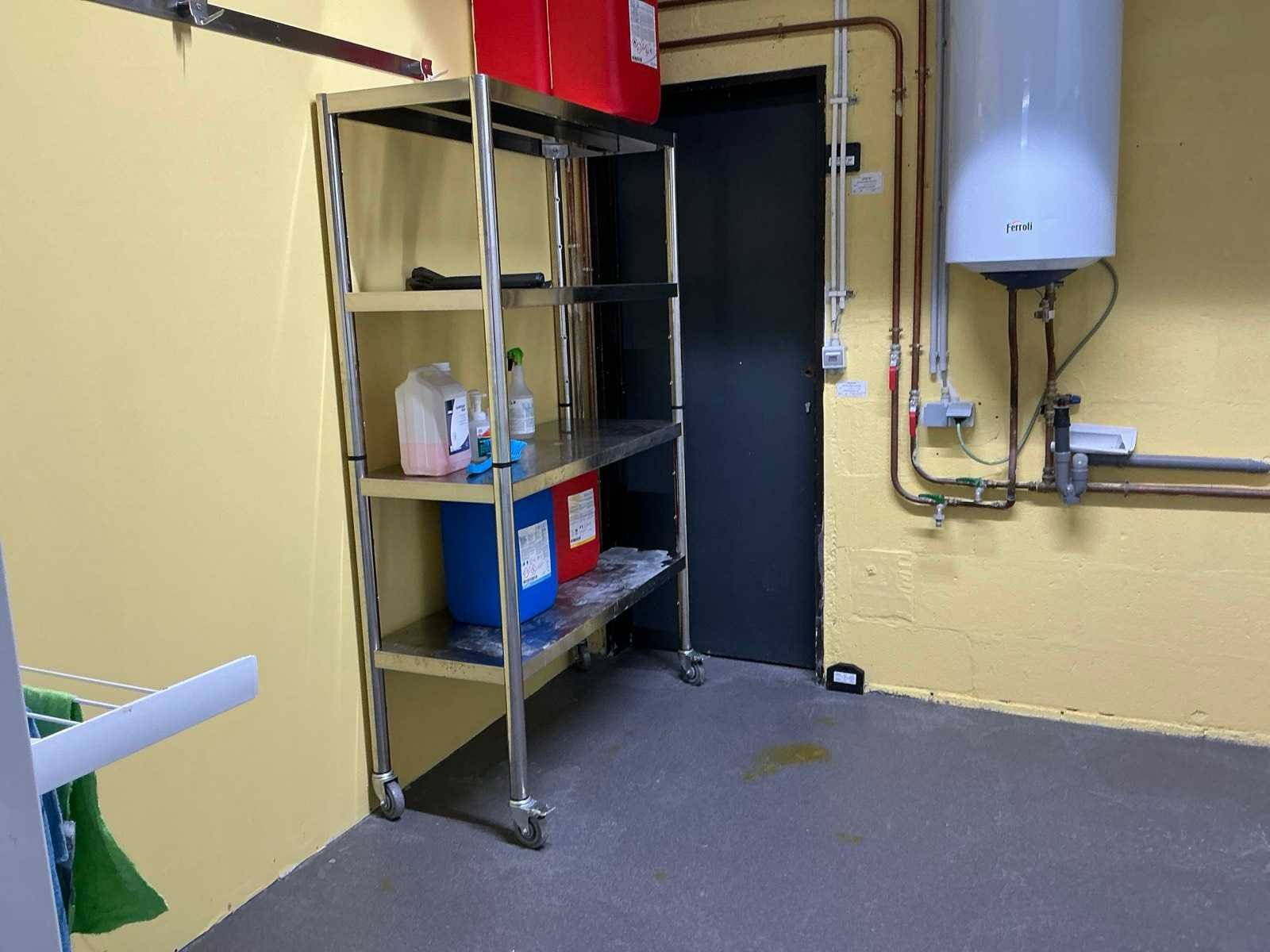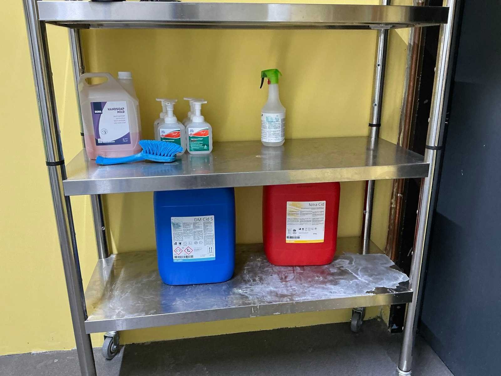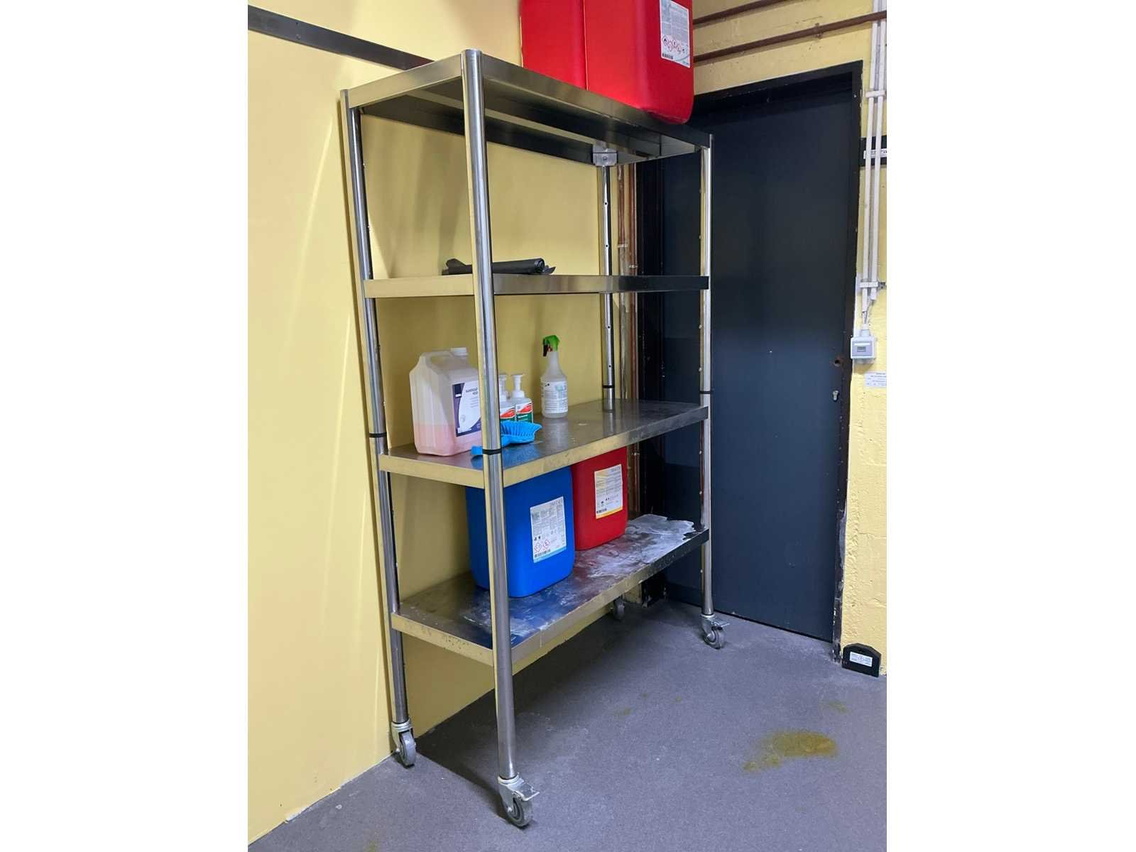 1 verrijdbaar rvs opbergrek voorzien van 4 niveau’s afmeting circa 120 x 50 x 187 cm, inhoudende enige detergenten, droogrekje LEIFHEIT, 4 diverse borstels VIKAN, 2 aftrekkers, 2 diverse wandhouders Nee