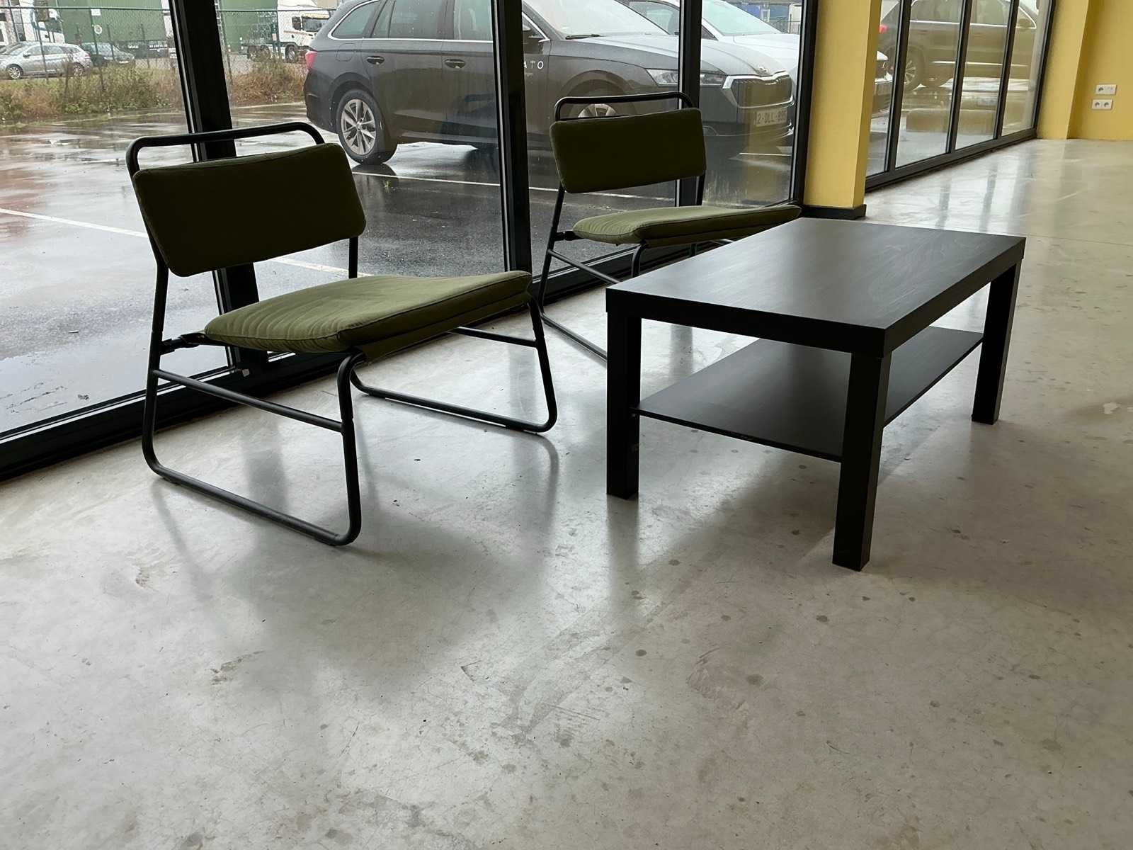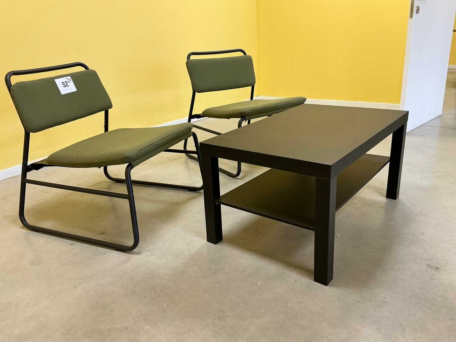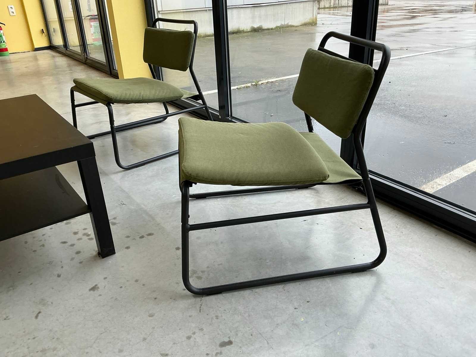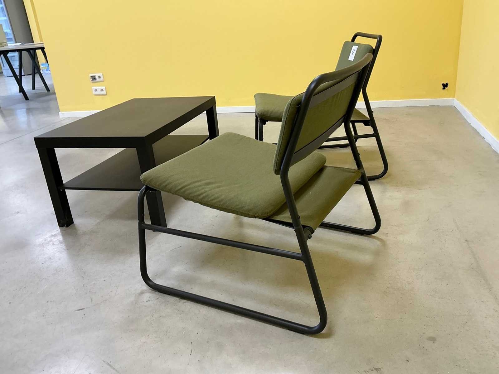 Voorzien van groen stoffen bekleding en metalen onderstel, 2 x salontafel afmeting circa 90 x 55 x 45 cm, zich bevindend op de eerste verdieping dient door de klant via de trap verwijderd te worden Nee