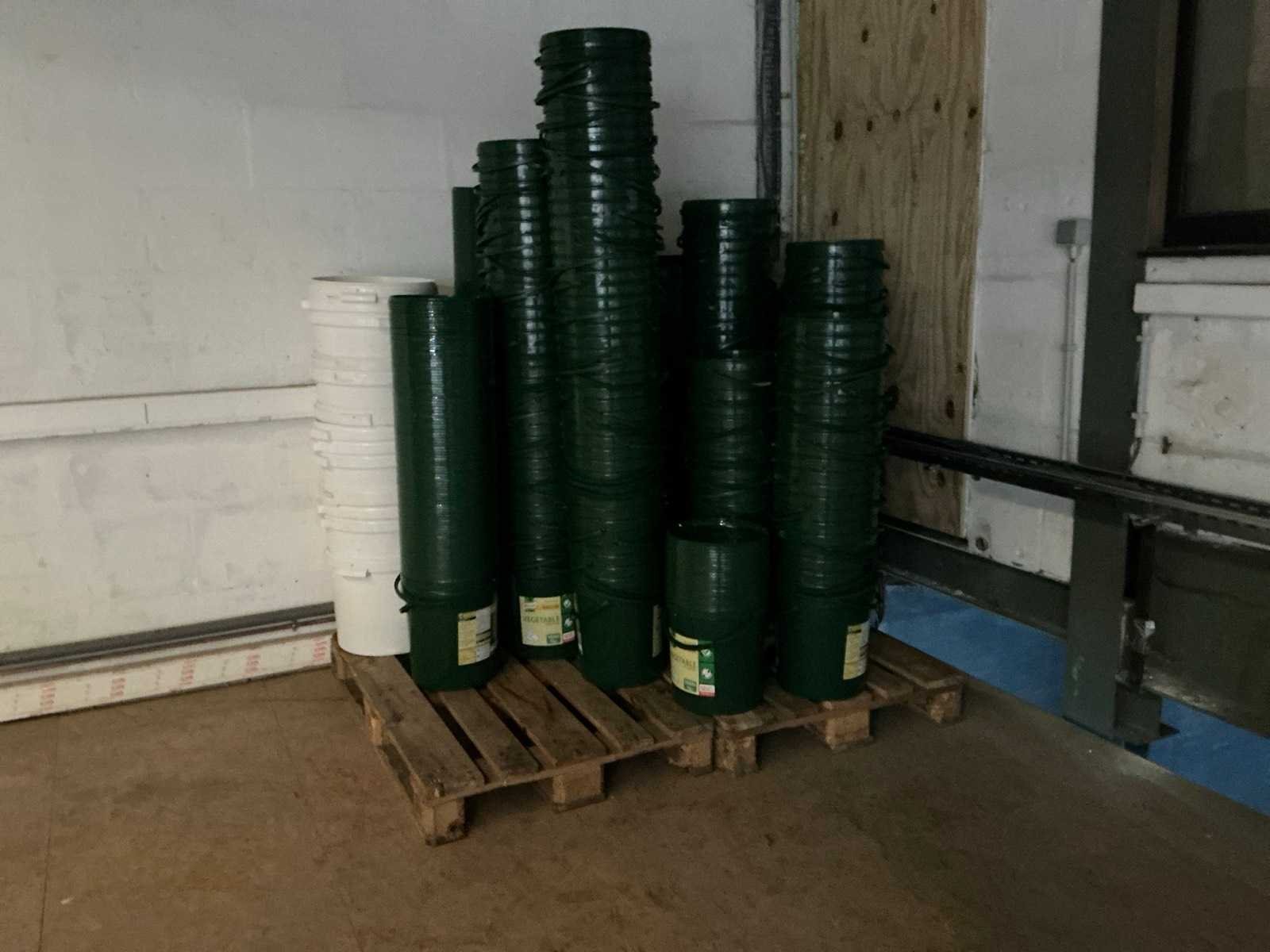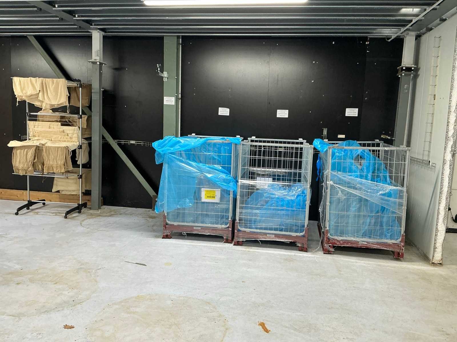 Bestaande uit 3 metalen opbergboxen afmeting circa 120 x 80 x 117 cm, inhoudende diverse kunsstoffen potjes, 2 x transporteur afmeting circa 80 x 70 x 190 cm, droogrek inhoudende jutten zakken, gedemonteerde tuintafel, kunststof palletbox, diverse kunstof opbergboxen, grote partij diverse kunstogen emmers Nee