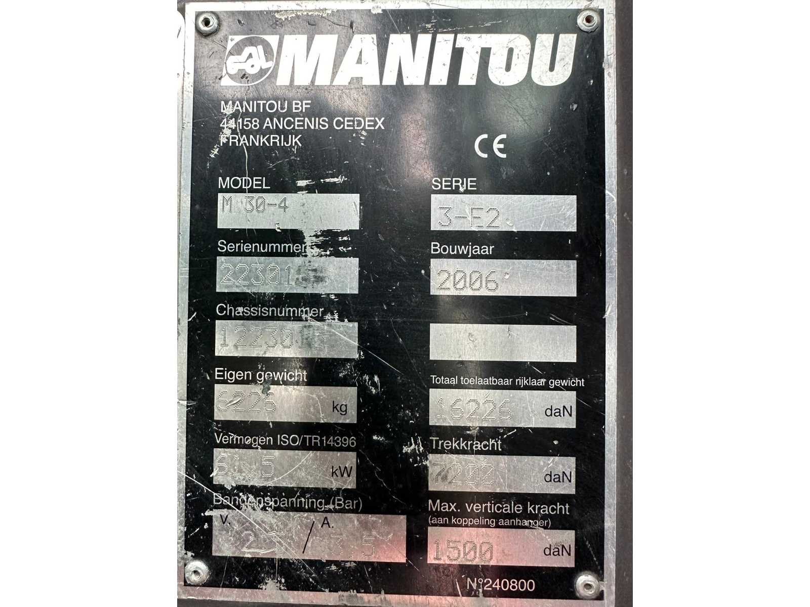 Chassis Nr 1223015 - 61,5 KW - Lagers van mast recent vervangen - geen olieverlies of olielekken Nee Merk: Manitou Type: M-30-4 Bouwjaar: 2006 Serienummer: 3-E2 Brandstof: Diesel Aantal wielen: 4 Eigen gewicht: 6226kg Hefvermogen: 3000kg Max. hefhoogte: 5500mm Luchtbanden: true Diesel: true