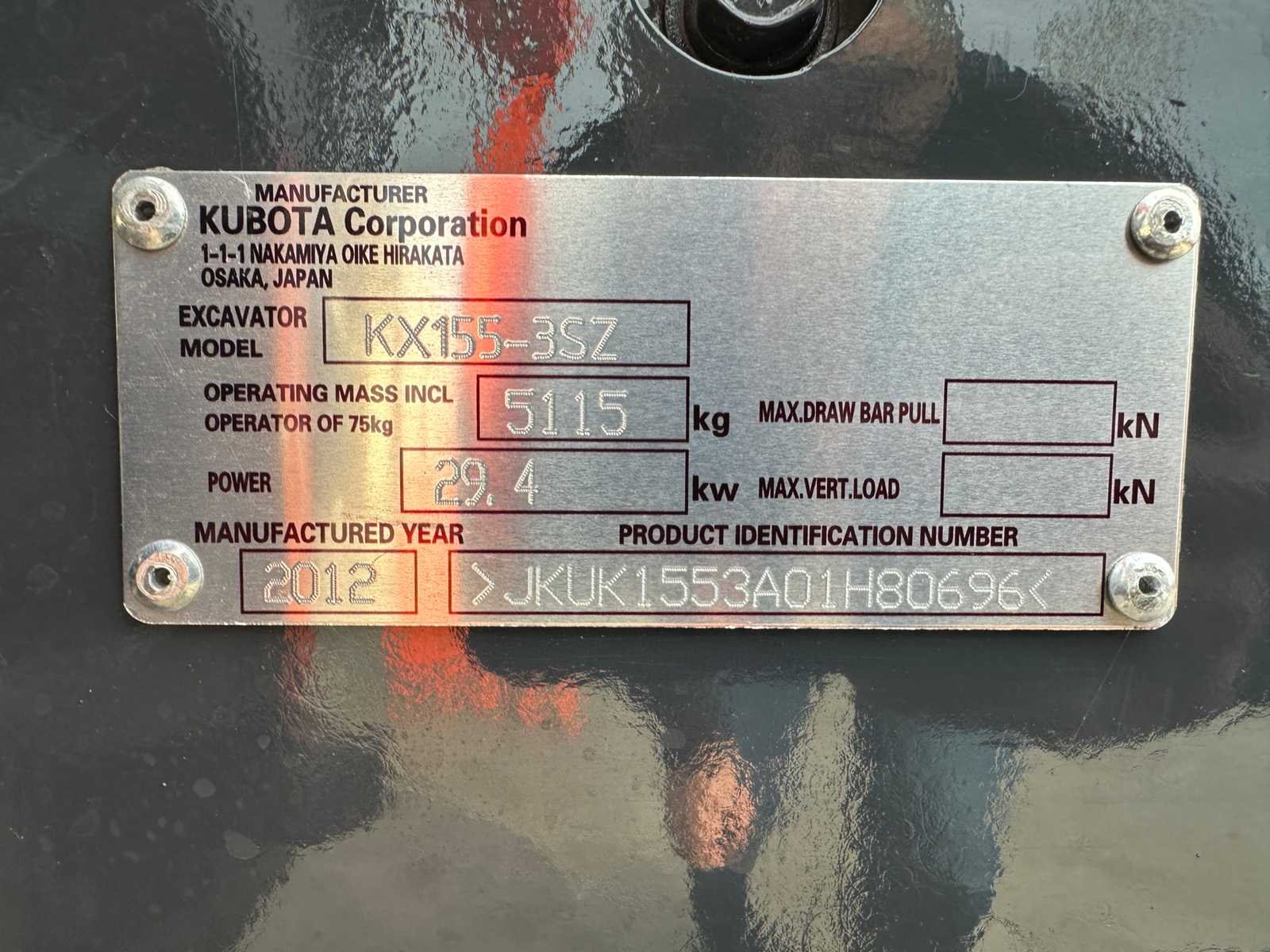 Mechanische snelwissel Duwblad Hamerleidingen Rupsen metaal met rubberpads Tandenbak Geen documenten Nee Merk: Kubota Type: KX155-3SZ Bouwjaar: 2016 Serienummer: JKUK1553A01H80696 Merk motor: Kubota V2203 Motorvermogen (kW): 29.4kW Aantal cilinders: 4 Brandstof: Diesel Graafbak afm. b: 650mm Rups breedte: 400mm Afgelezen urenstand: 2981 Eigen gewicht: 5115kg Totale afmeting L: 5500mm Totale afmeting Breedte: 2050mm Totale afmeting Hoogte: 2700mm GS Code: 84295200