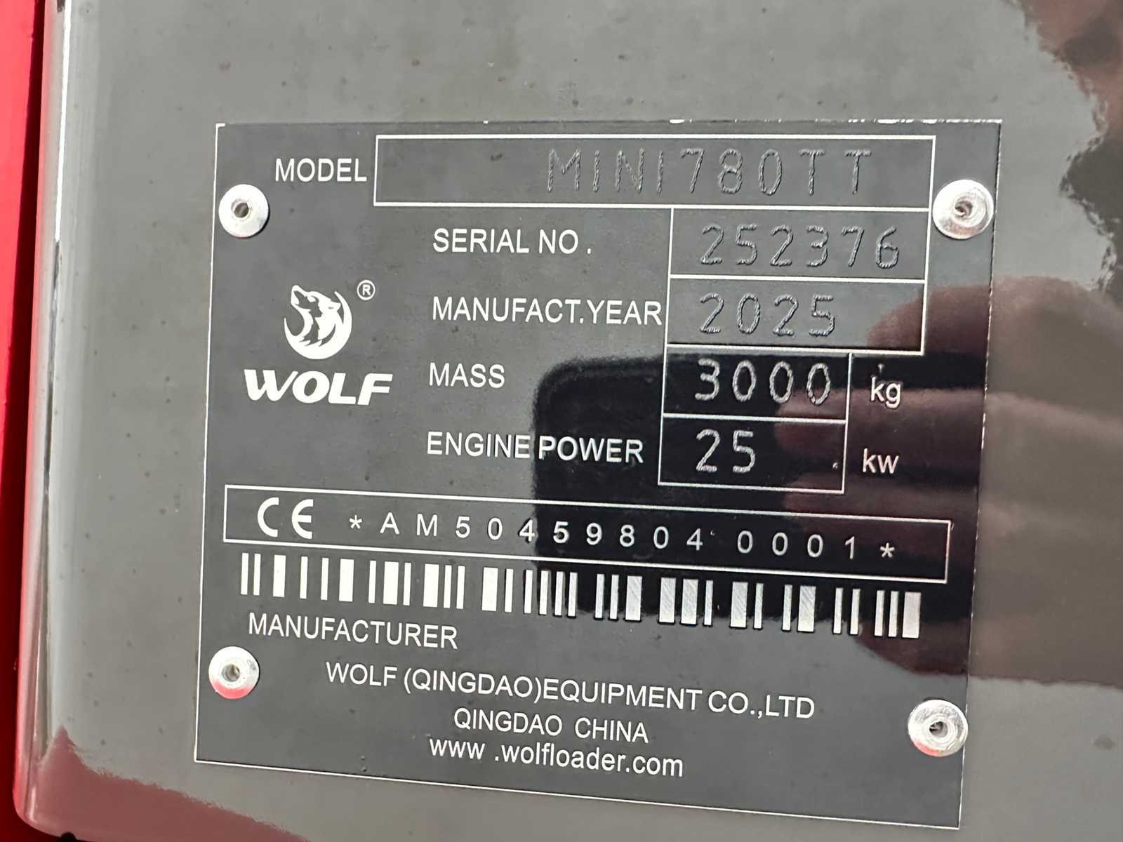Hydraulische snelwissel Vorkenbord + bak Lepels 900mm Extra hydraulische functie Achteruitrij camera Gereedschapsbox Nieuw Nee Merk: Wolf Type: MINI 780TT Bouwjaar: 2025 Serienummer: 252376 Merk motor: ChangChai Motorvermogen (kW): 25kW Aantal cilinders: 3 Brandstof: Diesel Graafbak afm. b: 1600mm Bandenmaat: 31x15.5-15 Afgelezen urenstand: 0 Eigen gewicht: 3000kg Totale afmeting L: 4827mm Totale afmeting Breedte: 1520mm Totale afmeting Hoogte: 2430mm