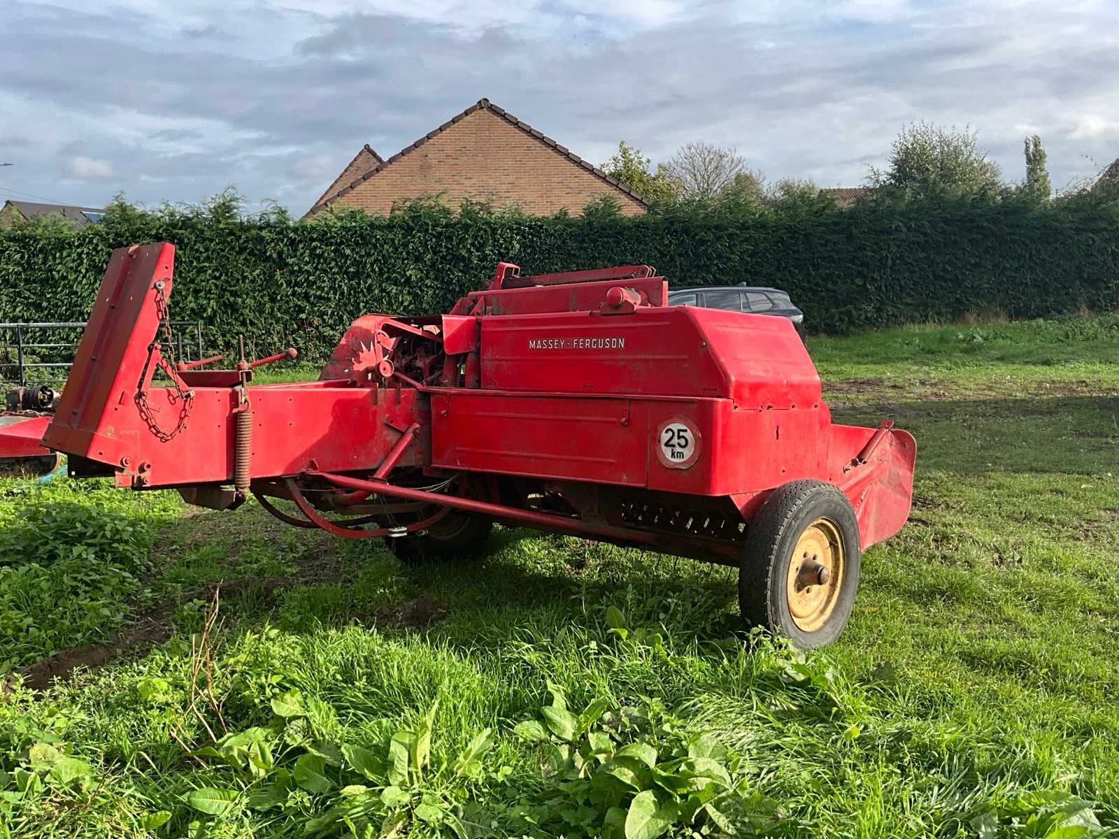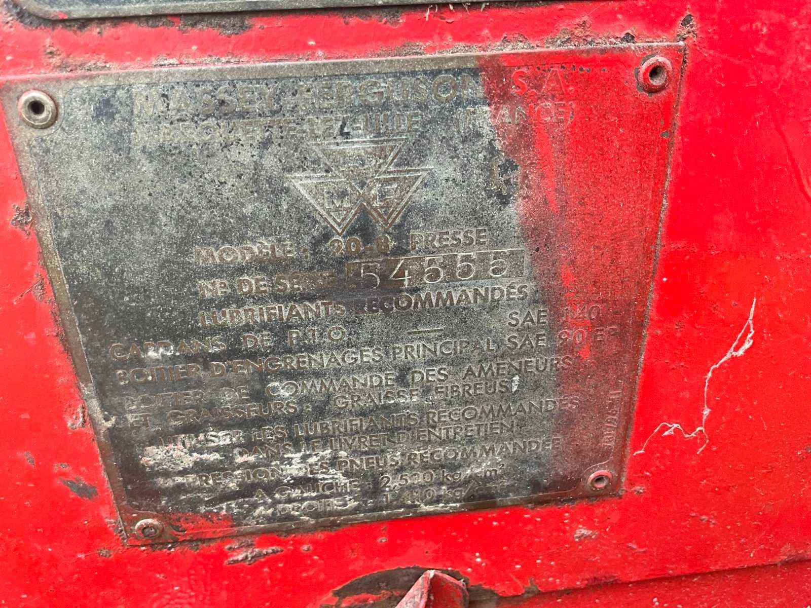 Beschrijving: Robuuste Massey Ferguson 20 vierkante hooibalenpers. Deze pers is ontworpen voor het persen van droog hooi, stro of luzerne tot compacte vierkante balen. Aangedreven via aftakas (PTO) van de tractor en voorzien van invoerarm met oppikmechanisme. Degelijk oud model, gekend om zijn betrouwbaarheid en eenvoudige bediening. ⸻ Technische specificaties: Merk: Massey Ferguson Type: 20 (Model 20 Presse) Serienummer: 54353 Aandrijving: via aftakas (PTO) PTO-aansluiting: 540 t/min Capaciteit: ca. 8–12 balen per minuut (afhankelijk van het materiaal) Bale type: rechthoekige/vierkante balen Bale-afmetingen (ongeveer): 36 × 46 × 80 cm Gewicht machine: ca. 1.200 kg Smeermiddelen volgens typeplaat: • PTO-kast: SAE 90 EP • Hoofdtransmissie: SAE 90 EP • Commandokast: SAE 140 Bandenspanning: 2,5 bar aanbevolen Oorsprong: Massey Ferguson S.A., Marquette-lez-Lille (Frankrijk) Staat: gebruikt, werkend, met zichtbare gebruikssporen Nee Merk: Massey Ferguson Type: 20