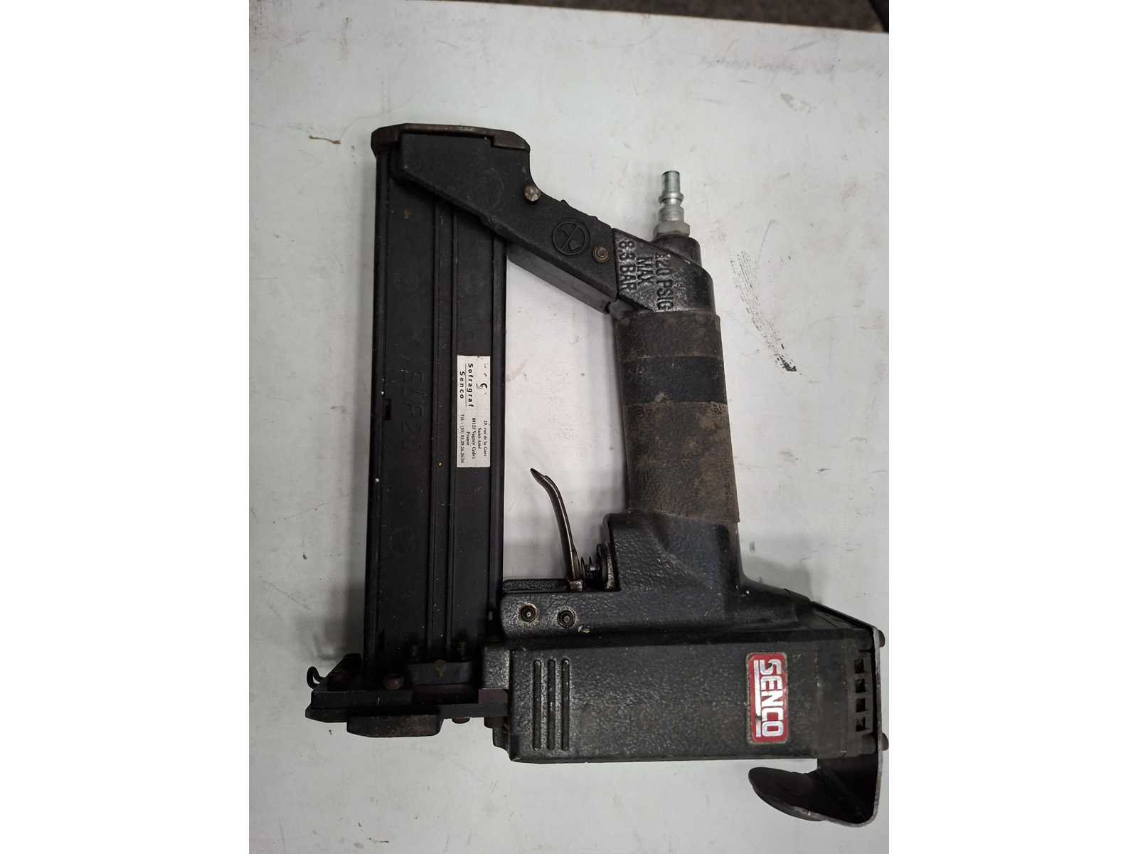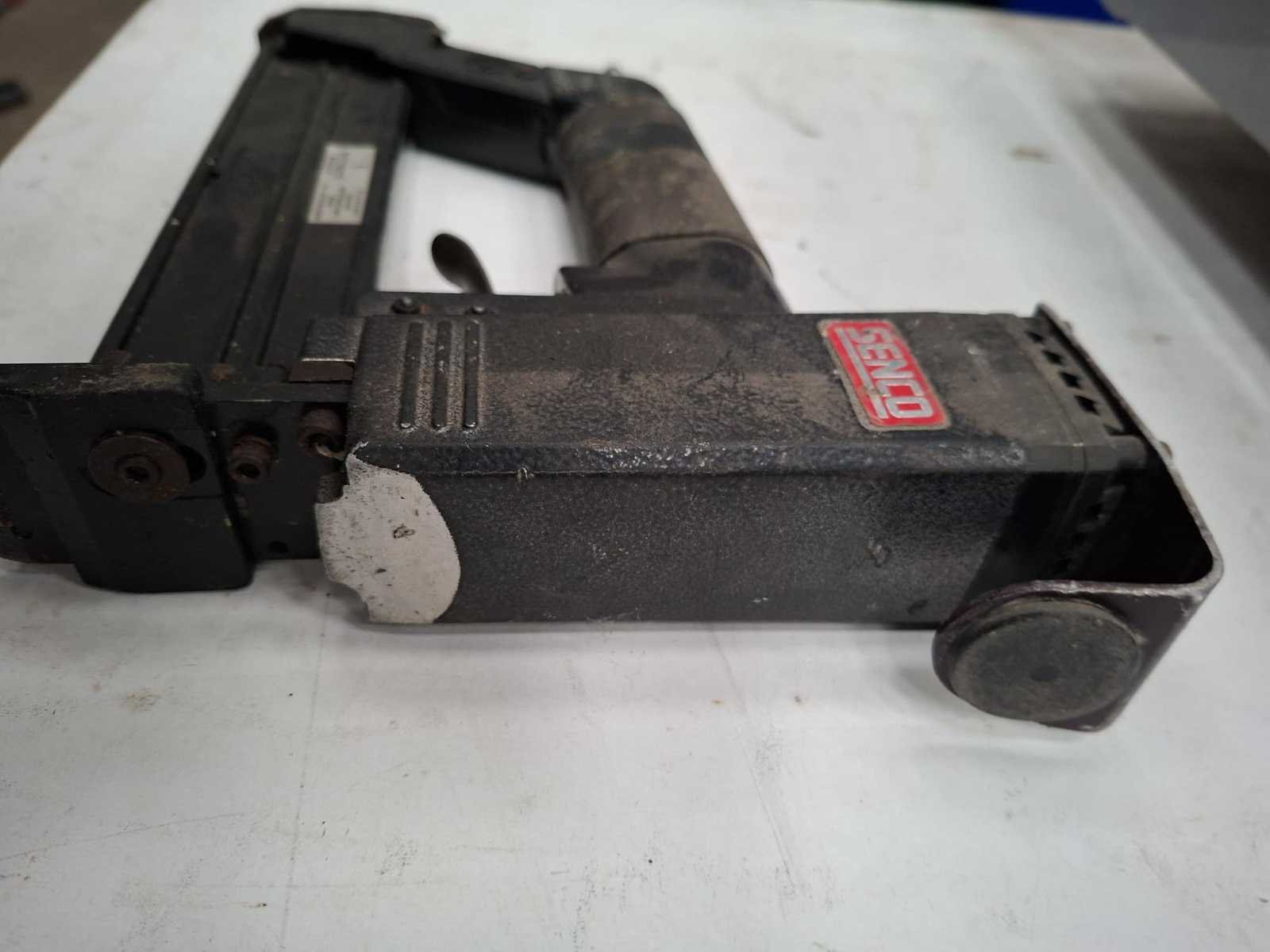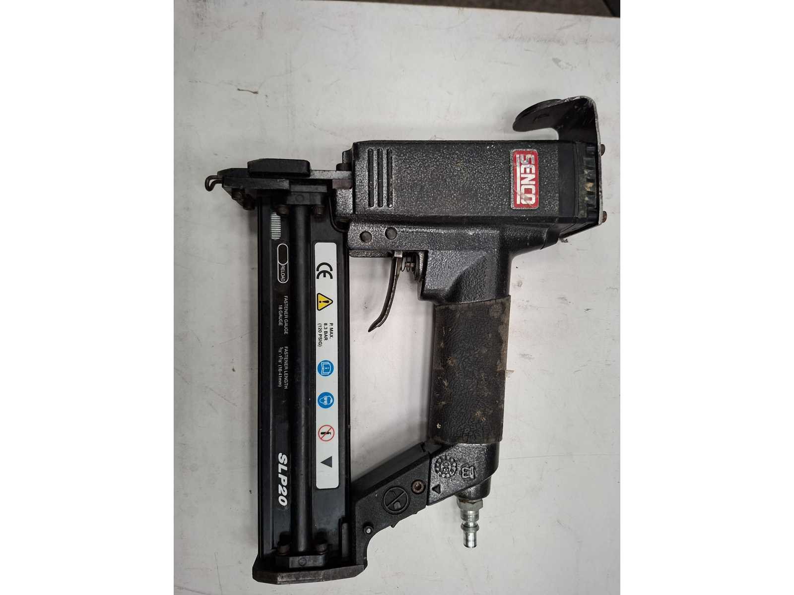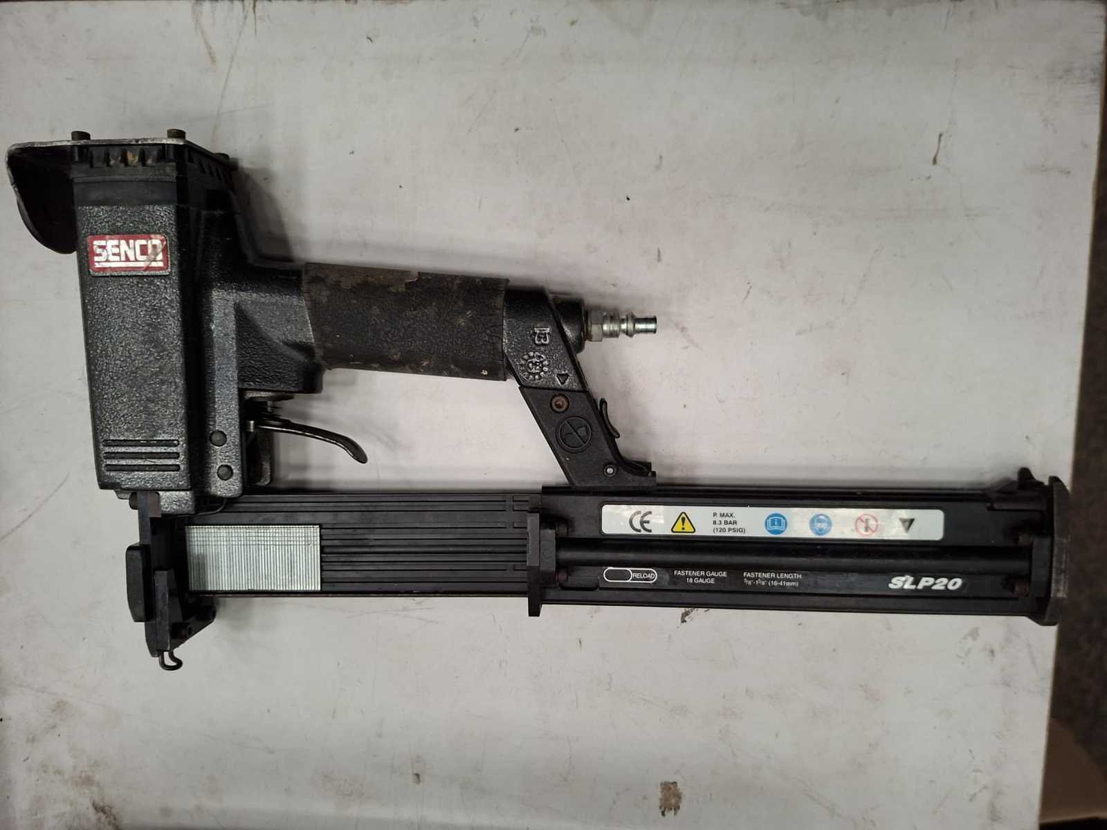 SENCO SLP20 mini brads pneumatische spijkermachine SENCO SLP20 pneumatische spijkermachine voor mini-spijkers, geschikt voor onzichtbaar spijkerwerk. Geschikt voor de installatie van geglazuurde latten (glazuurkralen), lijsten en houtafwerkingen. Merk: SENCO Model: SLP20 Type: mini brads pneumatische spijkermachine Kaliber: 18 gauge Spijkerlengte: ca. 16 – 41 mm Maximale druk: 8,3 bar (120 PSI) Gebruikte staat met zichtbare sporen van slijtage. Operatie niet getest. Verkocht zoals het is, zoals te zien is op de foto's. Non Merk: Senco Type: Cloueur pneumatique mini brads