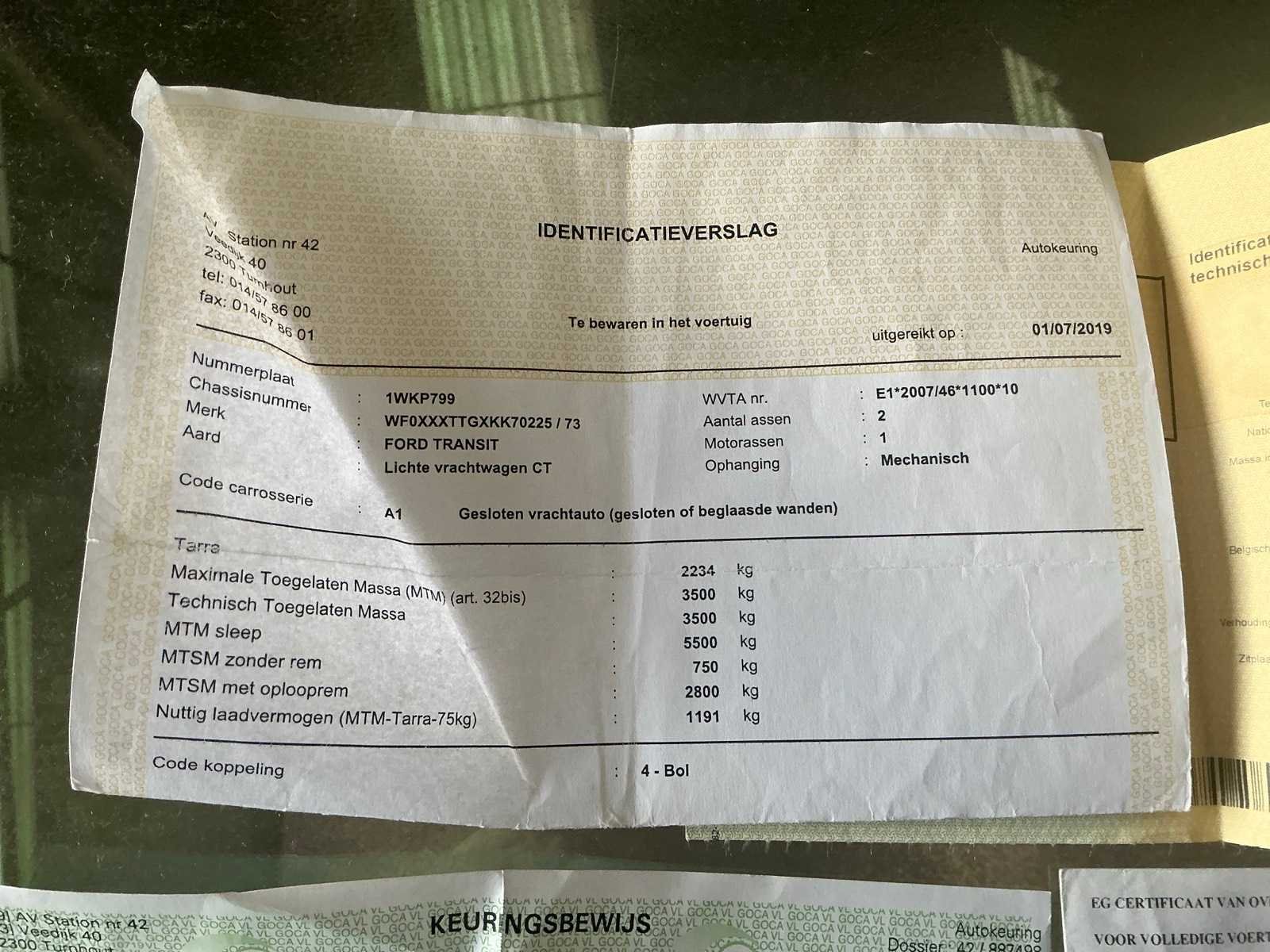 Nee Merk: Ford Model: Transit Bouwjaar: 2019 Afgelezen kilometerstand: 106063km Cilinderinhoud: 1995cc Vermogen (kW): 96kW Brandstof: diesel Chassisnummer: WF0EXXXTTGXKK70225 Datum eerste toelating: 26/06/2019 Transmissie: Handgeschakeld Emissieklasse: Euro 6b Aantal sleutels: 1 Nationaliteit documenten: België Gelijkvormigheidsattest aanwezig: true Start en rijdt: Ja, mits opstarten batterij (plat) Keuringsrapport geldig tot: 01/07/2025 Andere boorddocumenten: ID verslag Vavato voert geen technische keuring uit.: true Inschrijvingsbewijs - deel 1 : Aanwezig Inschrijvingsbewijs - deel 2: Niet aanwezig
