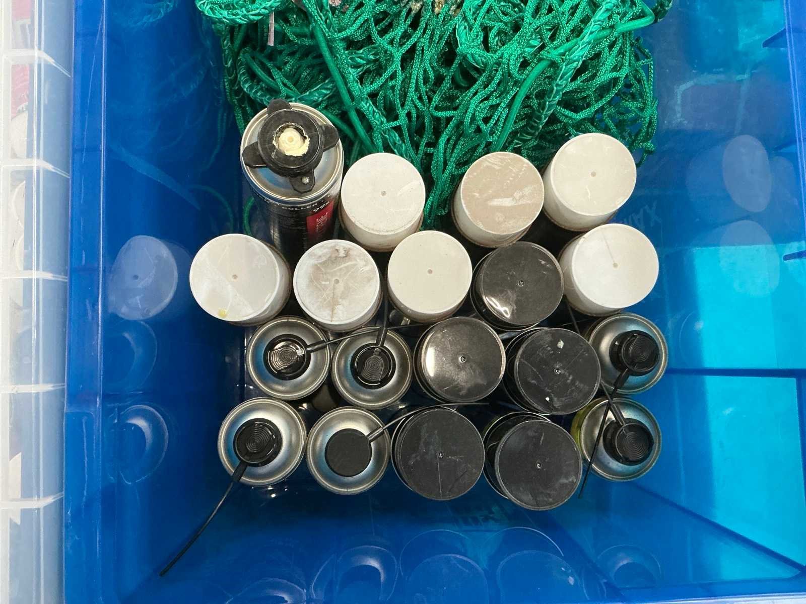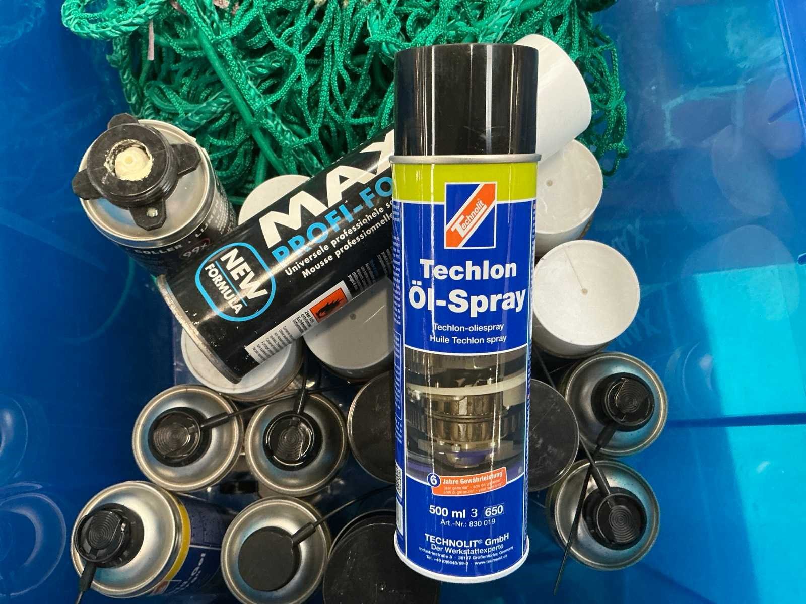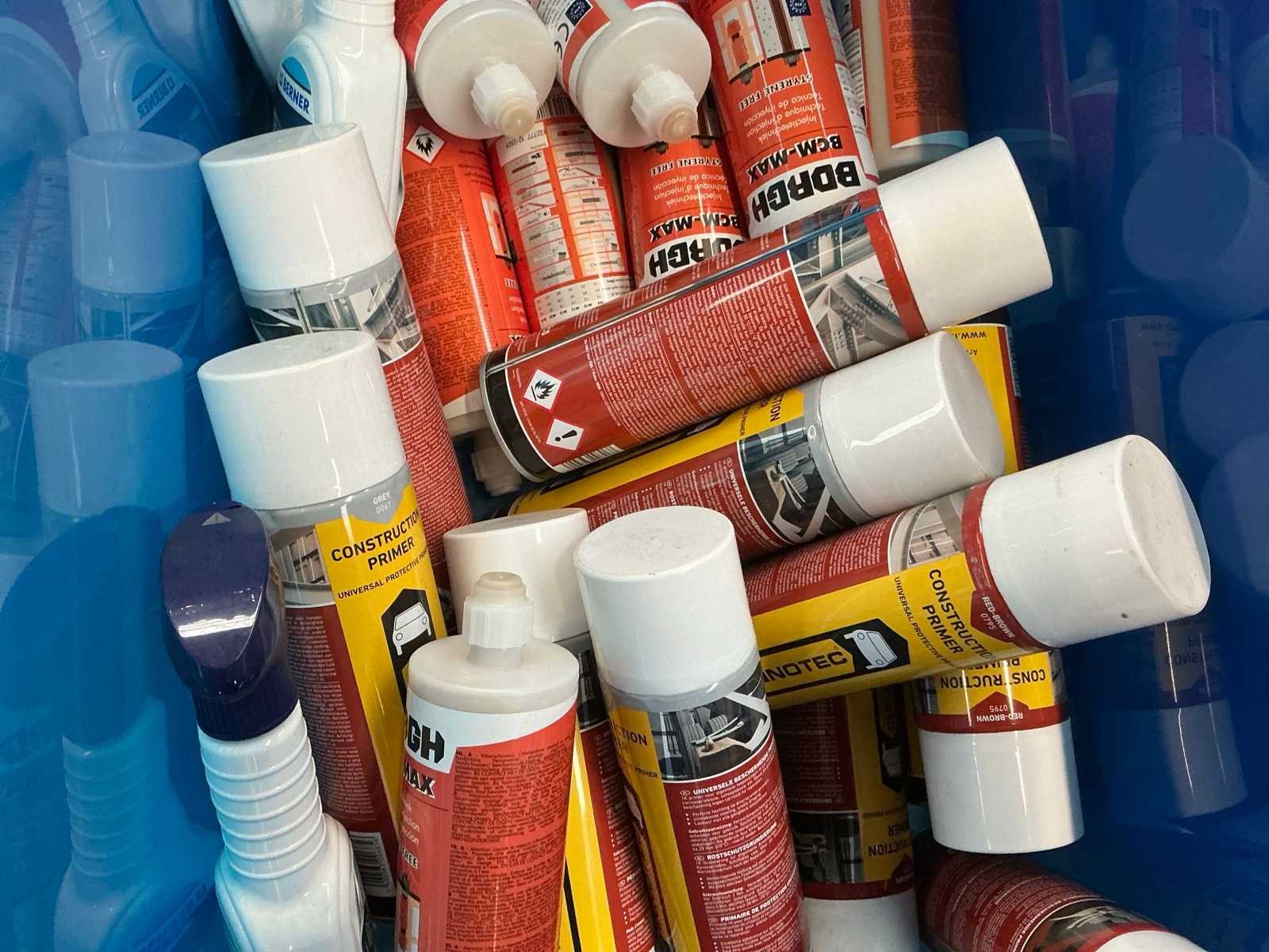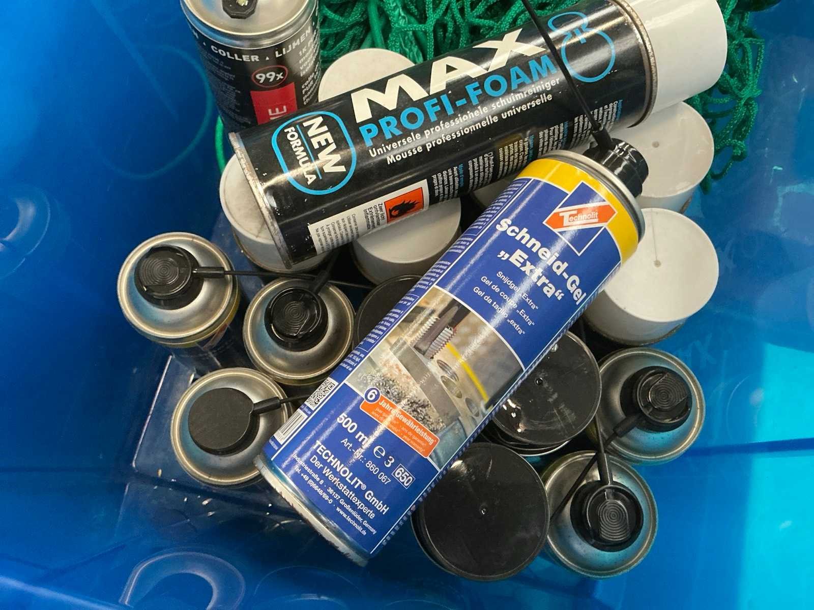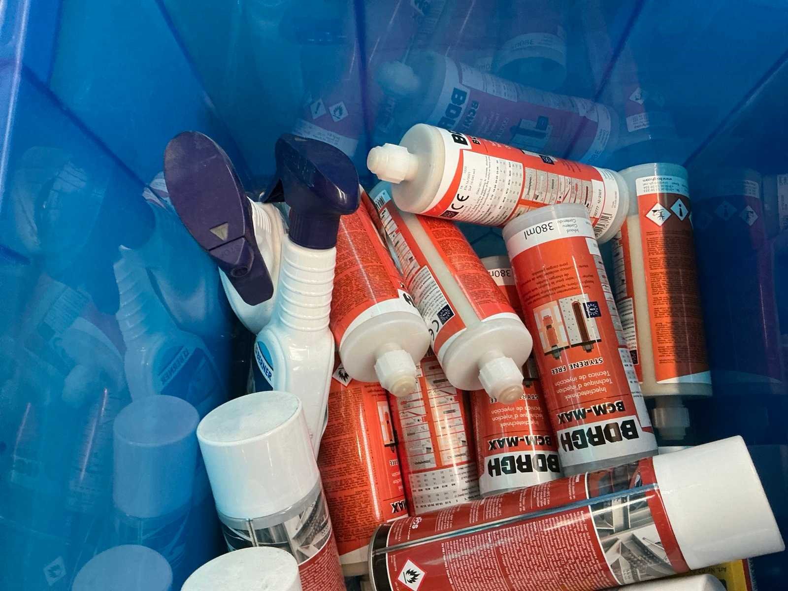Waaronder specialreiniger, ontvetters, primers, vinylestermortel, glasreiniger, schuimreiniger, oliespray, snijdgel. Liggende in 5x opbergbak, compleet met bekers. Nee