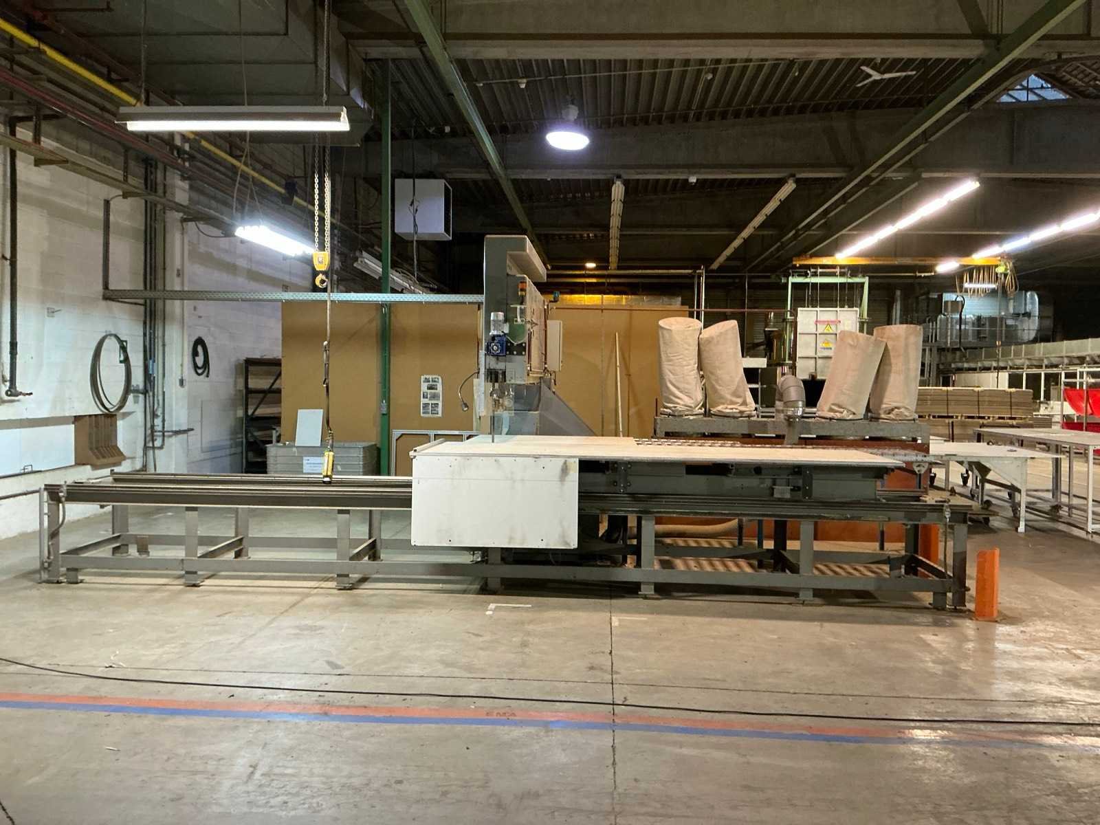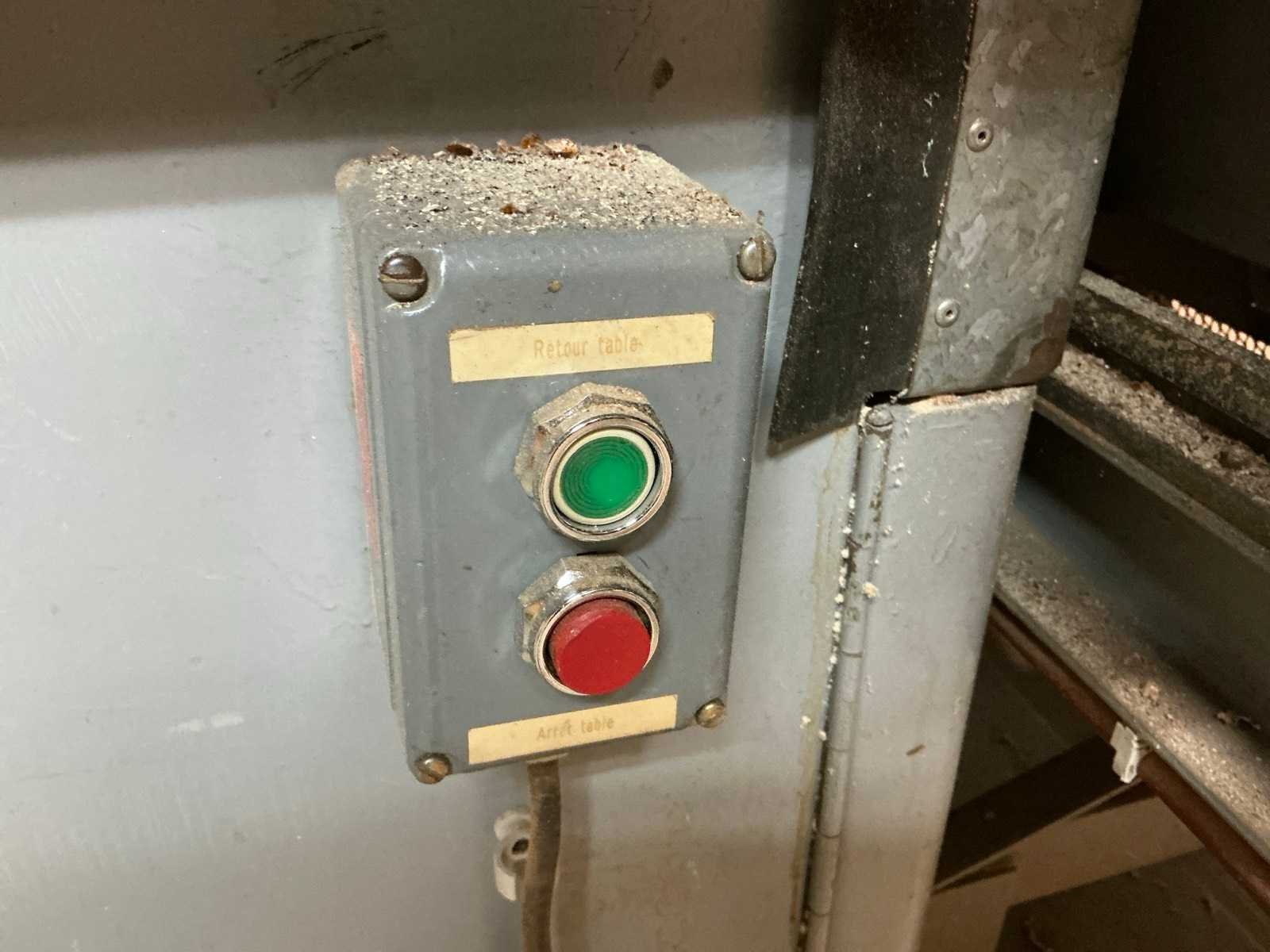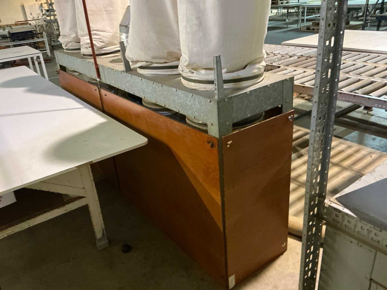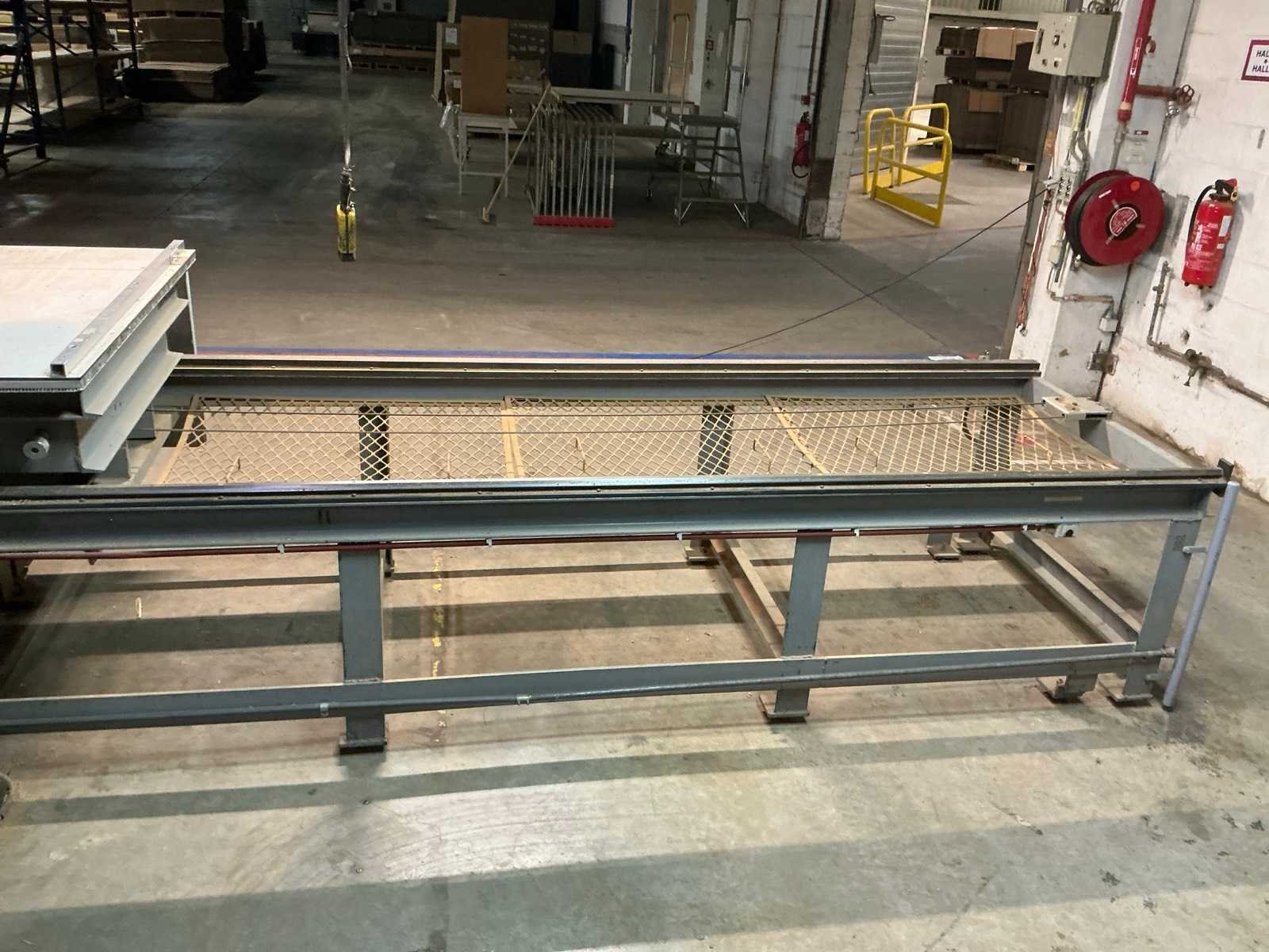 Aanvoertafel op rail 3800x1300 mm; raillengte 7300 mm; aanvoerrollenbaan 2650 mm; max. Zaaghoogte 550 mm; met stofafzuiging v.v. 4 stofzakken No Merk: AMBITECH Type: SS-4A-15 Serienummer: 10415-0351 Uitlading: 1500mm Tafel afmeting l: 1630mm Tafel afmeting b: 1240mm Aansluiting: 400V Afmeting l: 7300mm Afmeting b: 4300mm Afmeting h: 3050mm