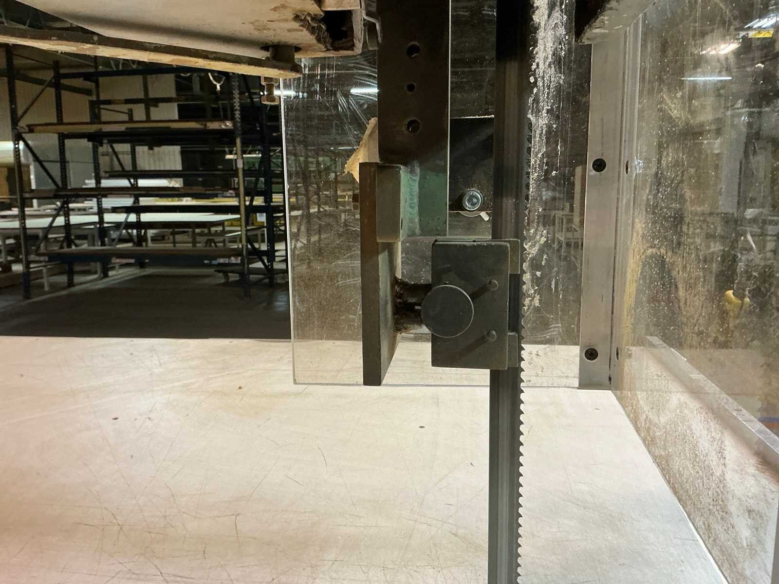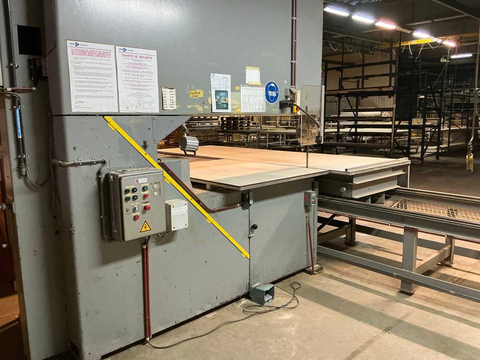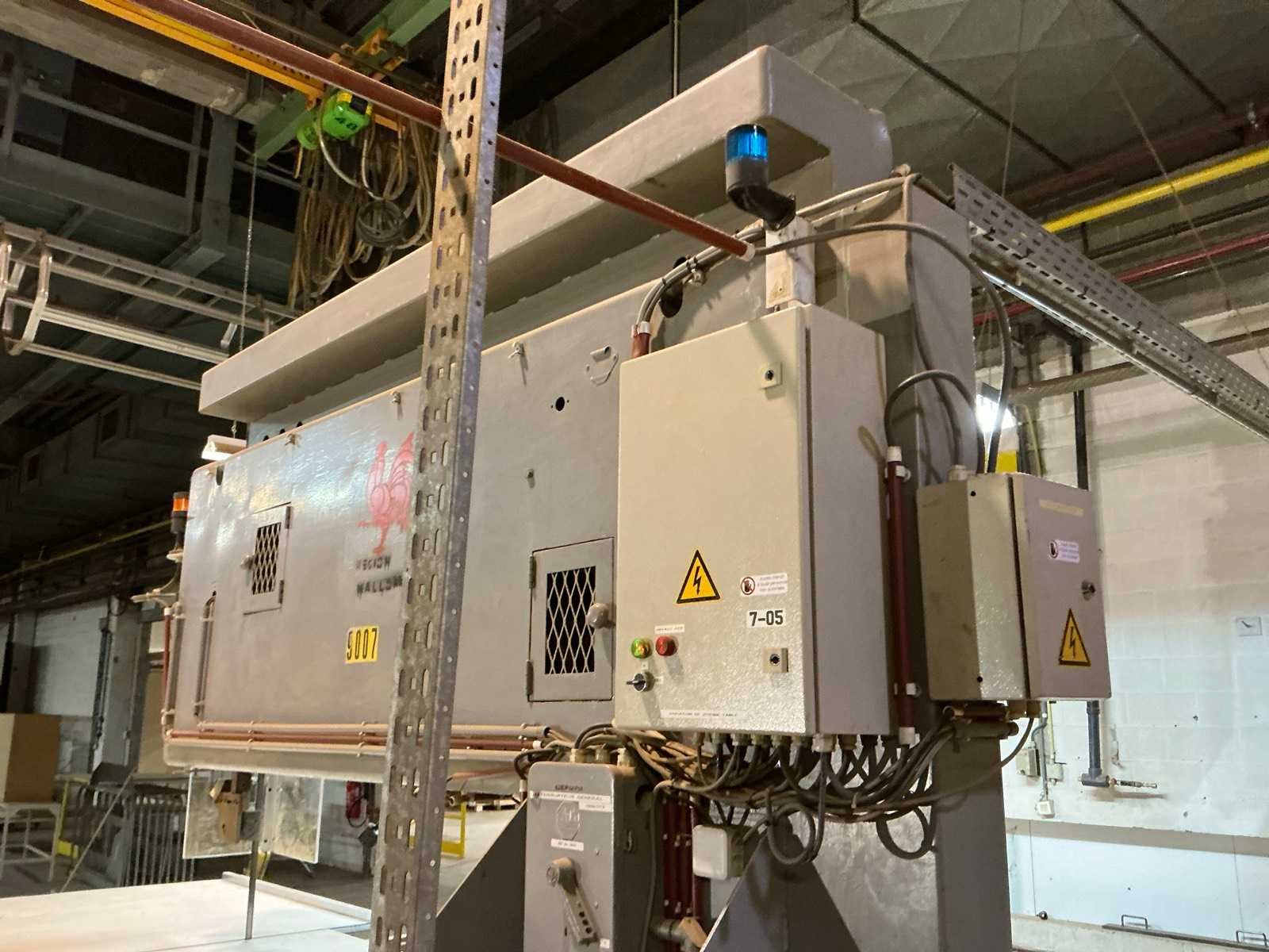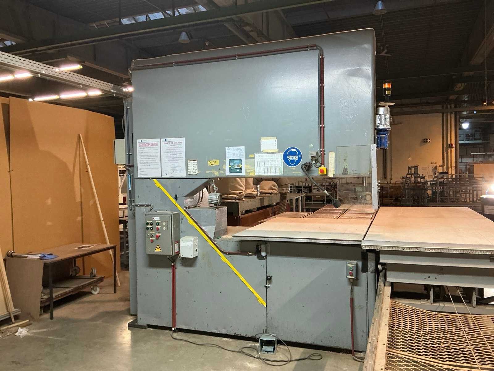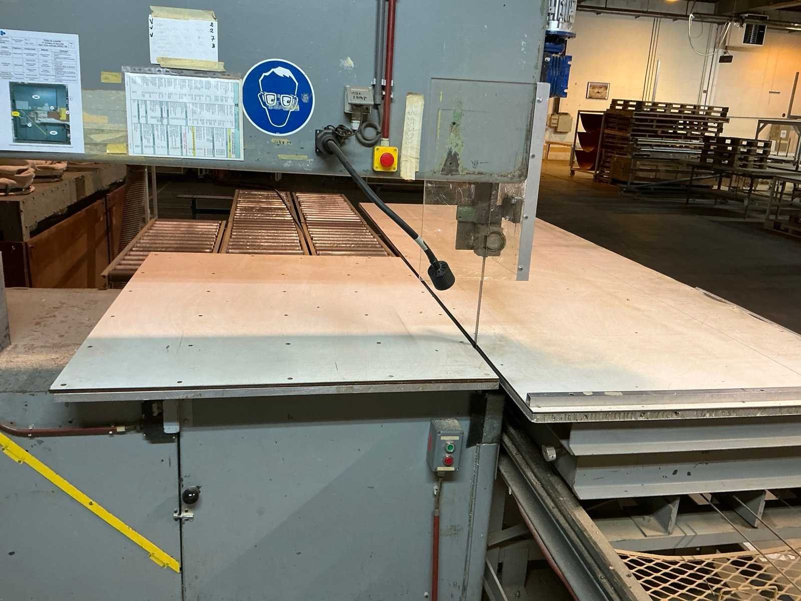 Aanvoertafel op rail 3800x1300 mm; raillengte 7300 mm; aanvoerrollenbaan 2650 mm; max. Zaaghoogte 550 mm; met stofafzuiging v.v. 4 stofzakken No Merk: AMBITECH Type: SS-4A-15 Serienummer: 10415-0351 Uitlading: 1500mm Tafel afmeting l: 1630mm Tafel afmeting b: 1240mm Aansluiting: 400V Afmeting l: 7300mm Afmeting b: 4300mm Afmeting h: 3050mm
