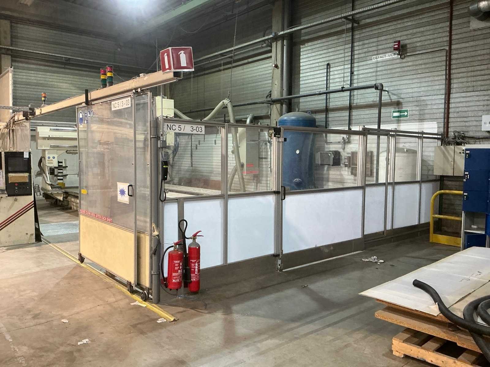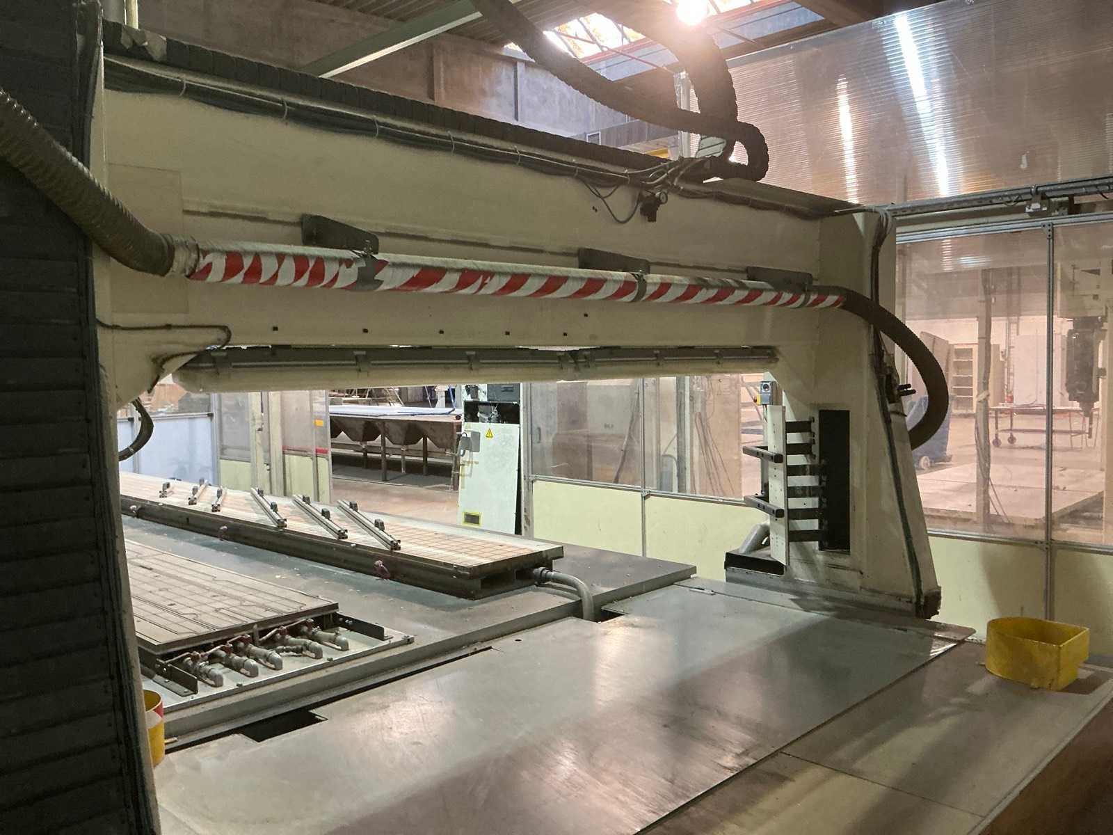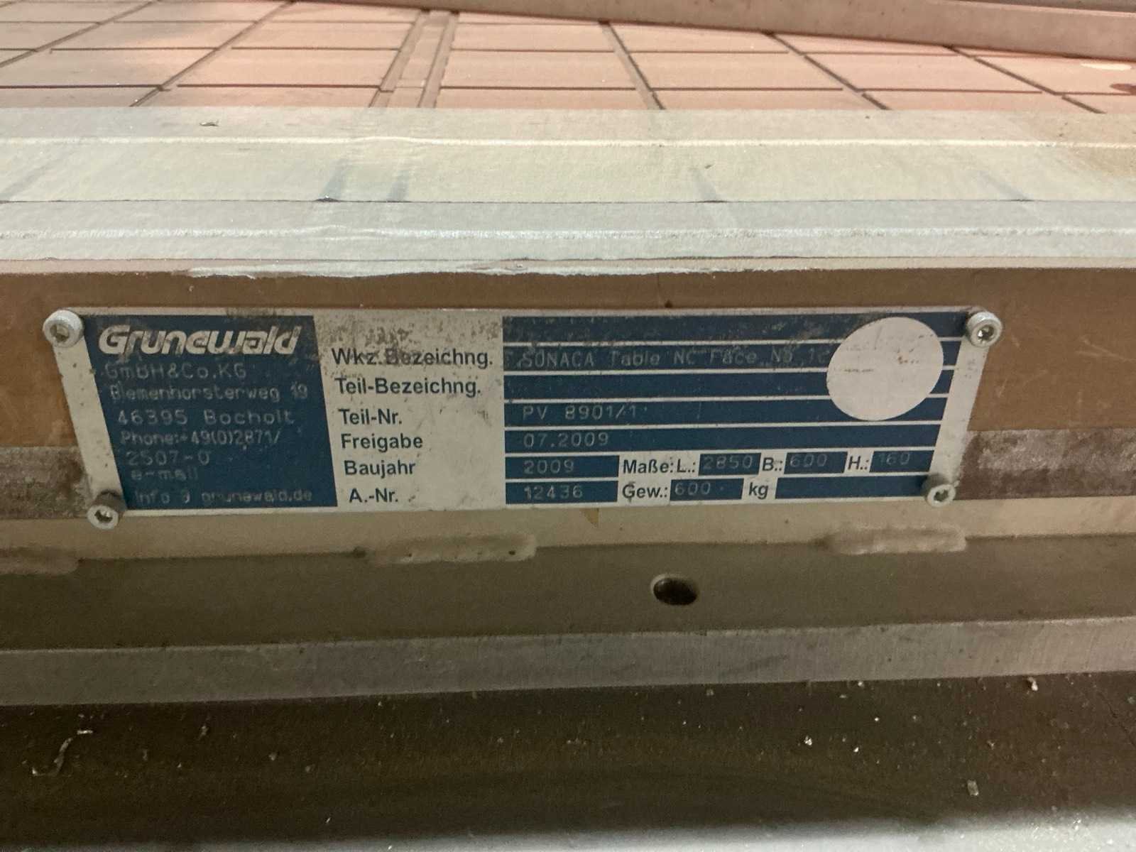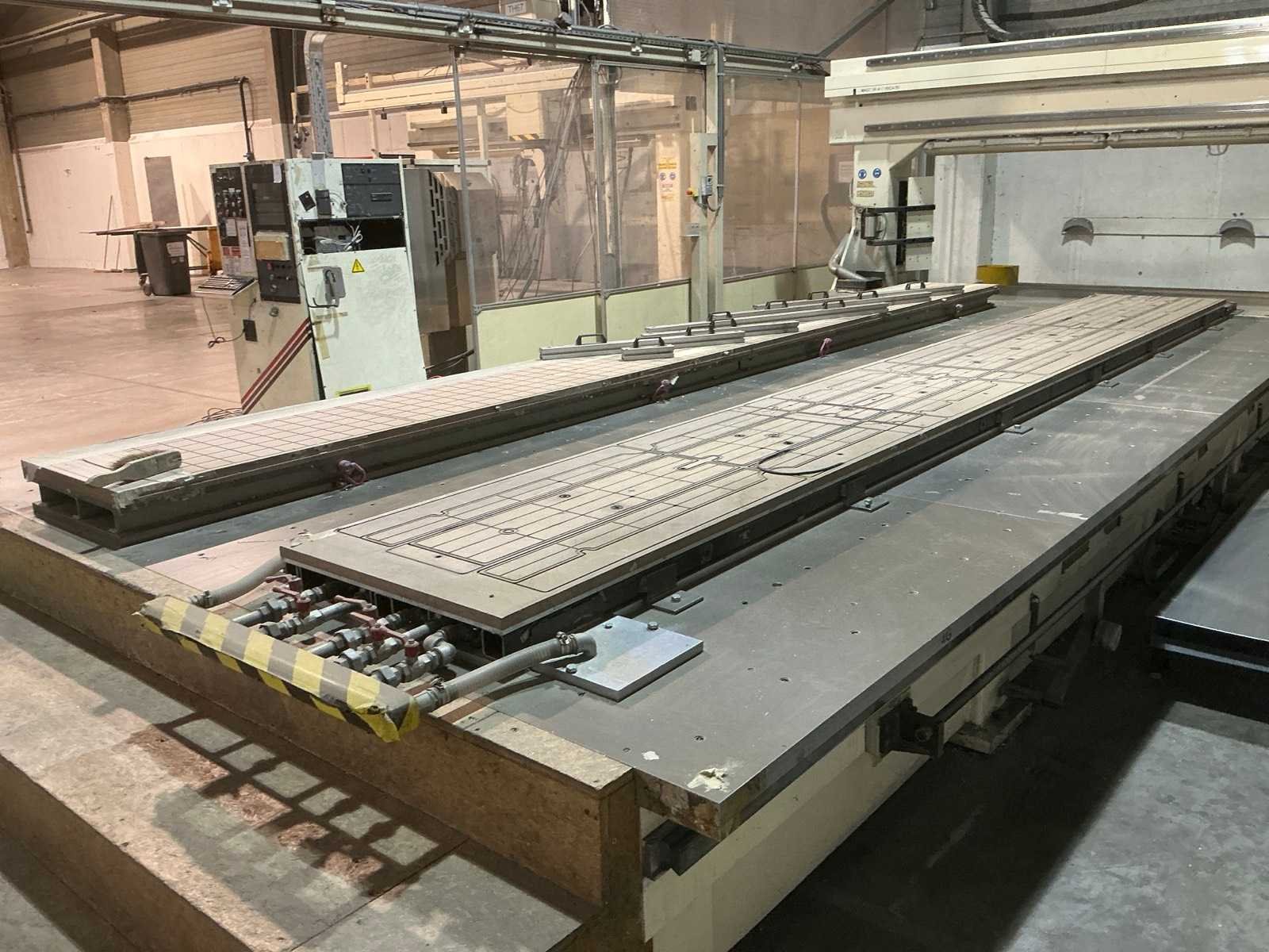 Tafel voorzien van 2x ‘Grunewald’ Sonaca vacuümtafel; 5700x600 mm; No Verplaatsing x-as: 3050mm Verplaatsing y-as: 6000mm Verplaatsing z-as: 550mm Tafel afmeting l: 6100mm Tafel afmeting b: 3050mm Aansluiting: 400V Totale afmeting L: 8200mm Totale afmeting Breedte: 4100mm Totale afmeting Hoogte: 3500mm