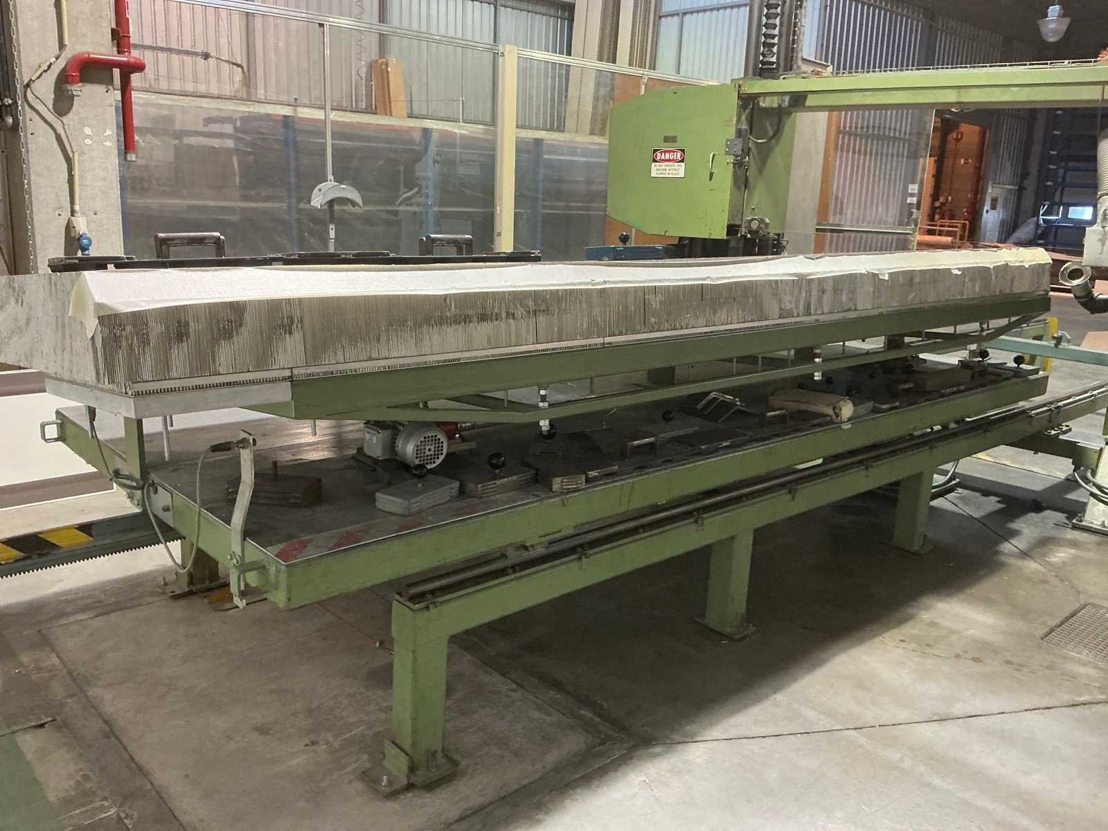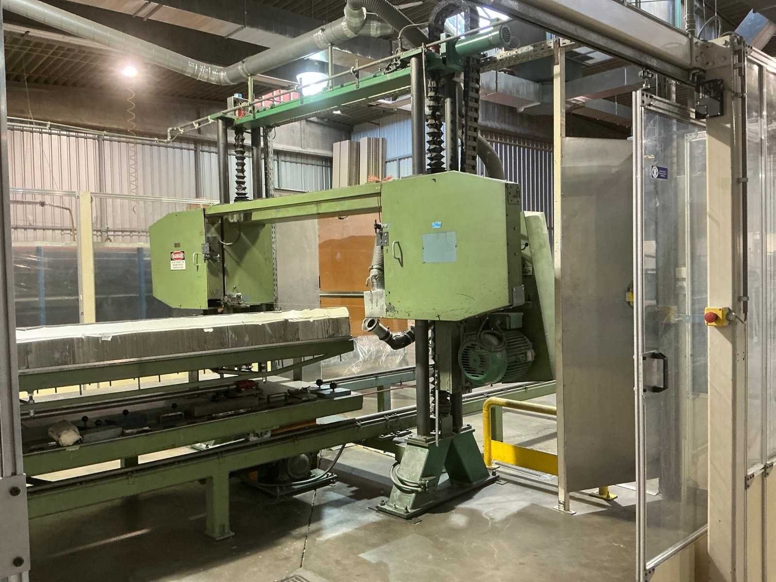 Hoogte boven zaagblad 650 mm; maximale zaagbreedte 1700; zaagblad lengte 20 ft 5 in.; werktafel op rail 3950x1000 mm; met in graden verstelbare opbouw; raillengte 7500 mm; motorvermogen 2x 11 kW; No Merk: Femco Aansluiting: 400V Afmeting l: 8000mm Afmeting b: 3800mm Afmeting h: 3100mm