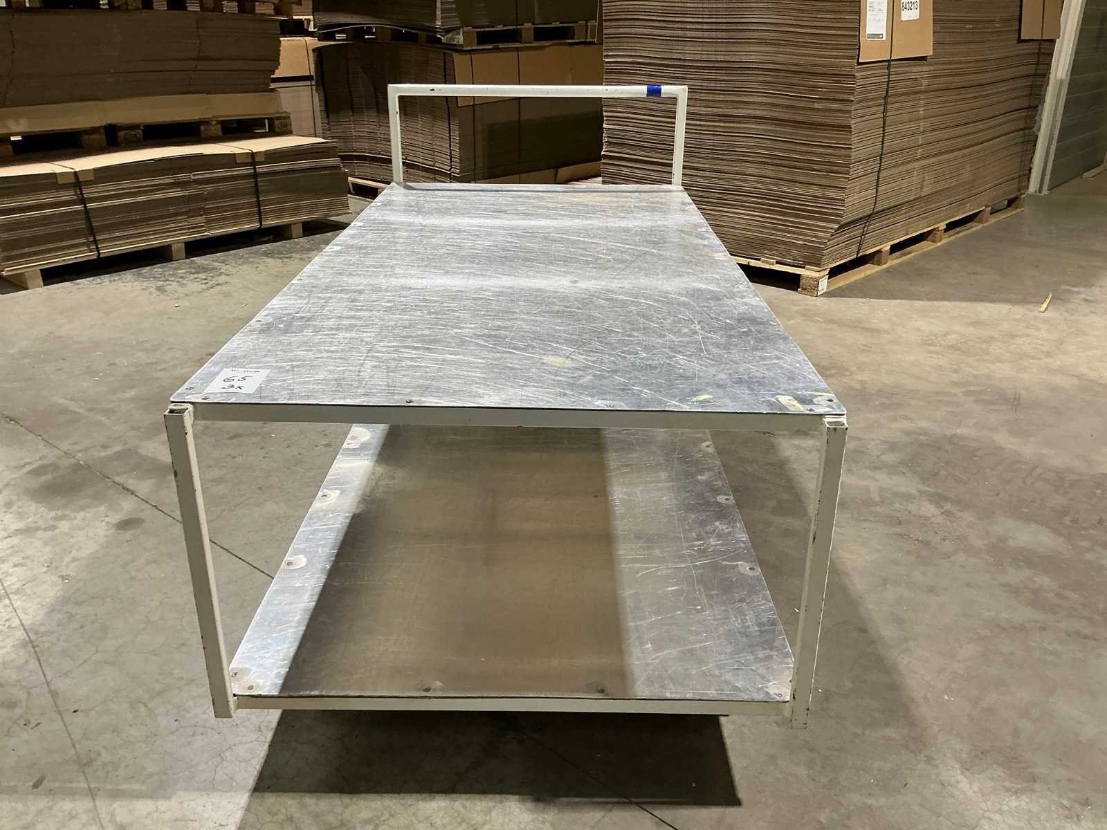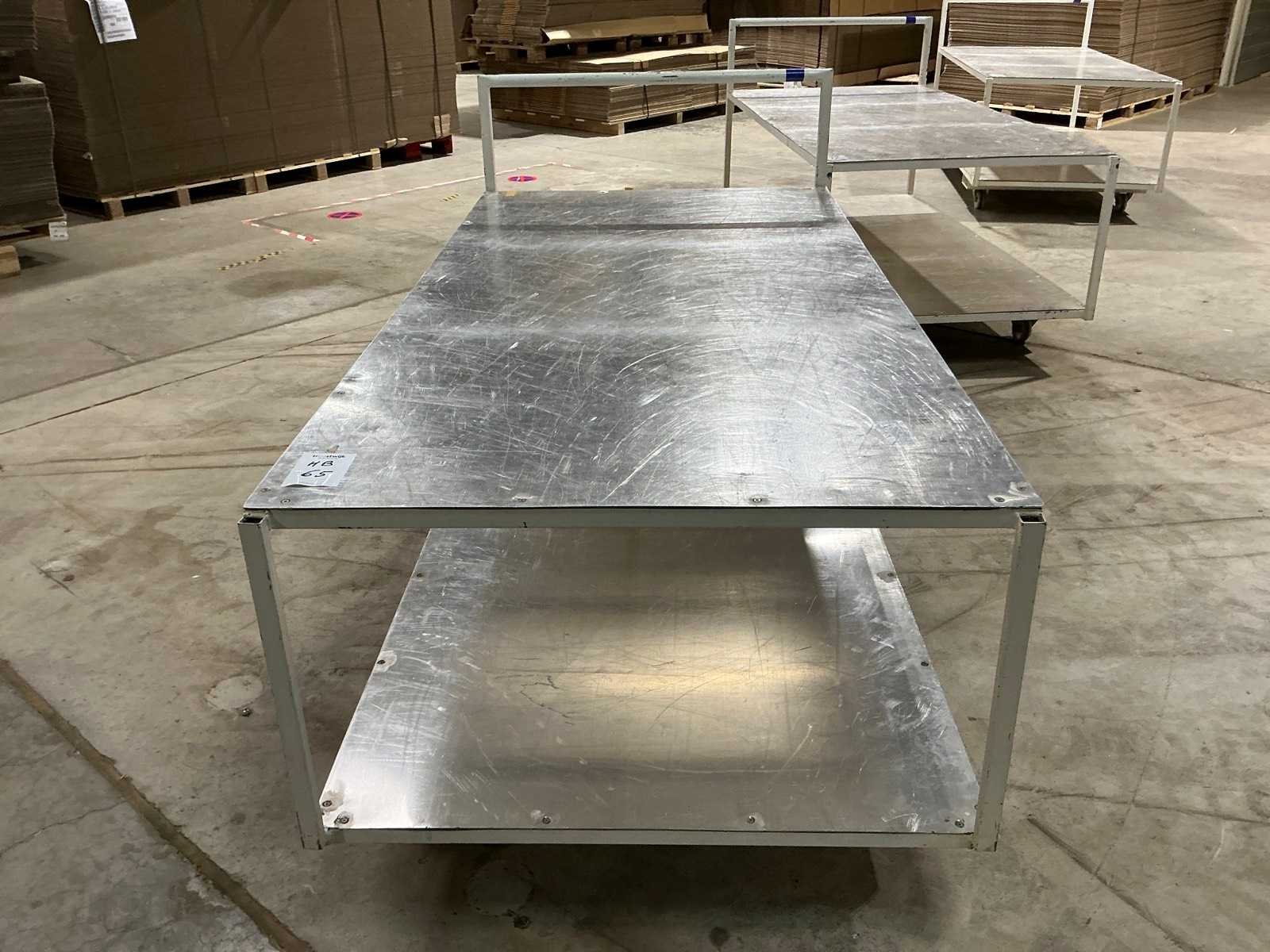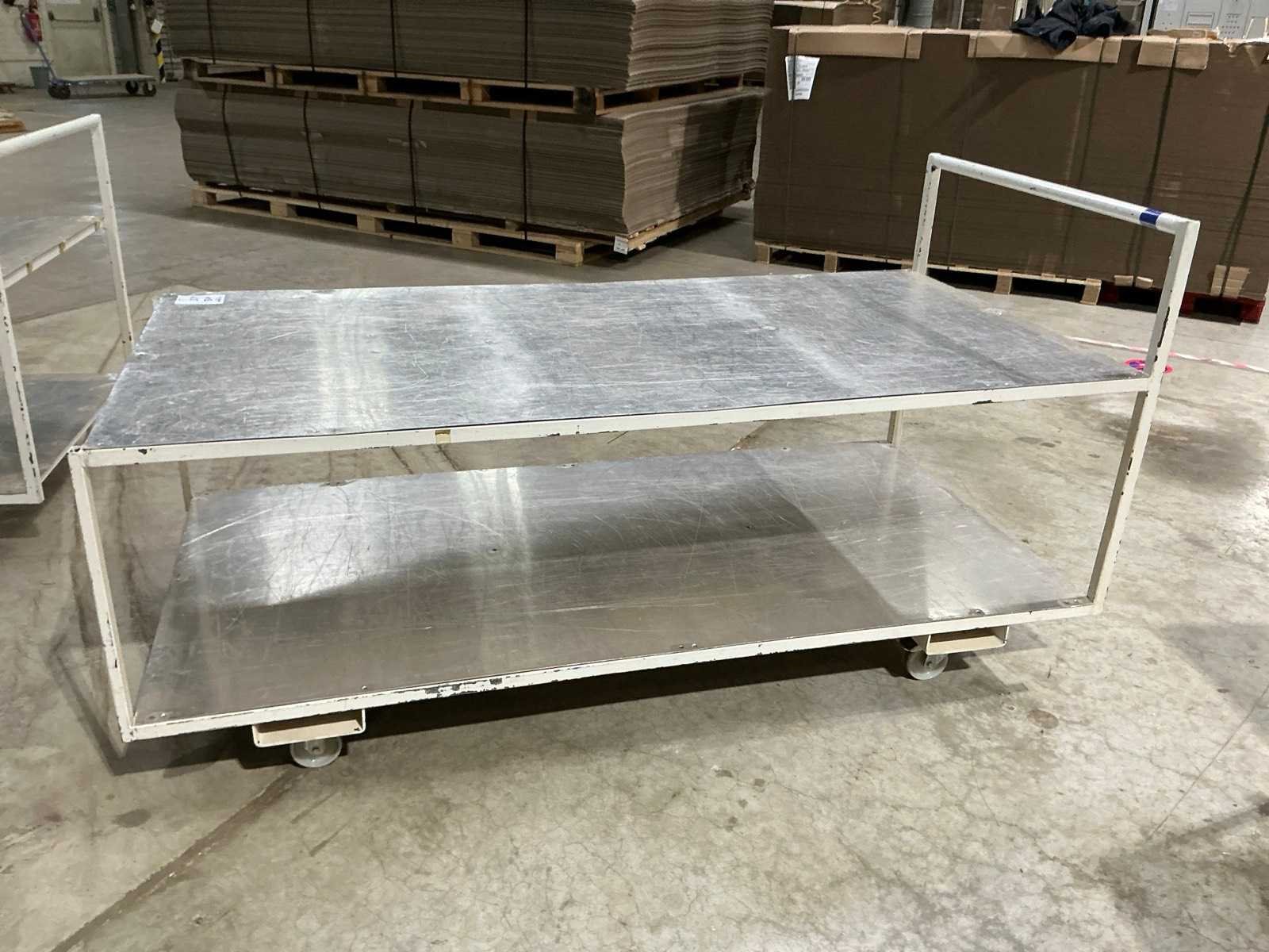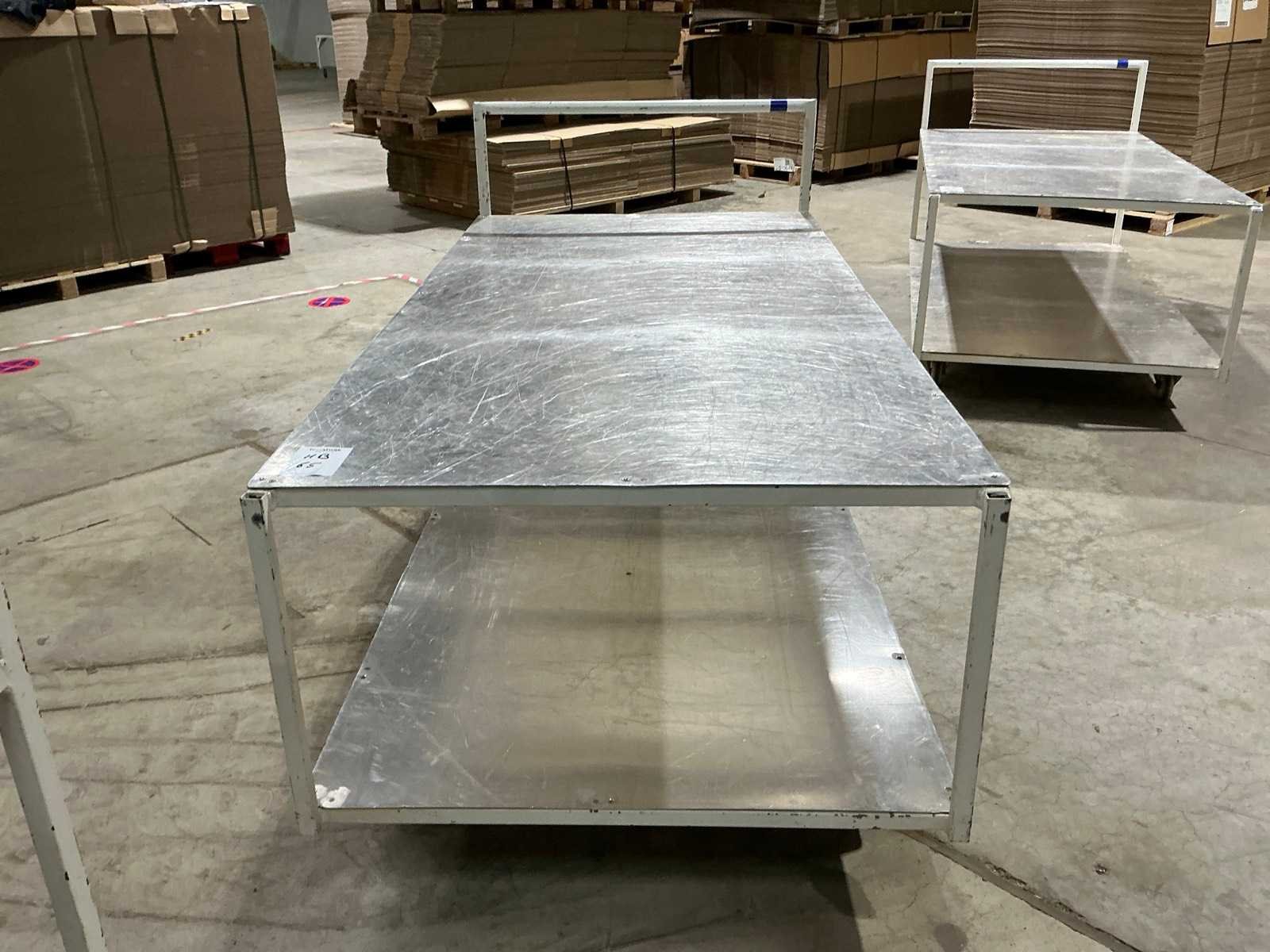 Plateauhoogte = 21 en 74cm; voorzien van 2 vaste wielen en 2 zwenkwielen met rem; uit metaal No Totale afmeting L: 2060mm Totale afmeting Breedte: 1000mm Totale afmeting Hoogte: 1070mm