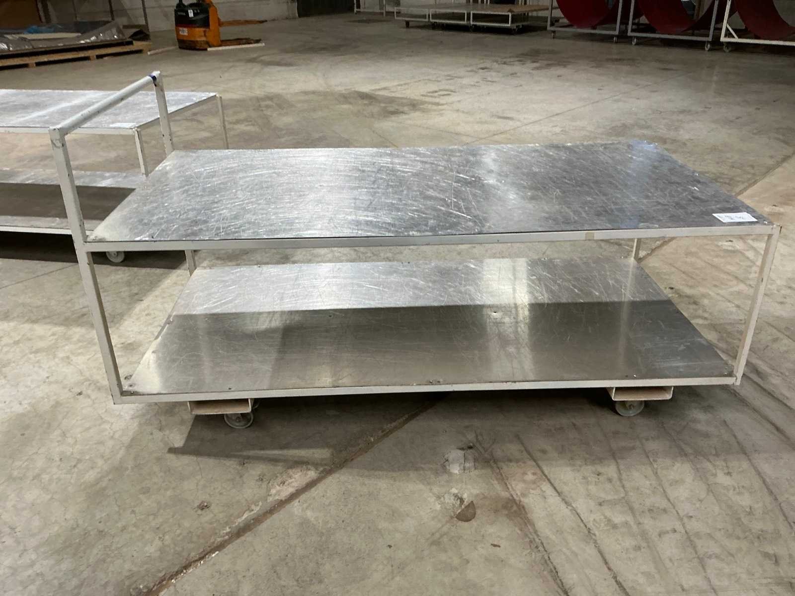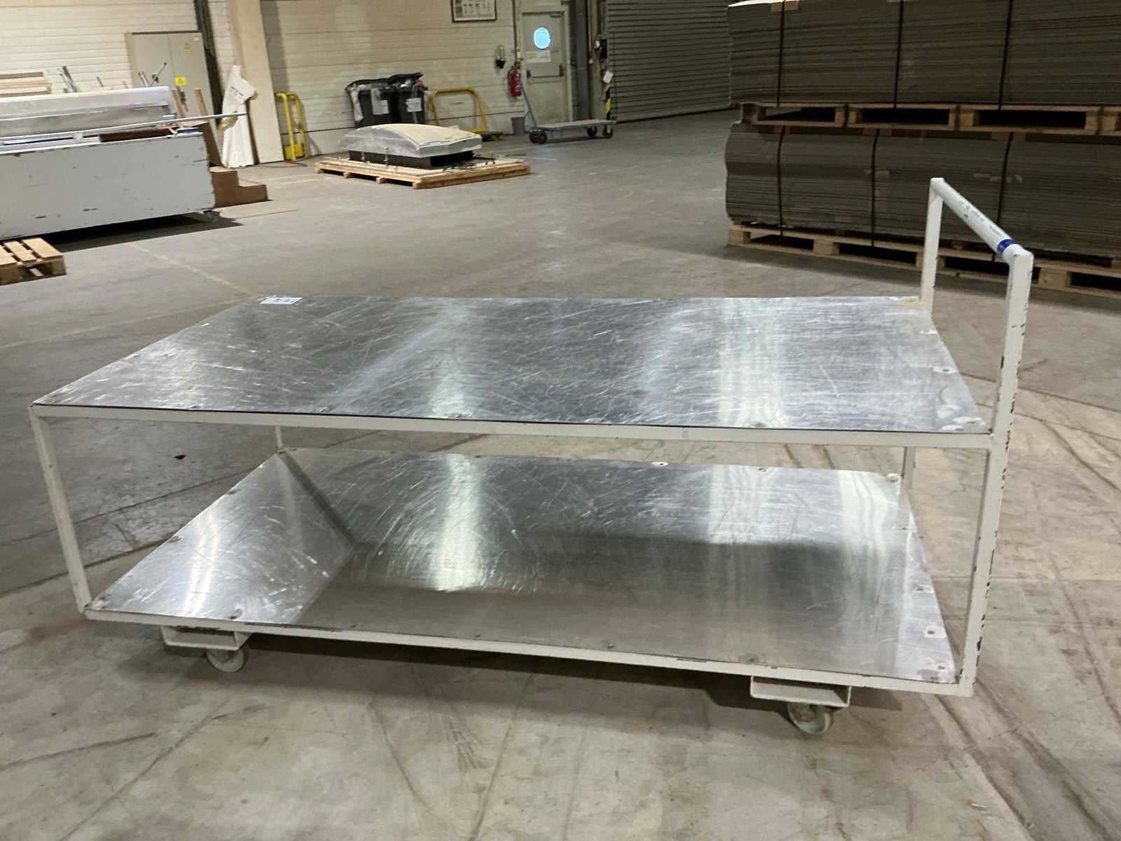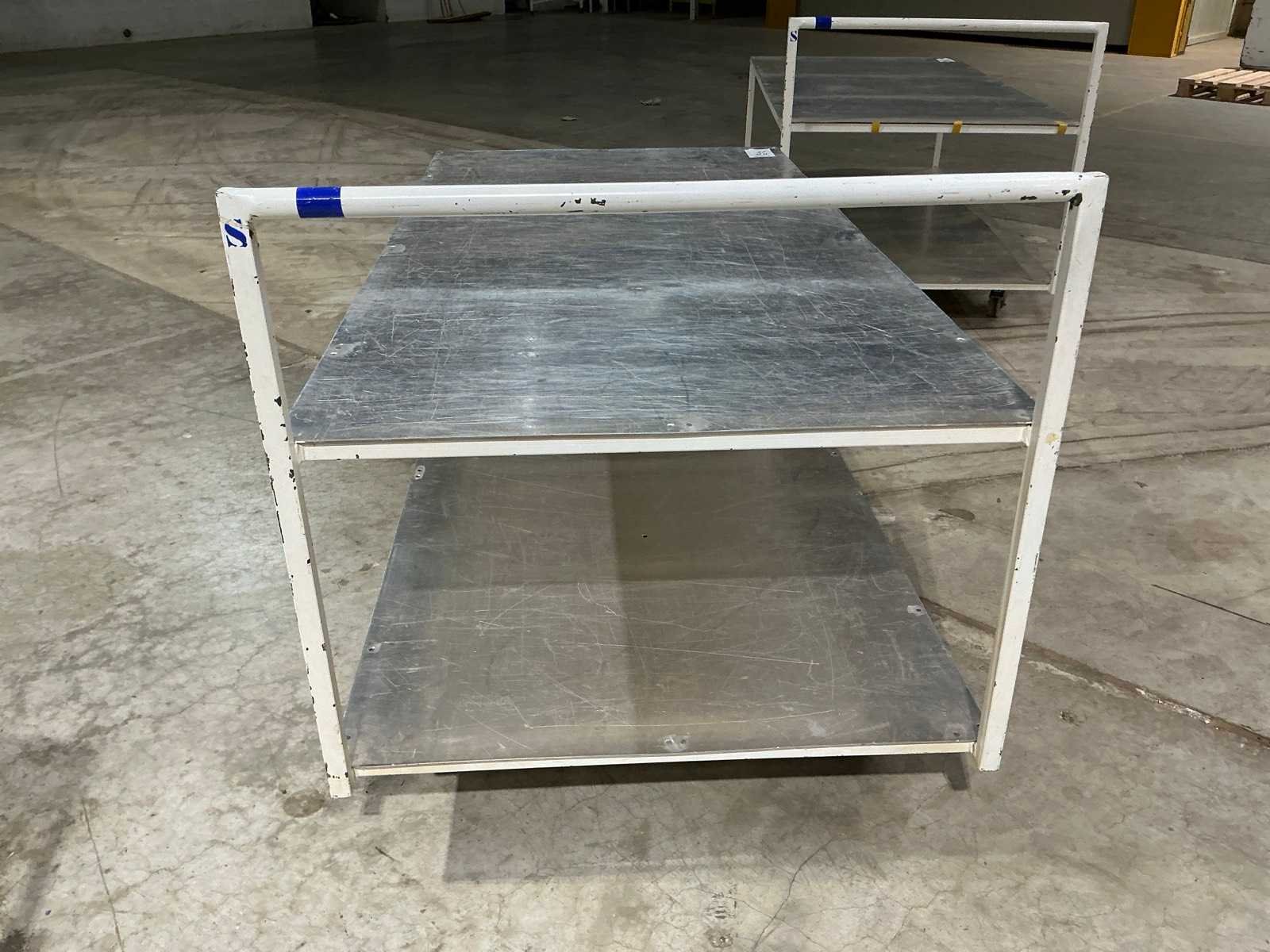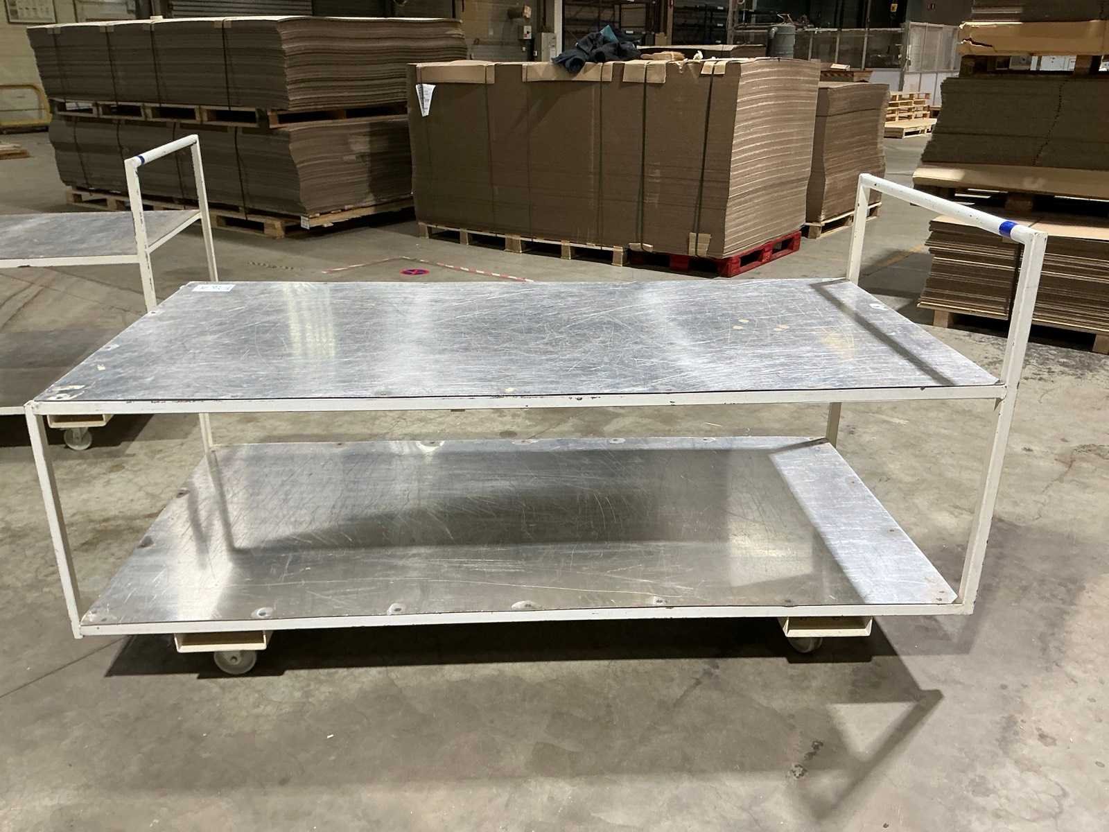 Plateauhoogte = 21 en 74cm; voorzien van 2 vaste wielen en 2 zwenkwielen met rem; uit metaal No Totale afmeting L: 2060mm Totale afmeting Breedte: 1000mm Totale afmeting Hoogte: 1070mm