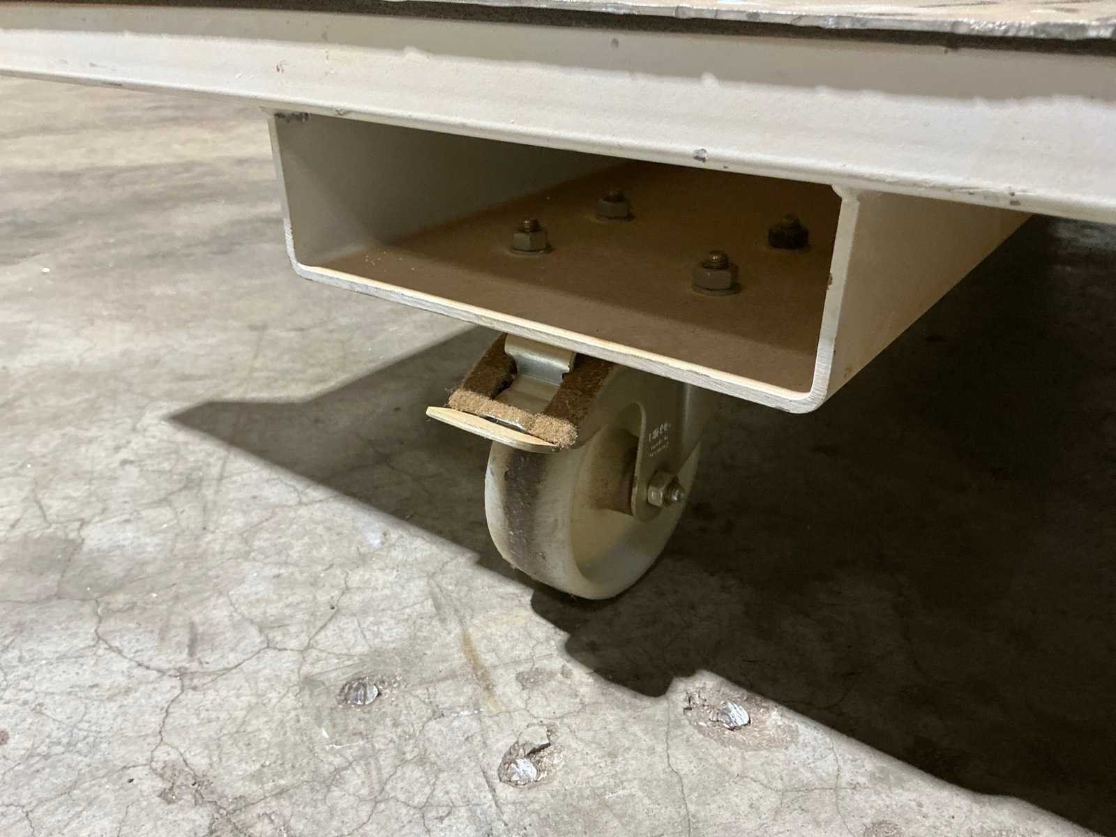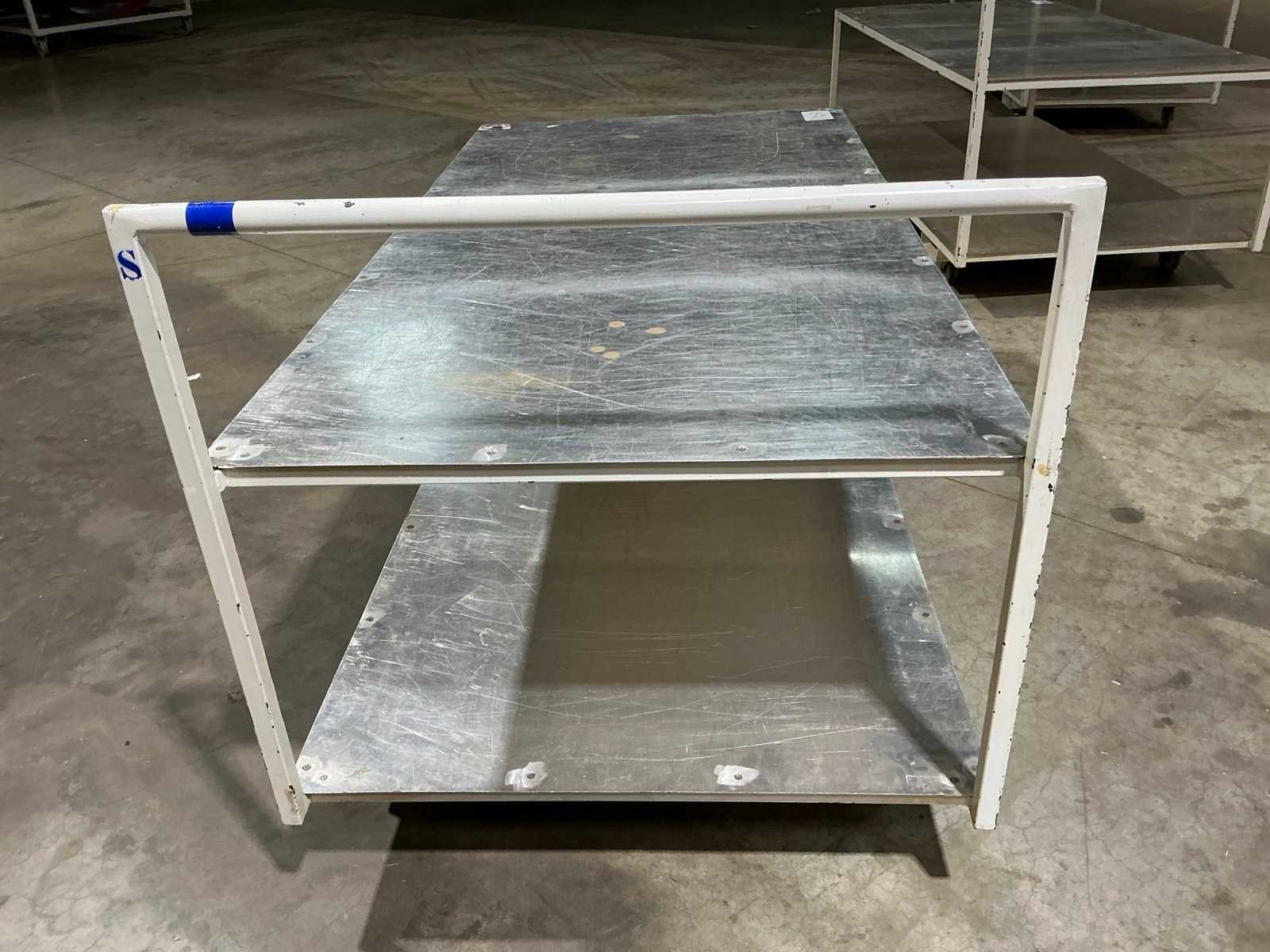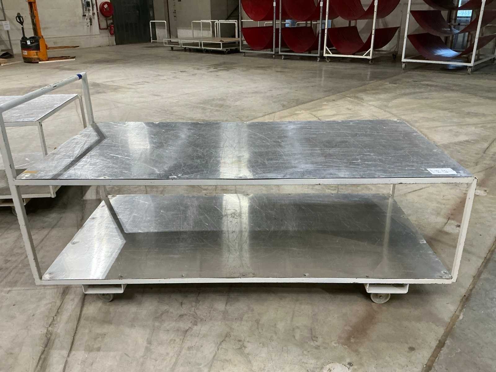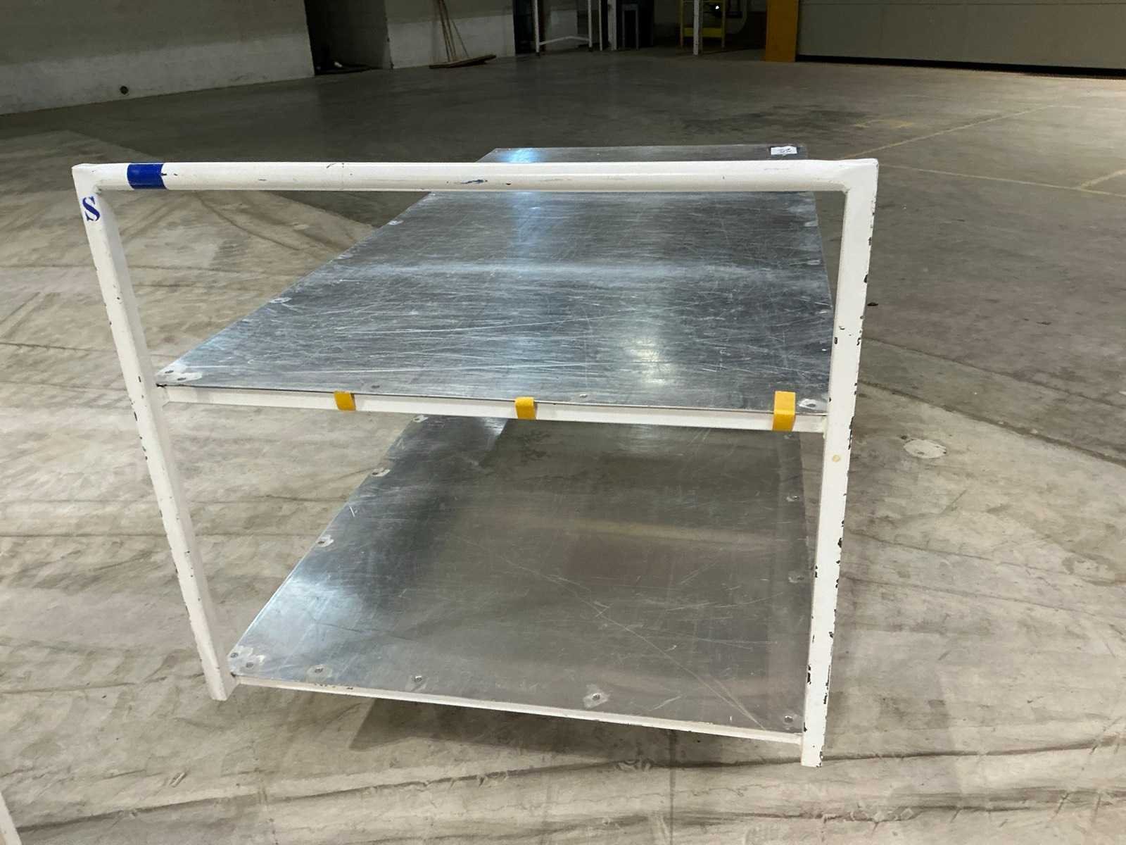 Plateauhoogte = 21 en 74cm; voorzien van 2 vaste wielen en 2 zwenkwielen met rem; uit metaal No Totale afmeting L: 2060mm Totale afmeting Breedte: 1000mm Totale afmeting Hoogte: 1070mm