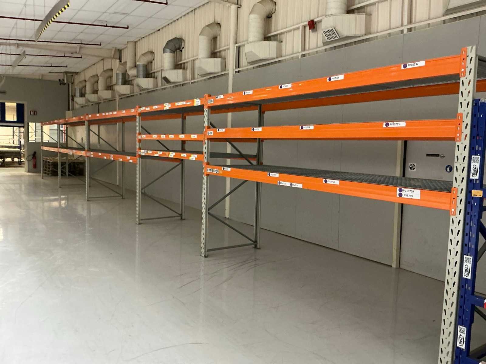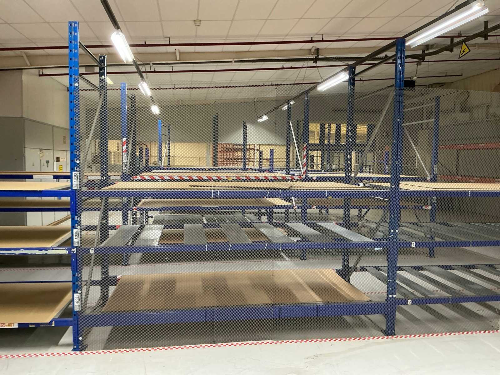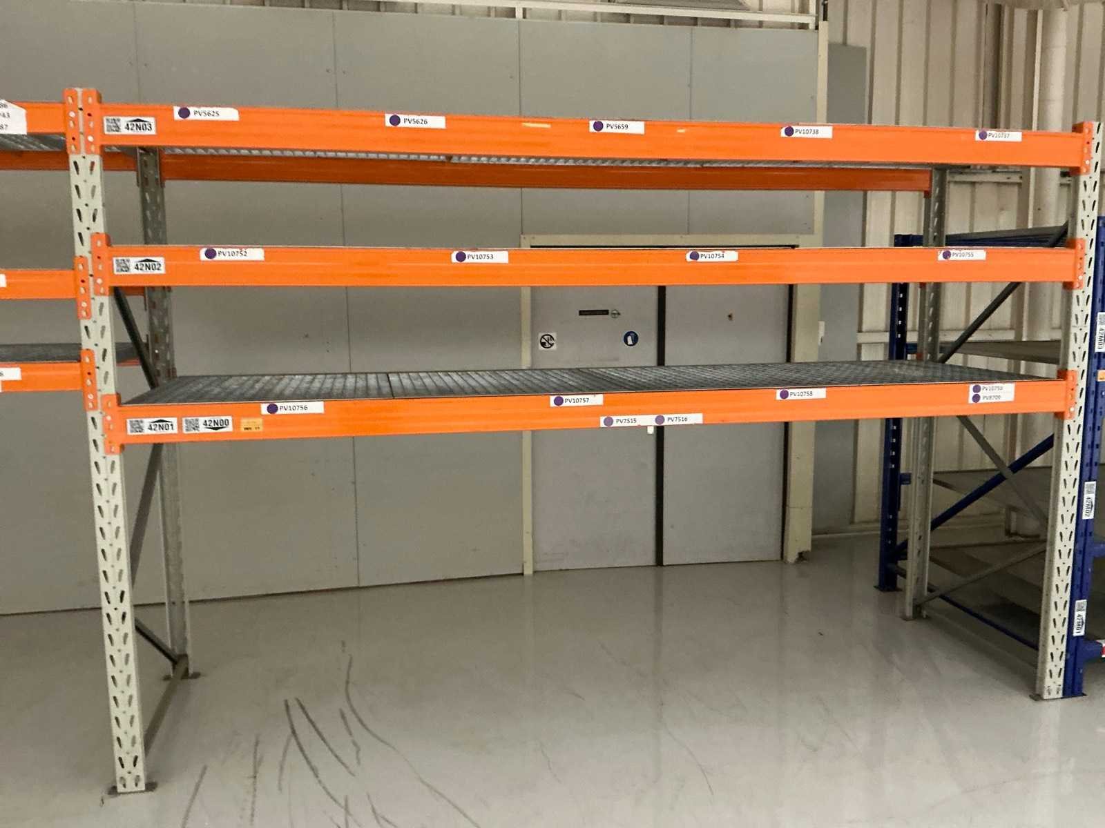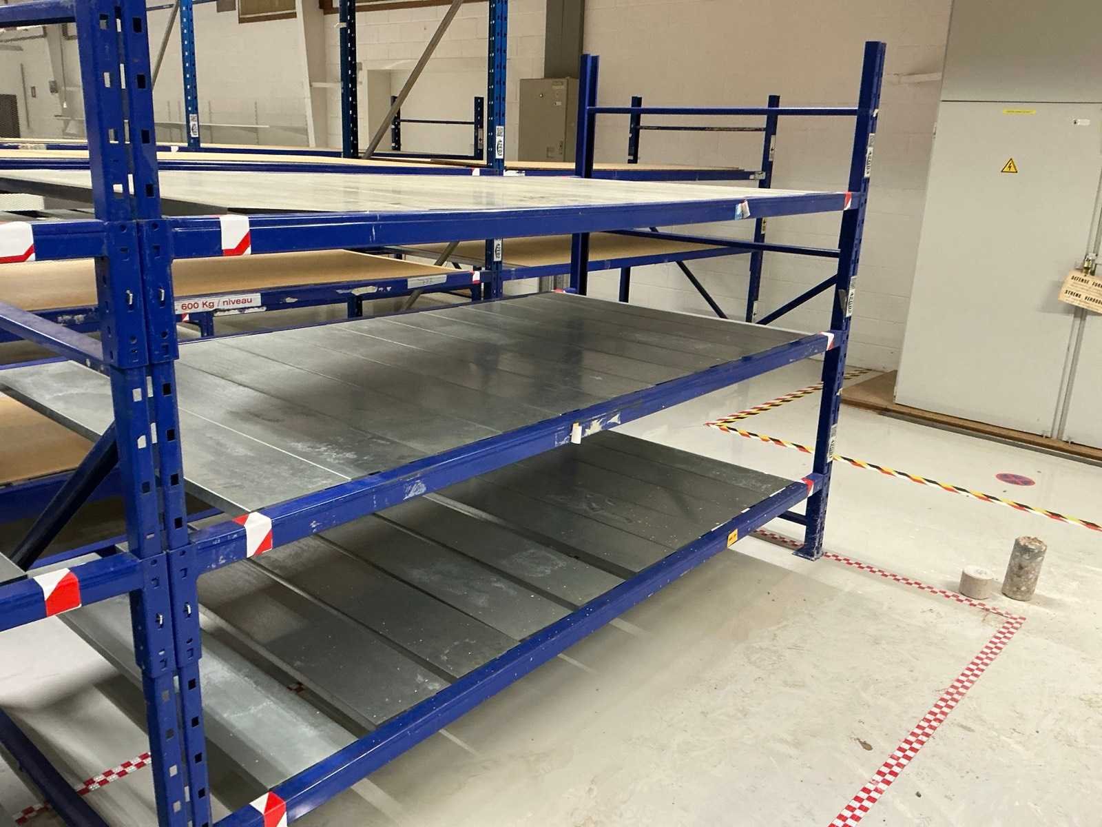 18x ligger oranje 3700mm; 6x ligger oranje 2800mm; 6x staander oranje 2400mm hoog; 12x staander blauw 3000mm hoog; 8x staander blauw 2040mm hoog; 35x ligger blauw 2800mm; 6x ligger blauw 2500mm; diverse legborden en diverse types stellingen; alle stellingen in hal 4-19 No Aantal secties: 19 Sectie diepte: 1300mm Sectie afm. h: 3000mm Aantal staanders: 25 Demontabel: true Materiaal: Staal