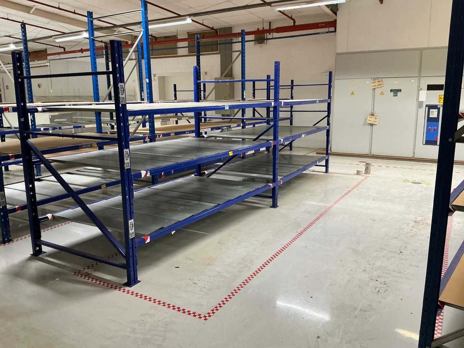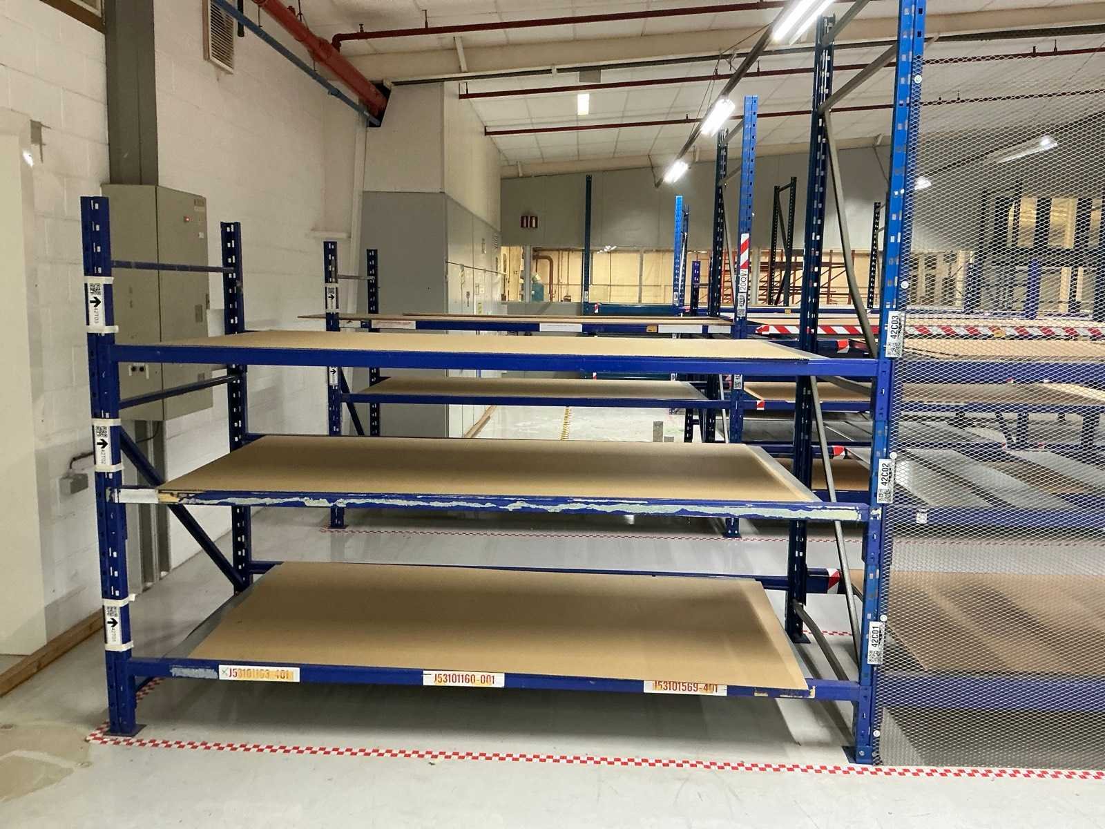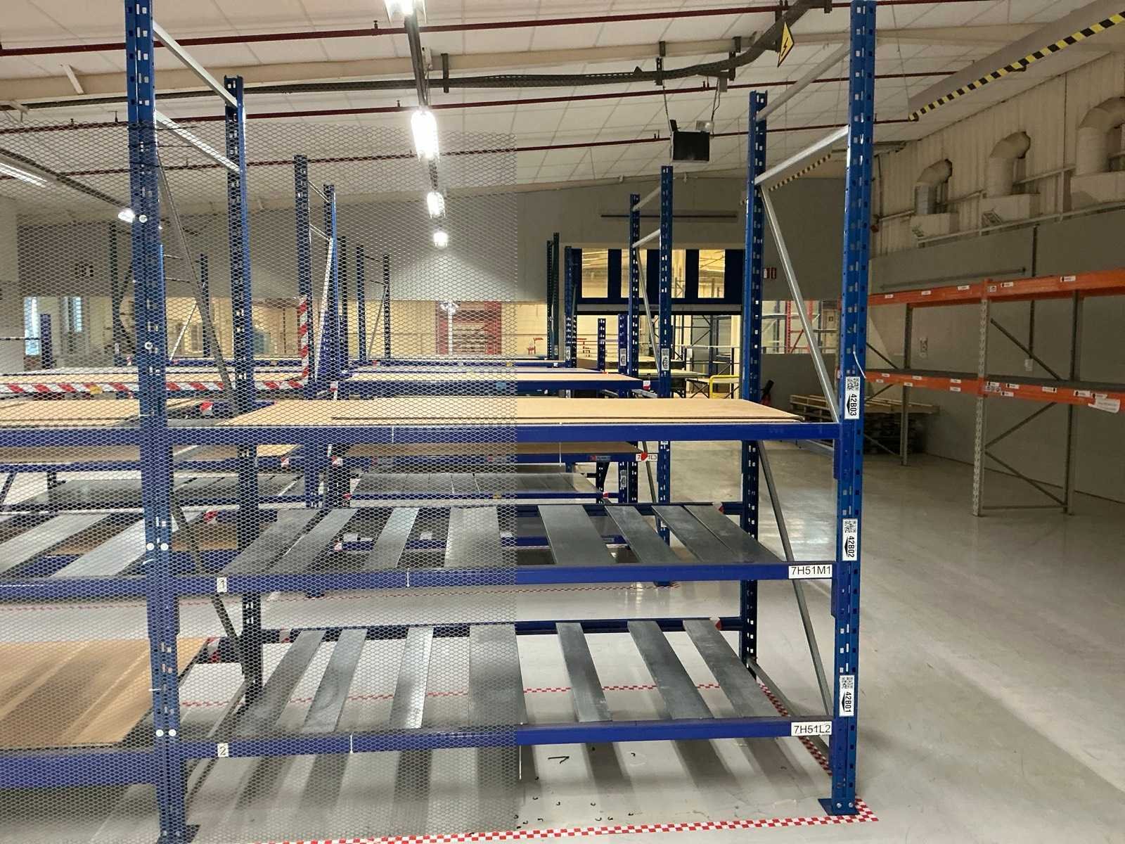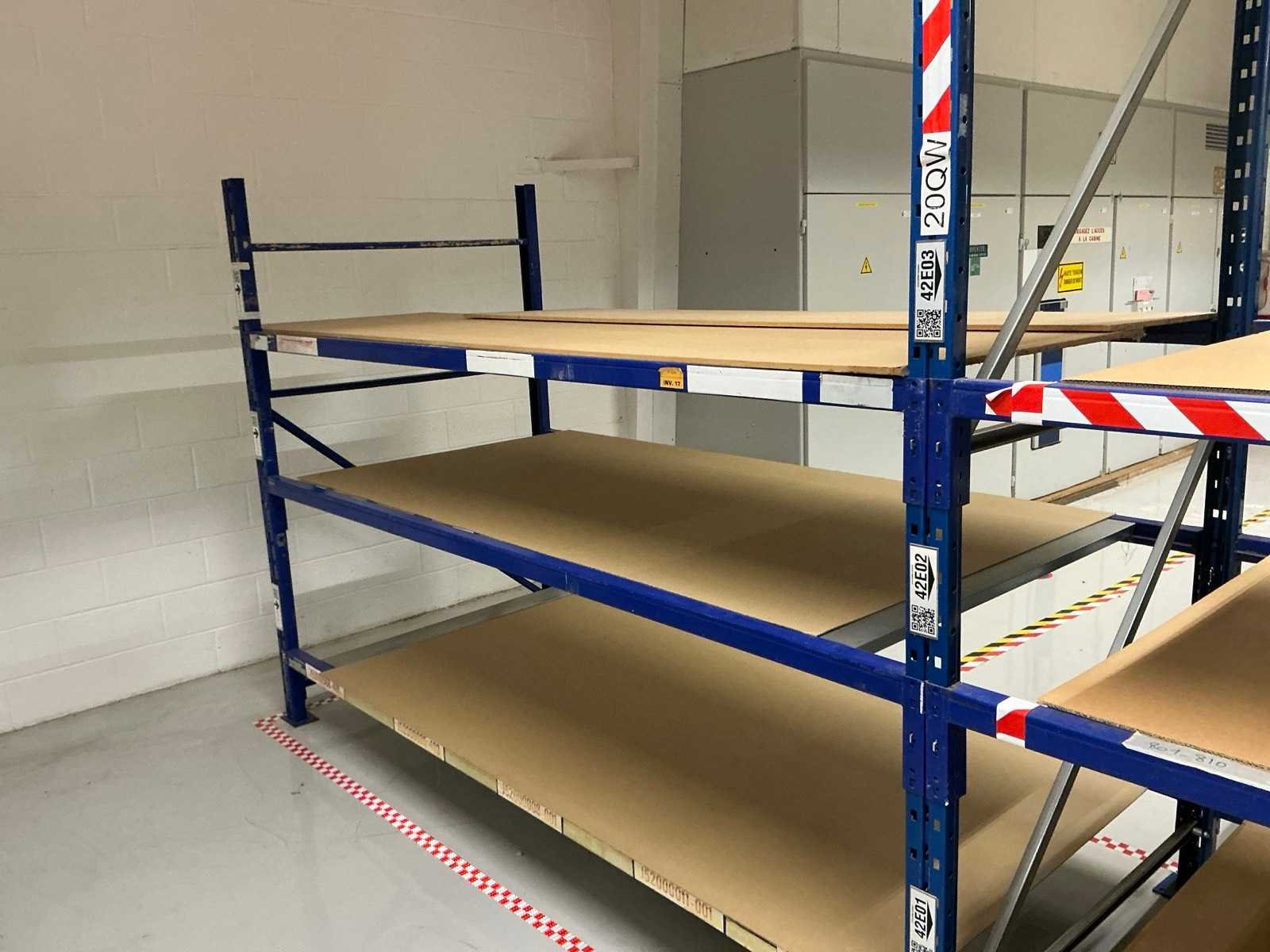 18x ligger oranje 3700mm; 6x ligger oranje 2800mm; 6x staander oranje 2400mm hoog; 12x staander blauw 3000mm hoog; 8x staander blauw 2040mm hoog; 35x ligger blauw 2800mm; 6x ligger blauw 2500mm; diverse legborden en diverse types stellingen; alle stellingen in hal 4-19 No Aantal secties: 19 Sectie diepte: 1300mm Sectie afm. h: 3000mm Aantal staanders: 25 Demontabel: true Materiaal: Staal