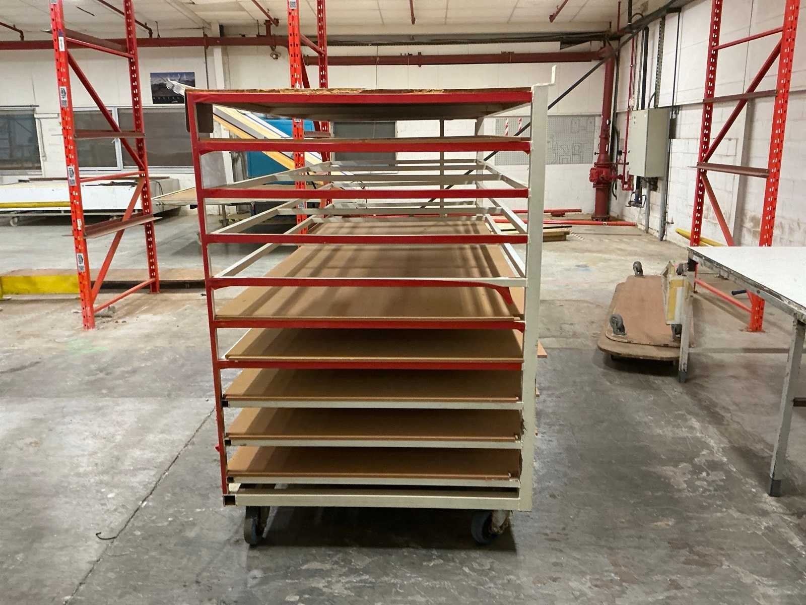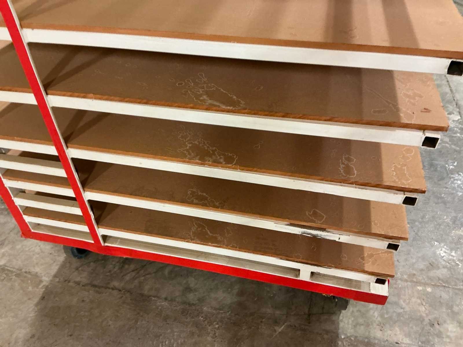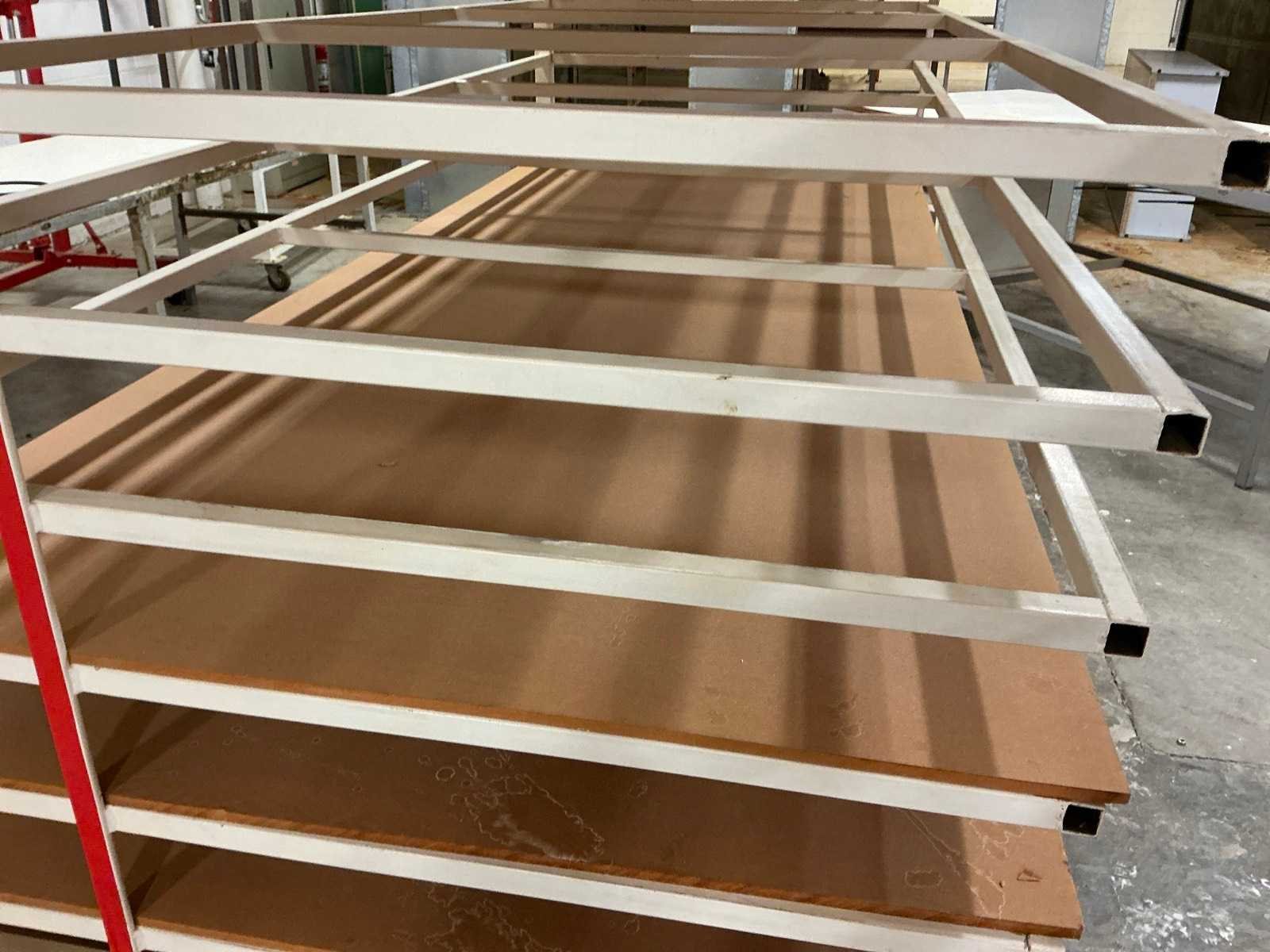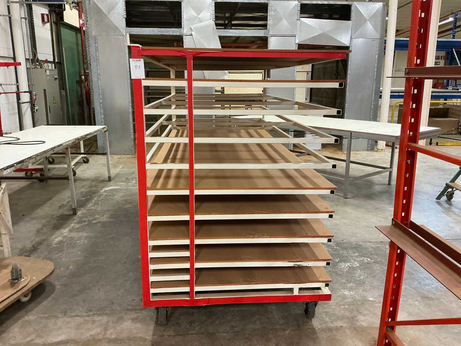 10 legborden deels met houten platen; voorzien van 2 vaste en 2 zwenkwielen No Afmeting l: 290cm Afmeting b: 122cm Afmeting h: 185cm