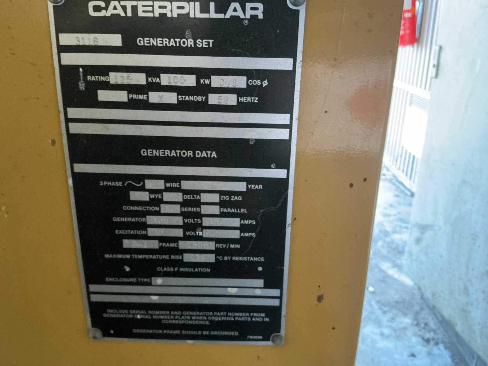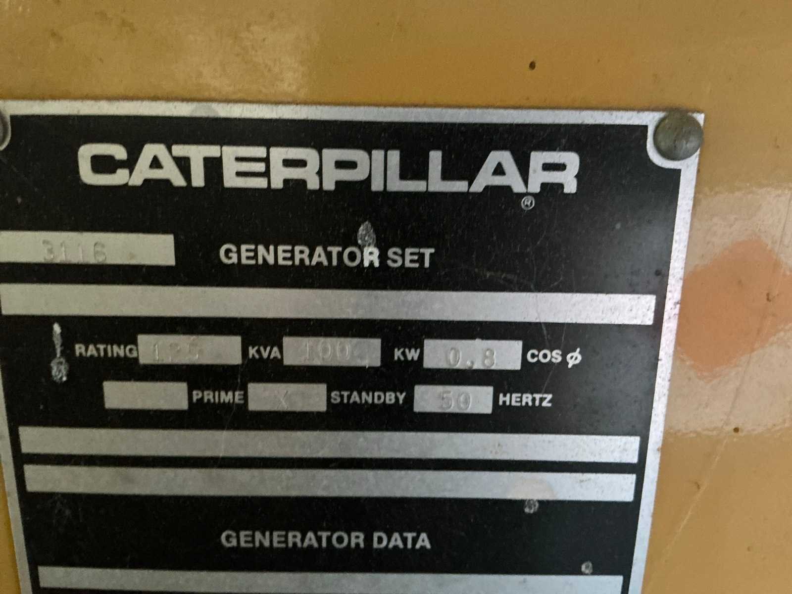 Op transportslede voorzien van hijsogen No Merk: CATERPILLAR Type: 3116 Capaciteit.: 125kVA Diesel: true Type motor: Caterpillar 3116 Aantal cilinders: 6 Watergekoeld: true Afgelezen urenstand: 206 Totale afmeting L: 2500mm Totale afmeting Breedte: 880mm Totale afmeting Hoogte: 1250mm