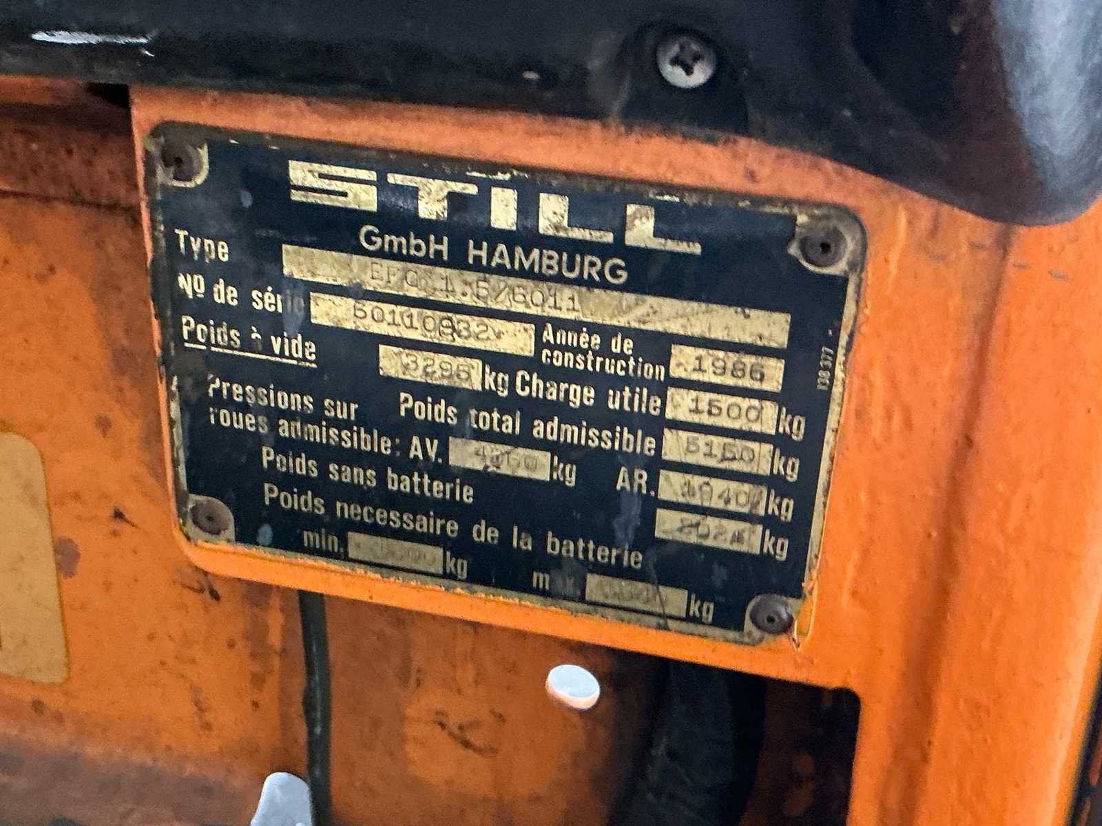 Deze gebruikte STILL-heftruck biedt betrouwbare prestaties en lage werktijden, waardoor het een uitstekende oplossing is voor intern transport, opslag en laadwerkzaamheden. Met een vorklengte van 1200 mm en slechts 1179 uur op de klok is het een licht gebruikte eenheid die klaar is voor doorgezette dienst. Ideaal voor compacte opslagruimtes en krappe operationele zones. Uurteller: 1179, vorklengte: 120 cm No Merk: STILL Type: EFG 1.5 / 6011 Bouwjaar: 1986 Serienummer: 66110032 Totale afmeting L: 3100mm Totale afmeting Breedte: 1100mm Totale afmeting Hoogte: 2300mm