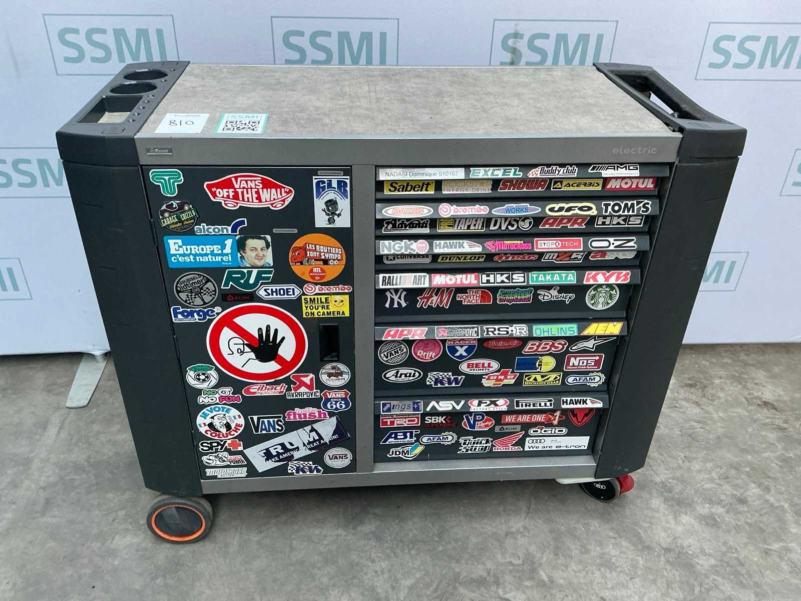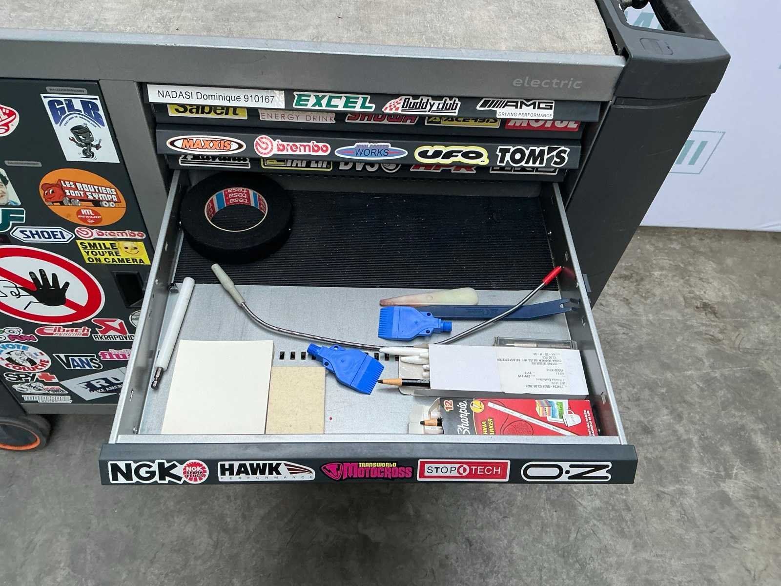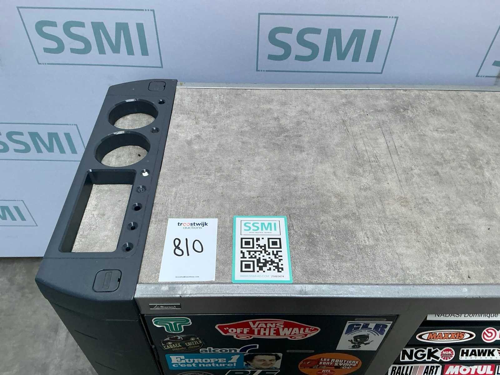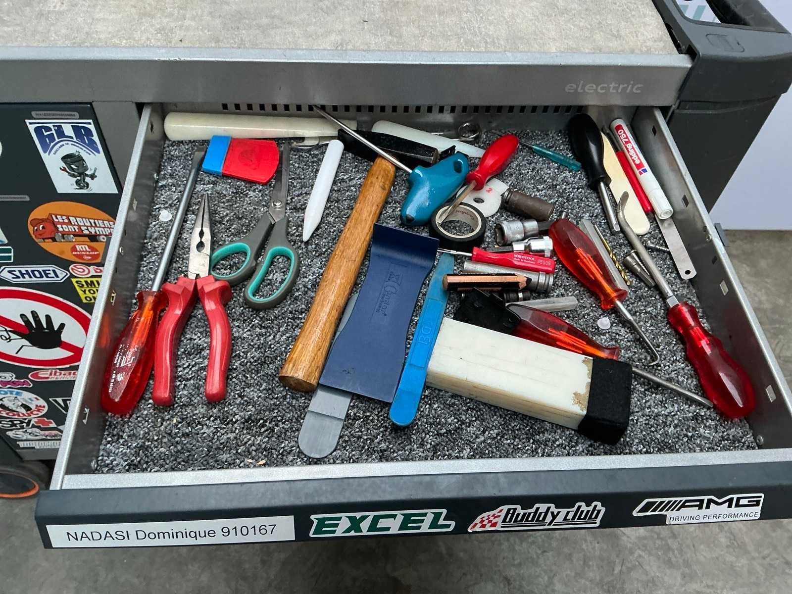 Volledig bestickerd. Met inhoud diverse handgereedschappen; voorzien van 4 wielen waarvan 2 zwenkwielen met rem No Merk: Garant Aantal laden: 6 Met inhoud: true Totale afmeting L: 1180mm Totale afmeting Breedte: 500mm Totale afmeting Hoogte: 1000mm