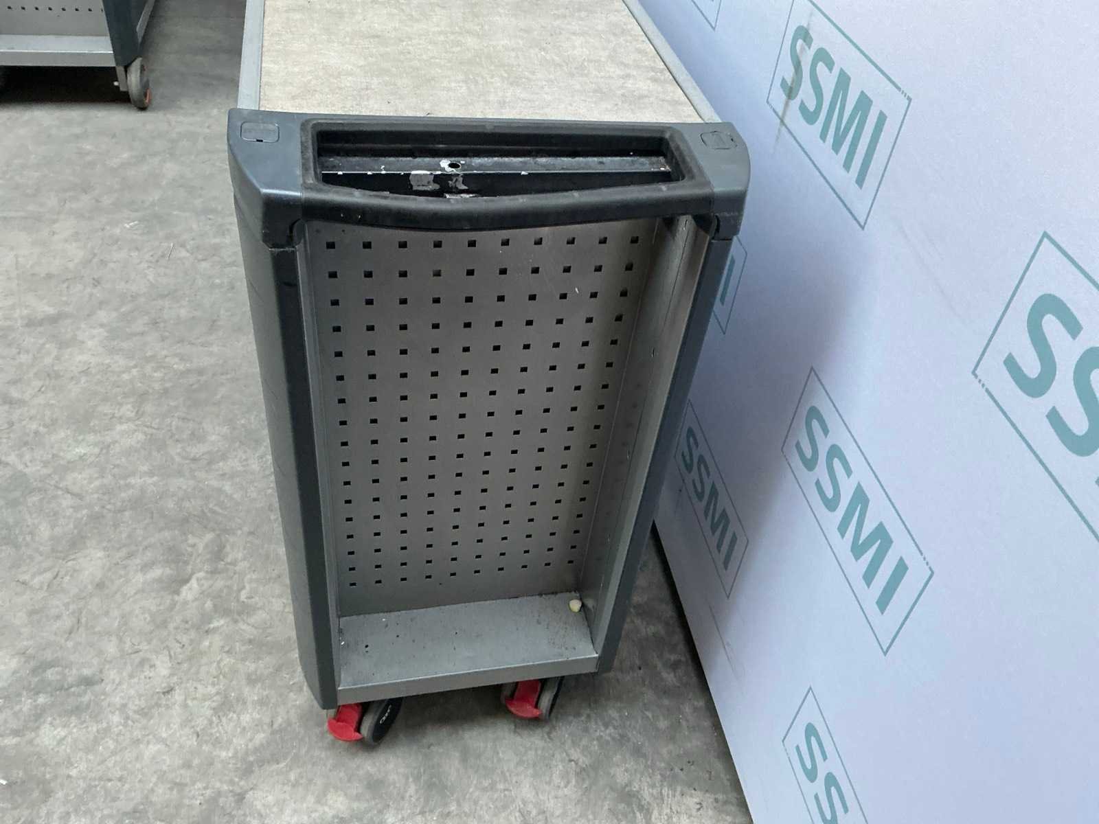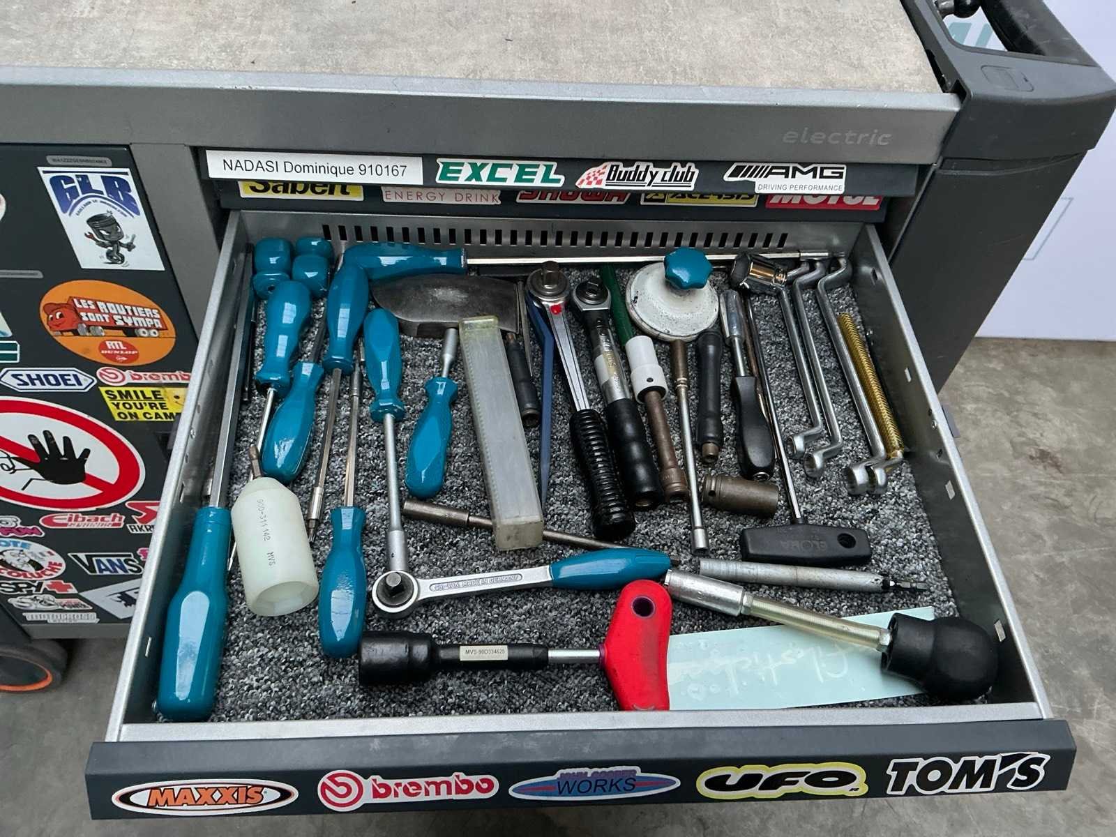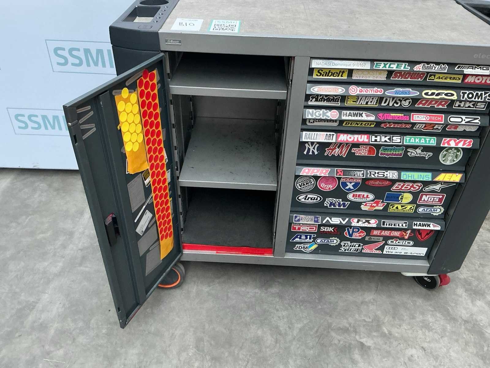 Volledig bestickerd. Met inhoud diverse handgereedschappen; voorzien van 4 wielen waarvan 2 zwenkwielen met rem No Merk: Garant Aantal laden: 6 Met inhoud: true Totale afmeting L: 1180mm Totale afmeting Breedte: 500mm Totale afmeting Hoogte: 1000mm