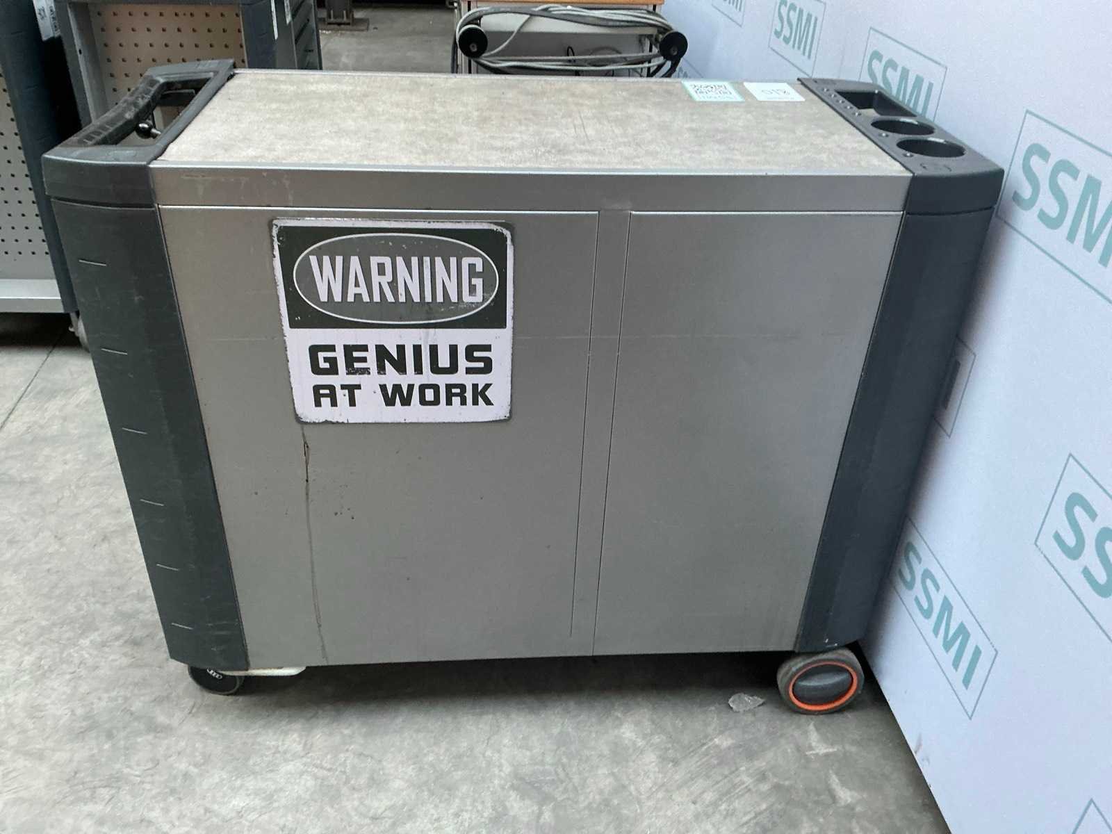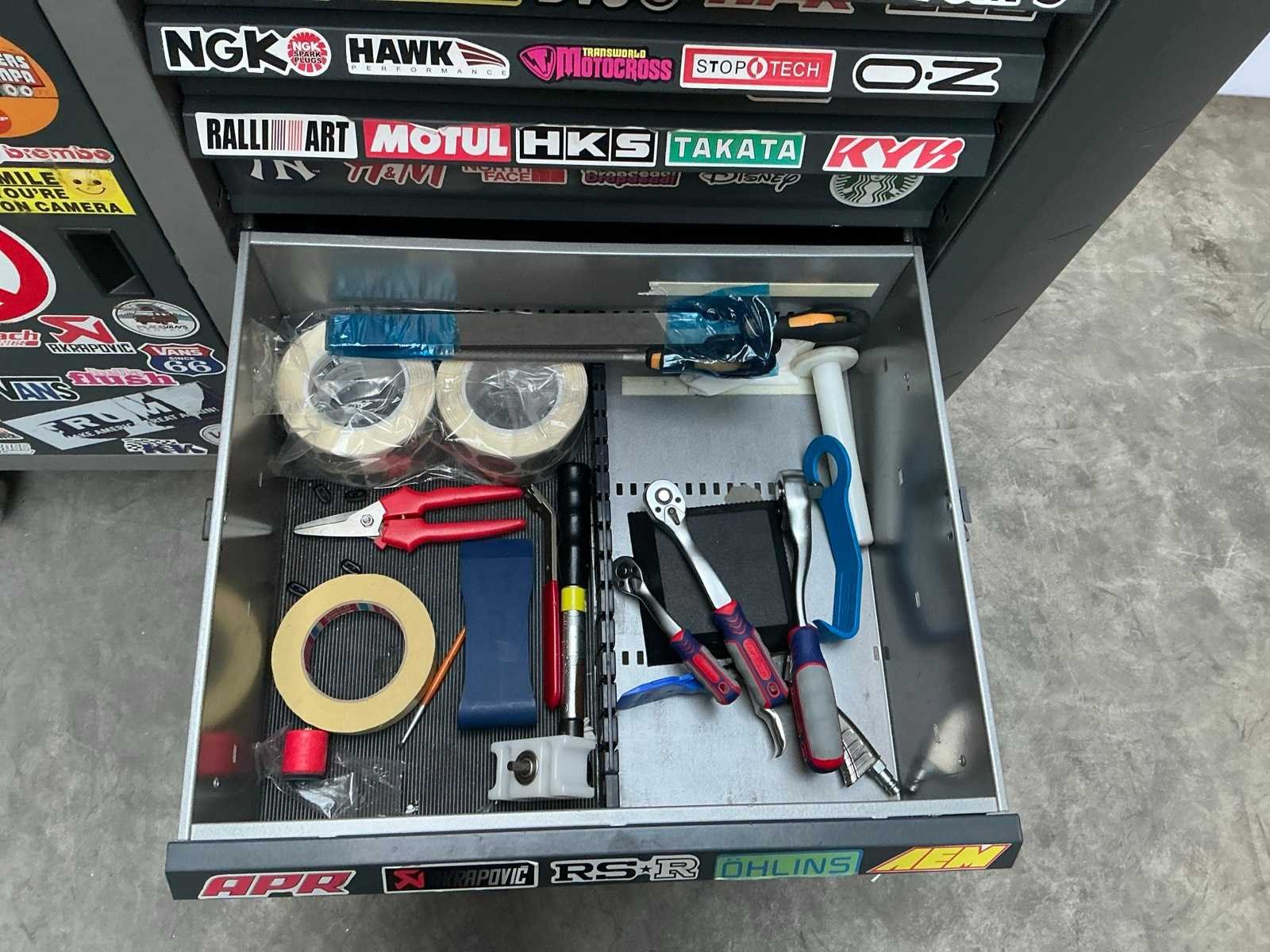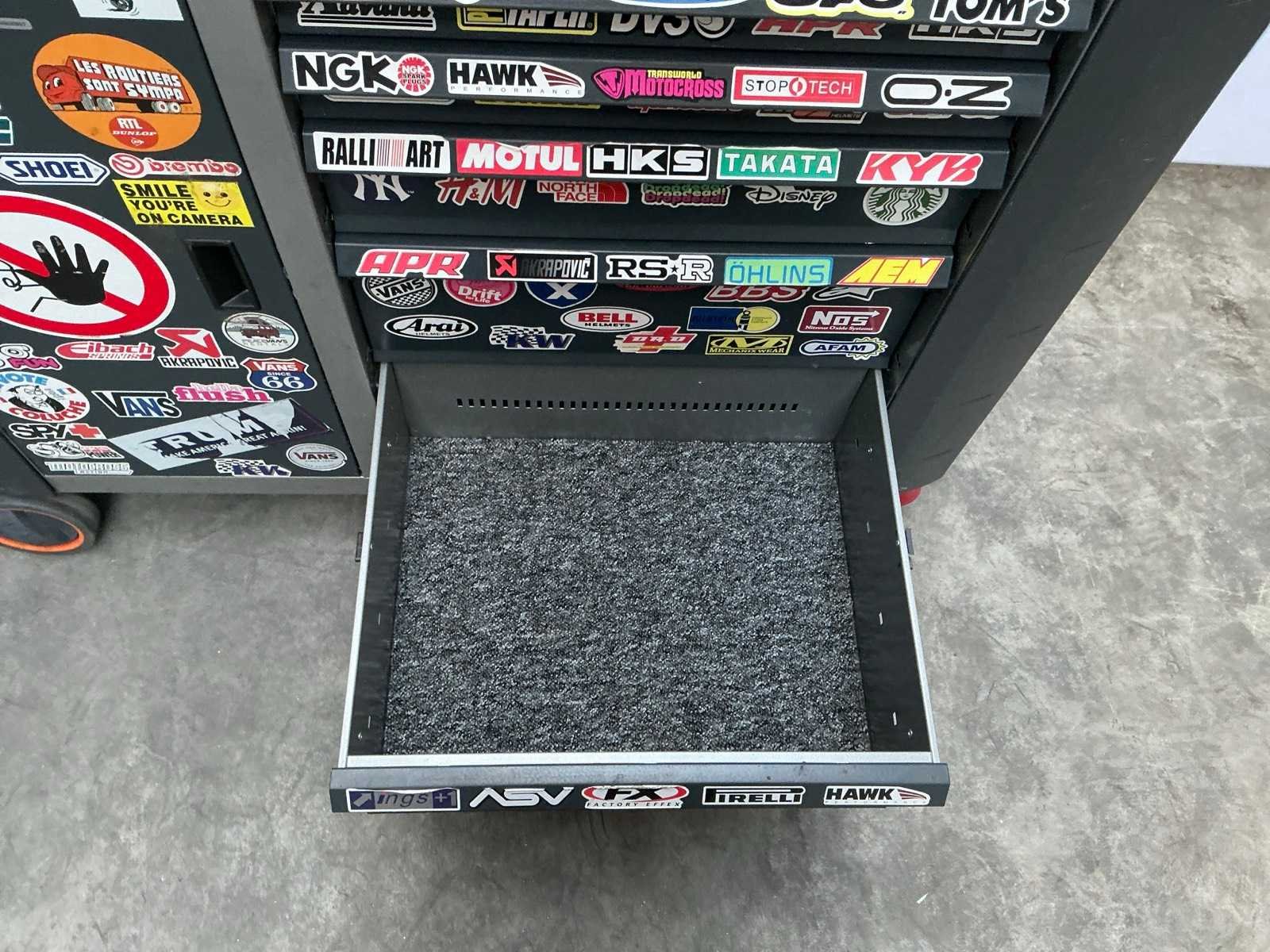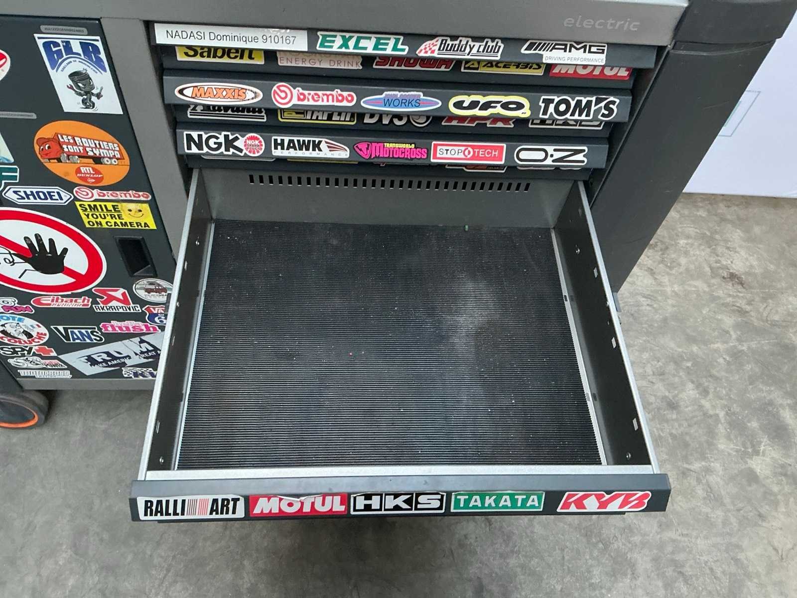 Volledig bestickerd. Met inhoud diverse handgereedschappen; voorzien van 4 wielen waarvan 2 zwenkwielen met rem No Merk: Garant Aantal laden: 6 Met inhoud: true Totale afmeting L: 1180mm Totale afmeting Breedte: 500mm Totale afmeting Hoogte: 1000mm