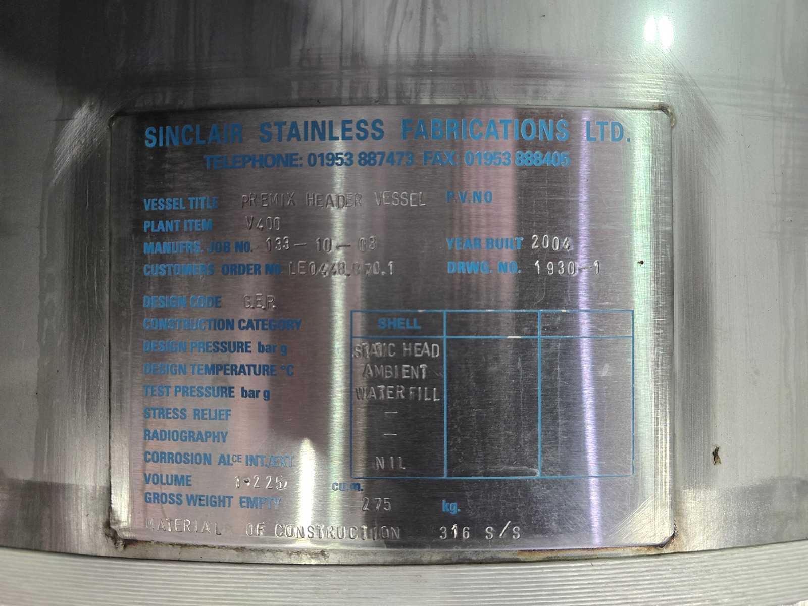Gebouwd door Sinclair Stainless Fabrications Ltd in 2004, is dit V400 premix-headervat vervaardigd van hoogwaardig 316 roestvrij staal en ontworpen voor gebruik in doserings-, waterbehandelings- en premixsystemen. Met een totale statische hoofdcapaciteit van 1 tot 225 kan hij variabele drukniveaus efficiënt aan, wat zorgt voor stabiele verwerkingsomstandigheden. Met een robuust gewicht van 275 kg en vervaardigd door een betrouwbare specialist, is deze premix-header ideaal voor integratie in industriële leiding- of instrumentatiesystemen waar materiaalhygiëne en levensduur essentieel zijn. No Merk: Sinclair Capaciteit.: 225l Eigen gewicht: 275kg Rvs: true Serienummer: 133-10-03 Bouwjaar: 2004 Type: V400