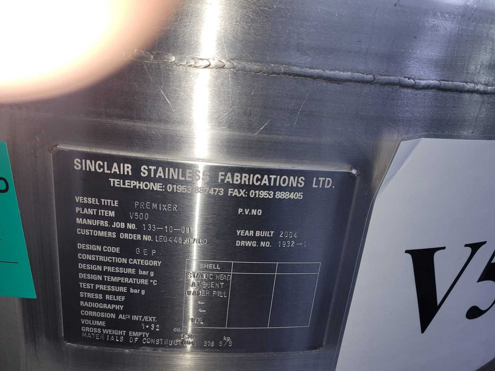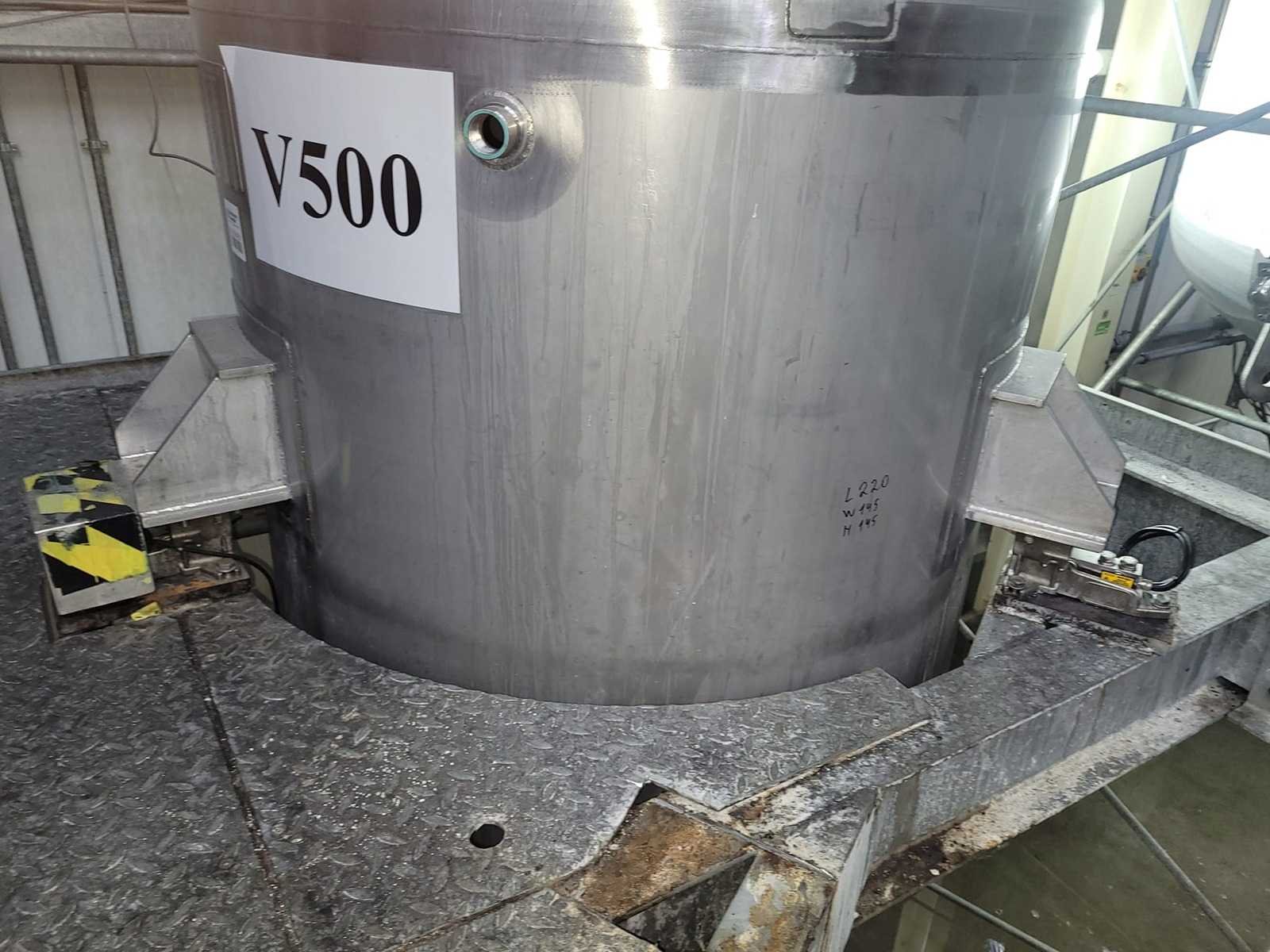 Mengschip, SS316, capaciteit 1,46 m3, bedrijfscapaciteit, 1,0 m3, werkdruk ATMOS, omgevingstemperatuur, pakkingmateriaal Viton, mixer, sprayball inbegrepen, apparatuur is gedemonteerd en klaar voor verzending. Diameter 1100 mm No Merk: Sinclair Mixer: true Eigen gewicht: 230kg Rvs: true Totale afmeting Hoogte: 1750mm Serienummer: LEO4488701 Bouwjaar: 2004 Type: V500