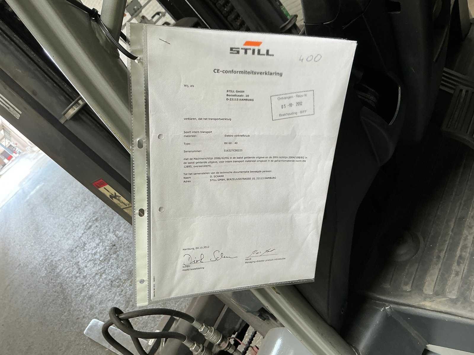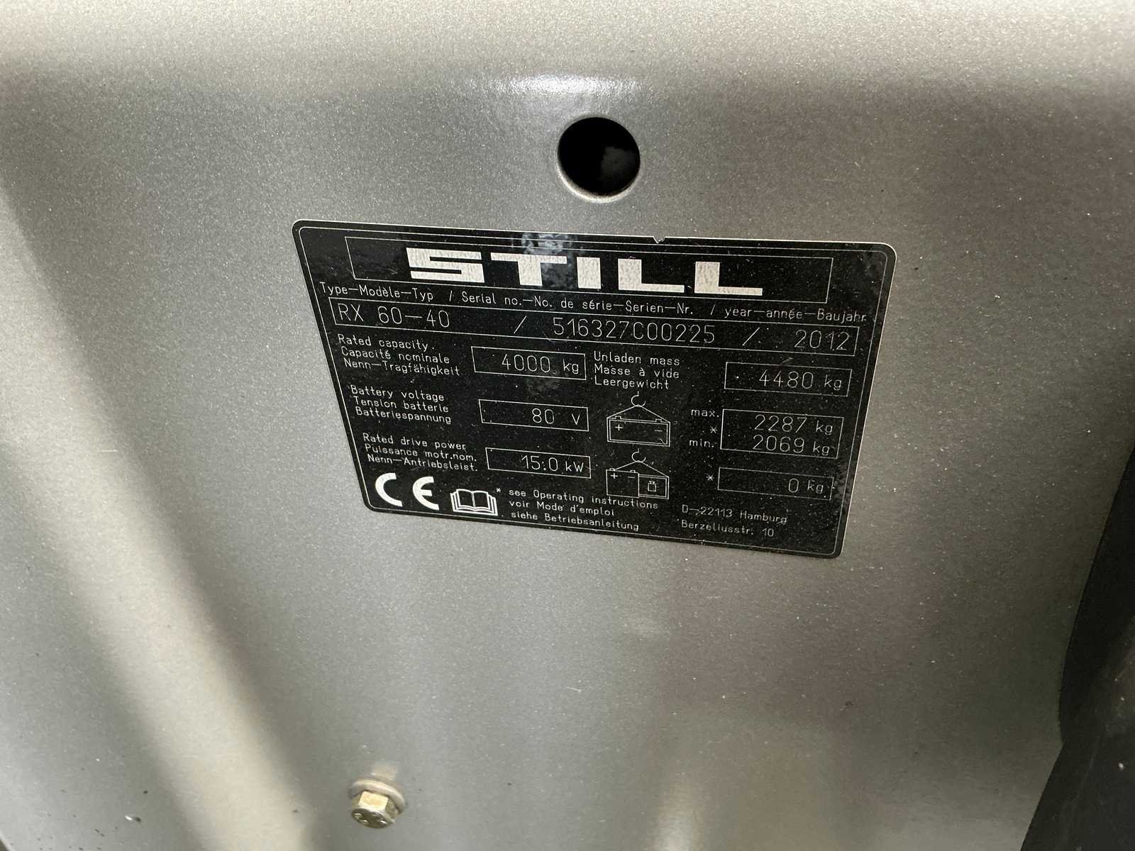 No Merk: STILL Type: RX60-40 Bouwjaar: 2012 Serienummer: 516327C00225 Afgelezen urenstand: 17651 Hydraulisch verstelbare lepels: true Duplex mast: true Eigen gewicht: 6767kg Hefvermogen: 4000kg Vol rubber banden: true