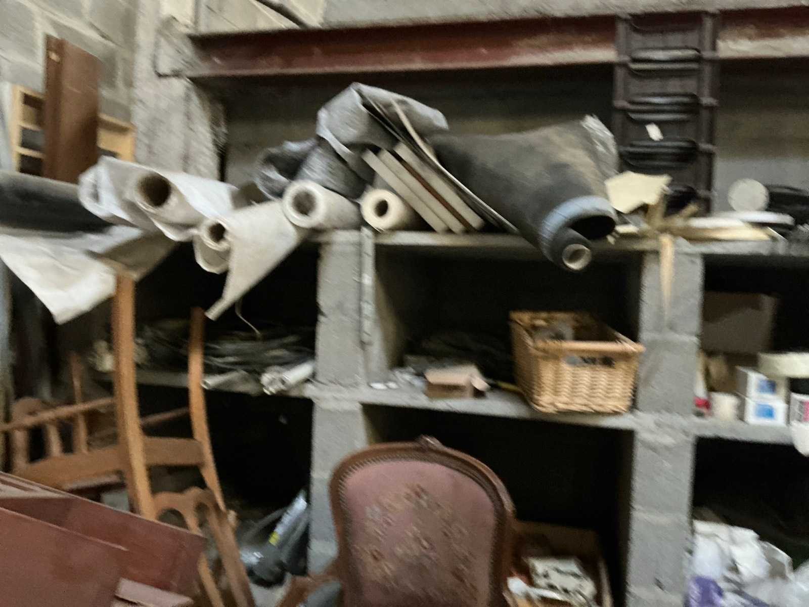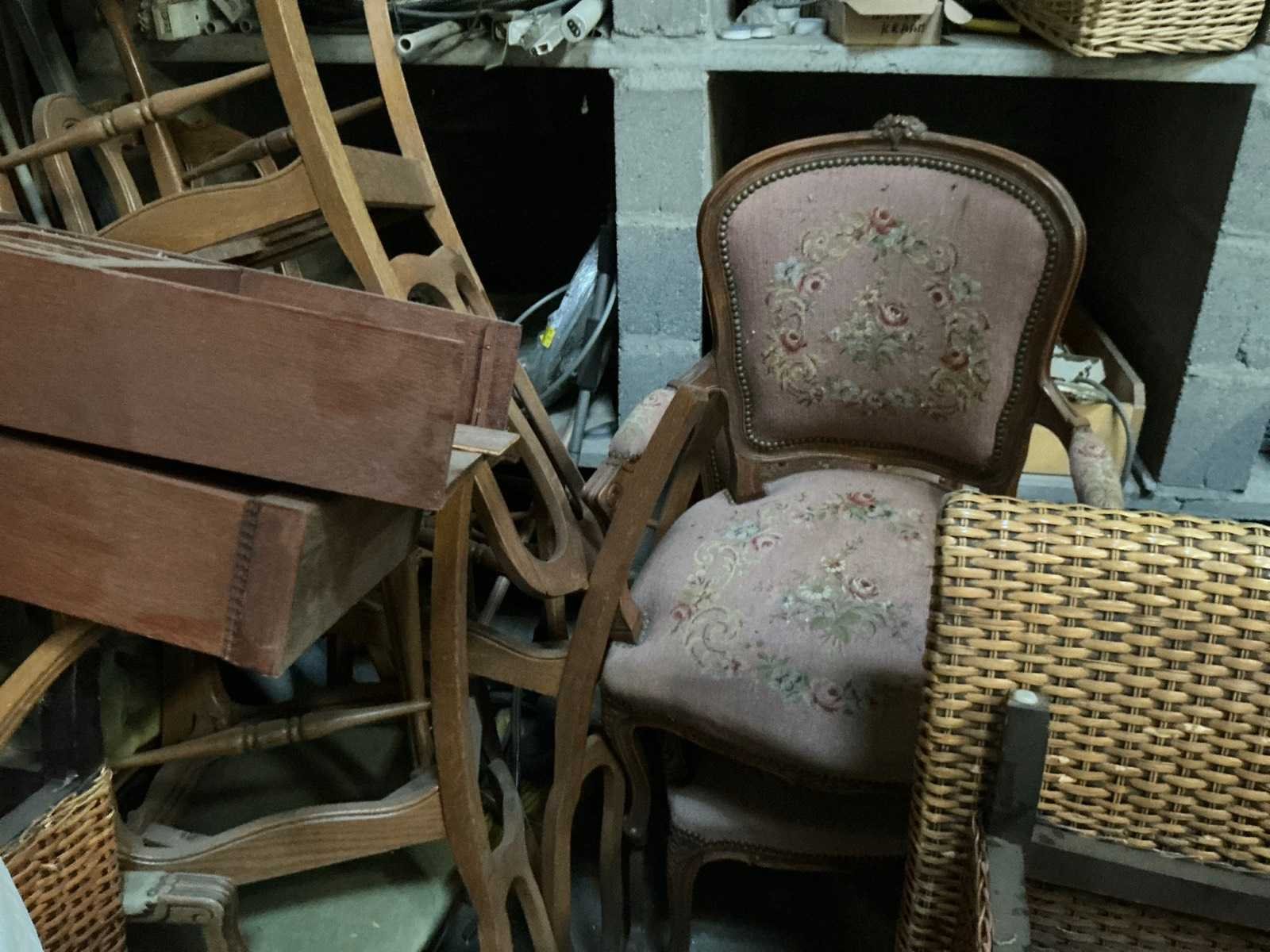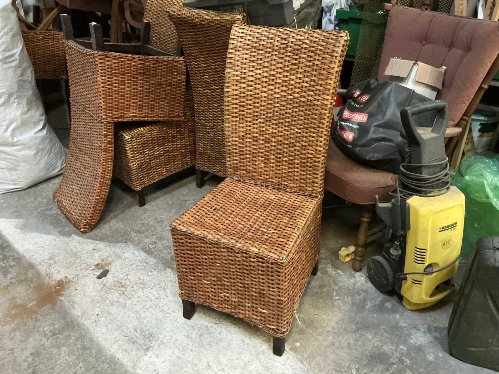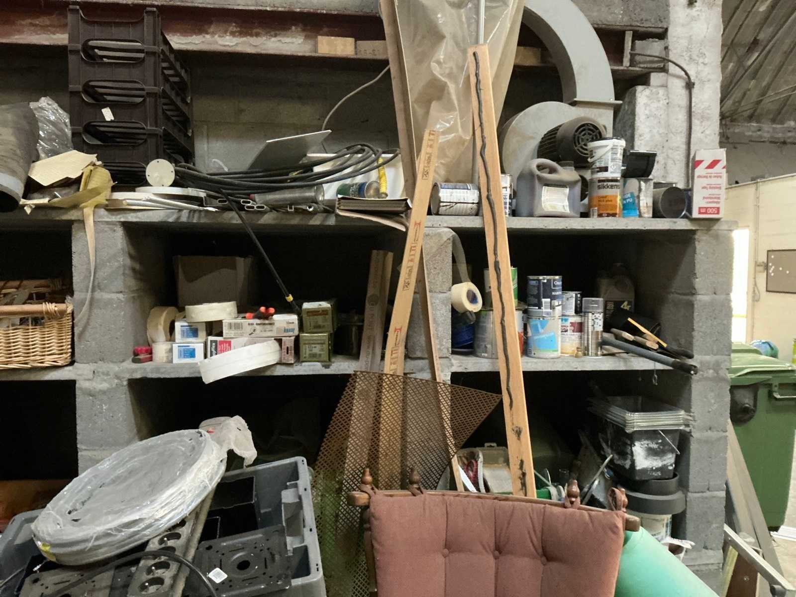 Waaronder bestaande uit: 6 rietgevlovhten bijzetstoelen, 1 vintage houten fauteuil voorzien van stoffen bekleding, 8 vintage metalen bijzetstoelen, 1 klassiek houten salontafel, 8 diverse klassieke houten bijzetstoelen waaronder voorzien van antieke stoffen bekleding, Enige diverse afschermdoeken en folie op rol, 1 hogedrukreiniger Kärcher (werking ongekend) en 1 metalen jerrycan, Uitgezonderd genummerde kavels en eigendomsvoorbehoud, Afgifte volgens aanwijzing Nee