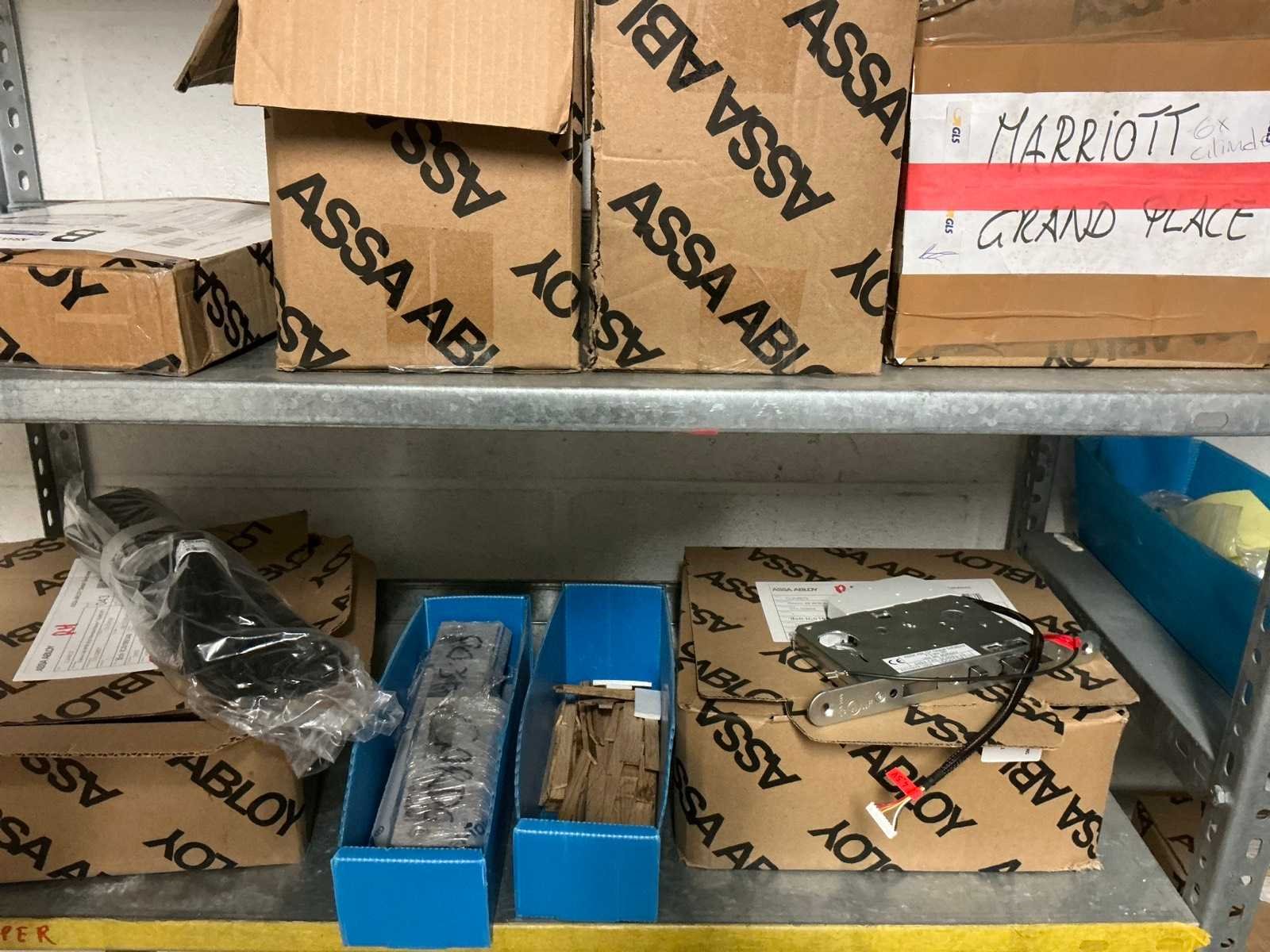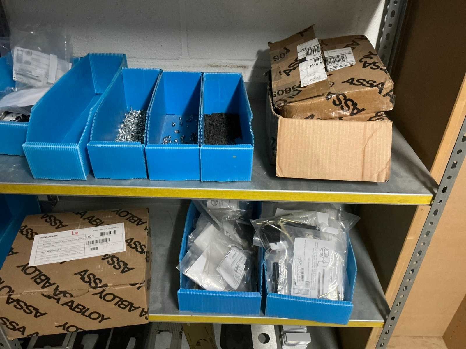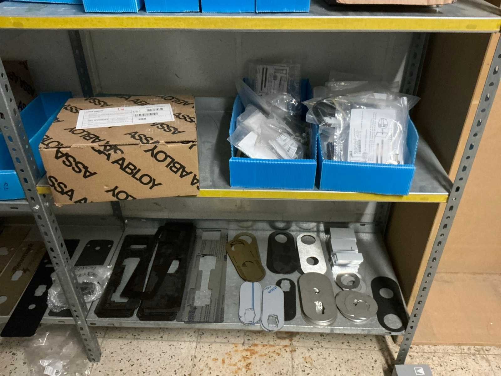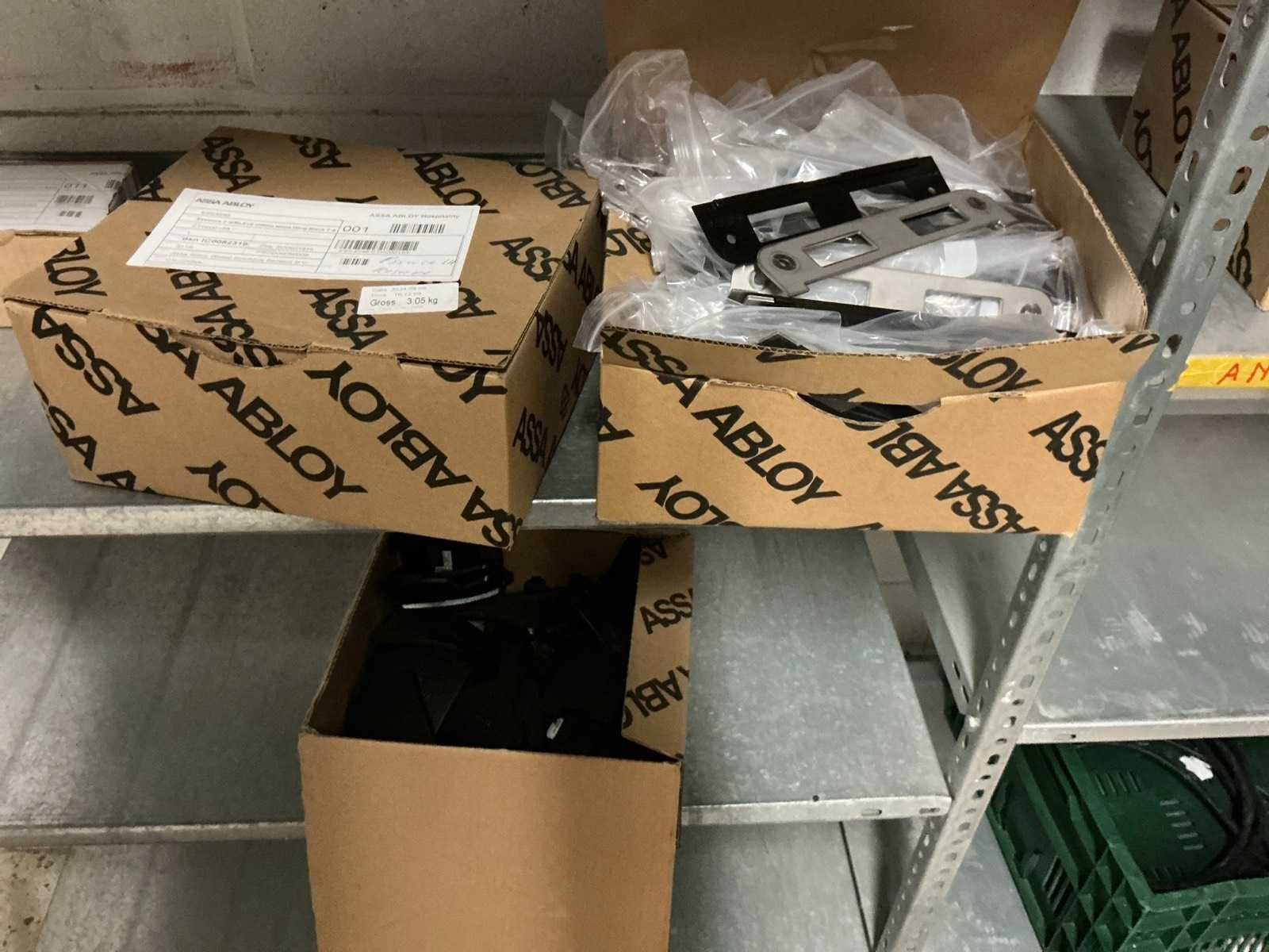 Waaronder bestaande uit: Partij diverse deursloten, Kunststof batterijhouders, Klinken, klinkonderdelen, Elektrische sloten, Kunststof afdekkapjes voor kaartlezers, Slotafdekplaten, Divers bevestigingsmateriaal voor sloten waaronder schroeven en bouten, 1 alu deur voorzien van glas, 1 kunstlederen 2-persoons bedframe, Waaronder liggende in circa 5 lm metalen opbergrek voorzien van 6 en 7 leggers, hoogte circa 250cm, 1 houten bijzettafel voorzien van metalen onderstel, 4 metalen bijzetstoelen voorzien van kunststof zit en rug, Uitgezonderd genummerde kavels en eigendomsvoorbehoud, Afgifte volgens aanwijzing Nee