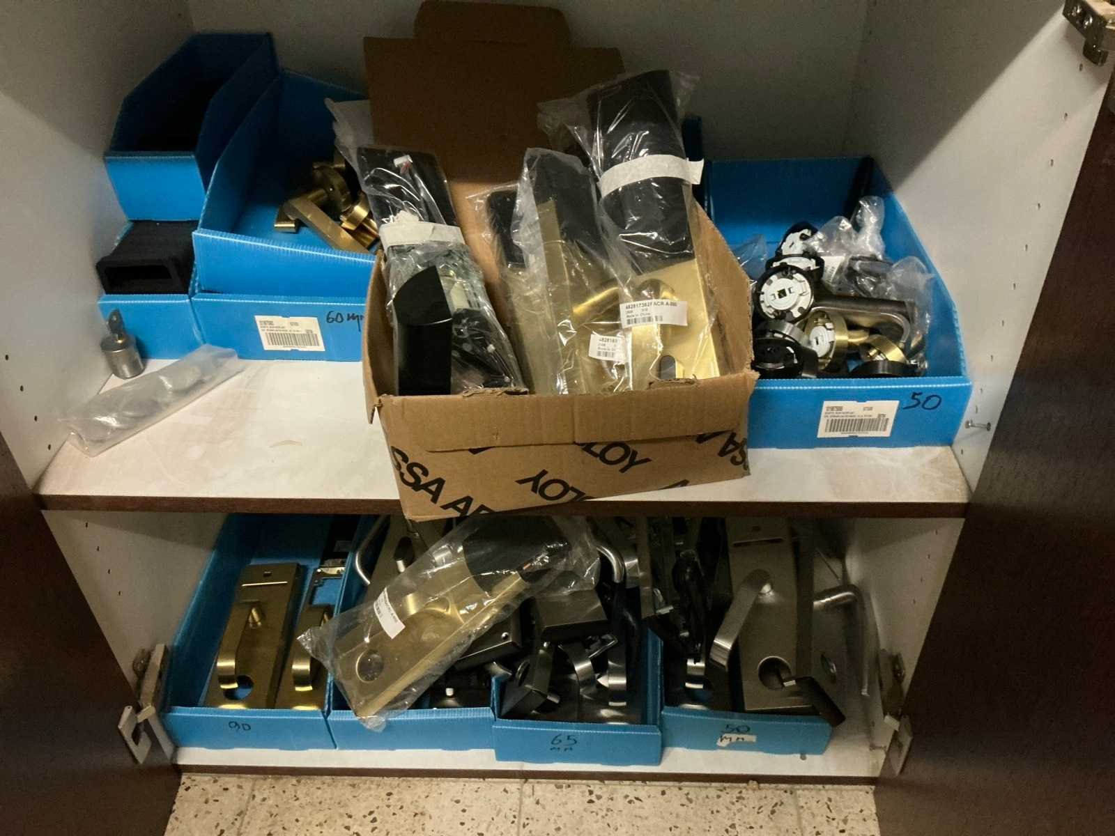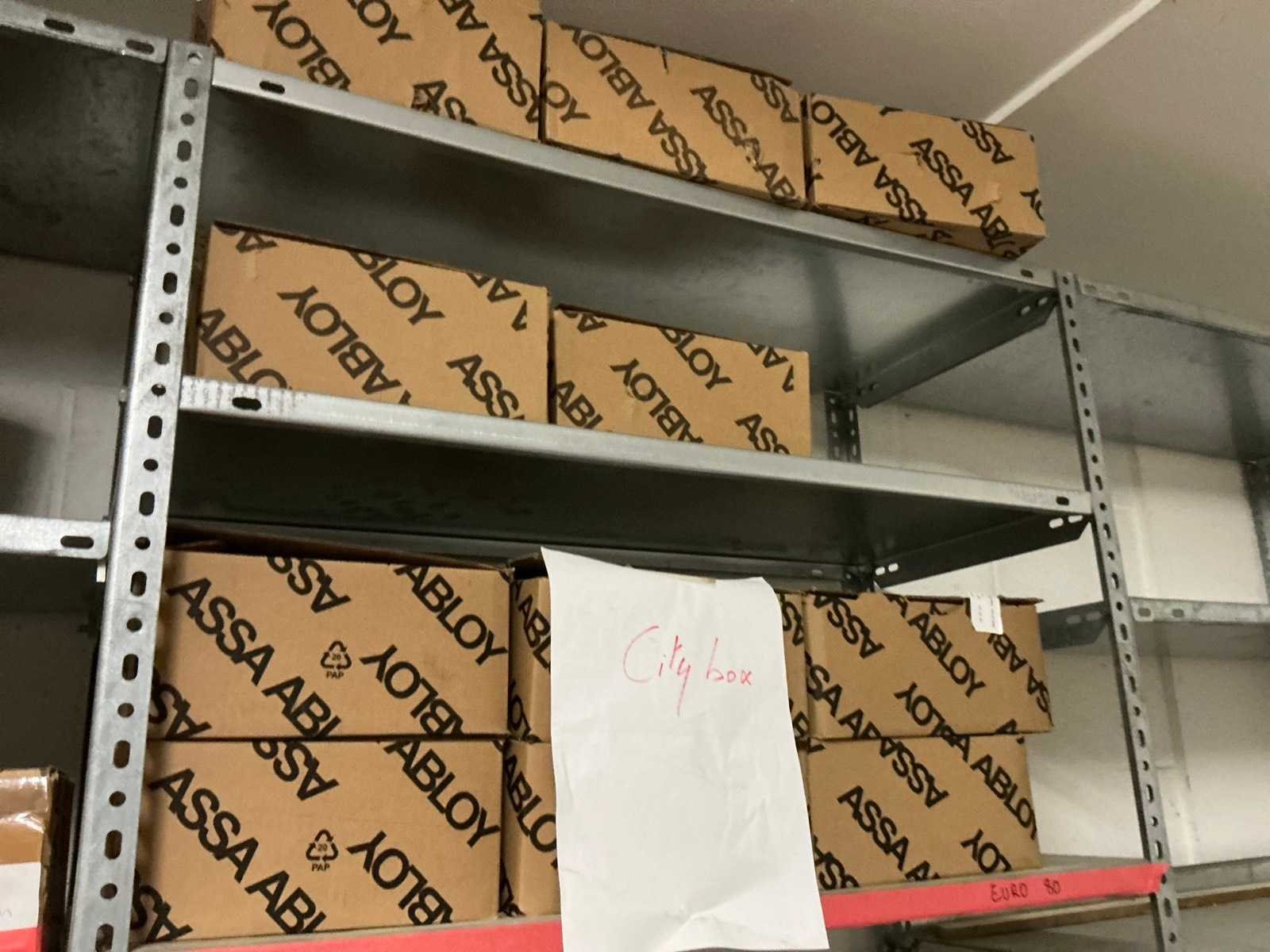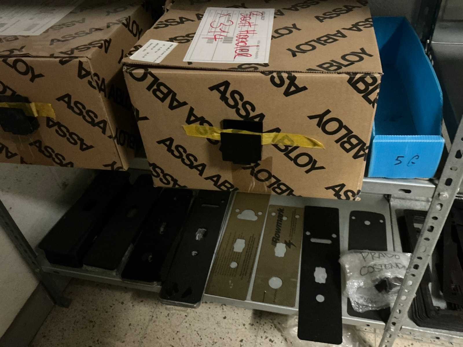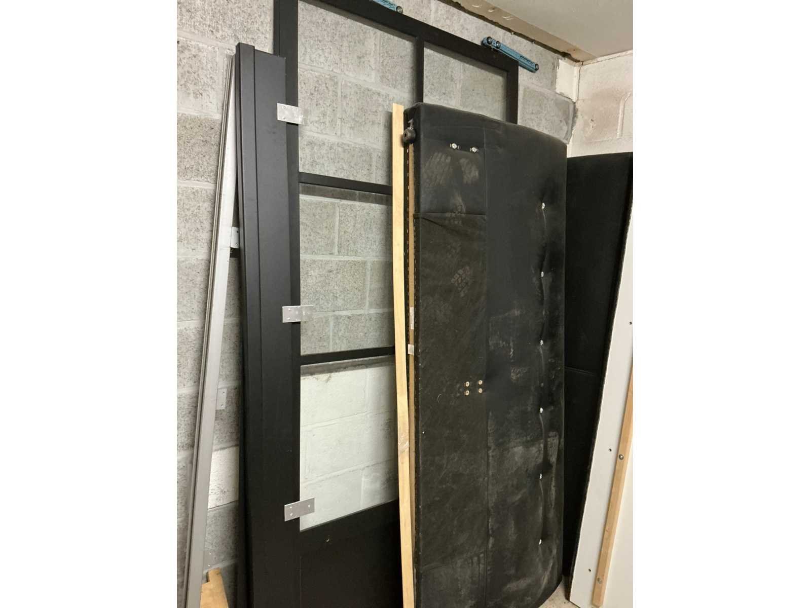Waaronder bestaande uit: Partij diverse deursloten, Kunststof batterijhouders, Klinken, klinkonderdelen, Elektrische sloten, Kunststof afdekkapjes voor kaartlezers, Slotafdekplaten, Divers bevestigingsmateriaal voor sloten waaronder schroeven en bouten, 1 alu deur voorzien van glas, 1 kunstlederen 2-persoons bedframe, Waaronder liggende in circa 5 lm metalen opbergrek voorzien van 6 en 7 leggers, hoogte circa 250cm, 1 houten bijzettafel voorzien van metalen onderstel, 4 metalen bijzetstoelen voorzien van kunststof zit en rug, Uitgezonderd genummerde kavels en eigendomsvoorbehoud, Afgifte volgens aanwijzing Nee