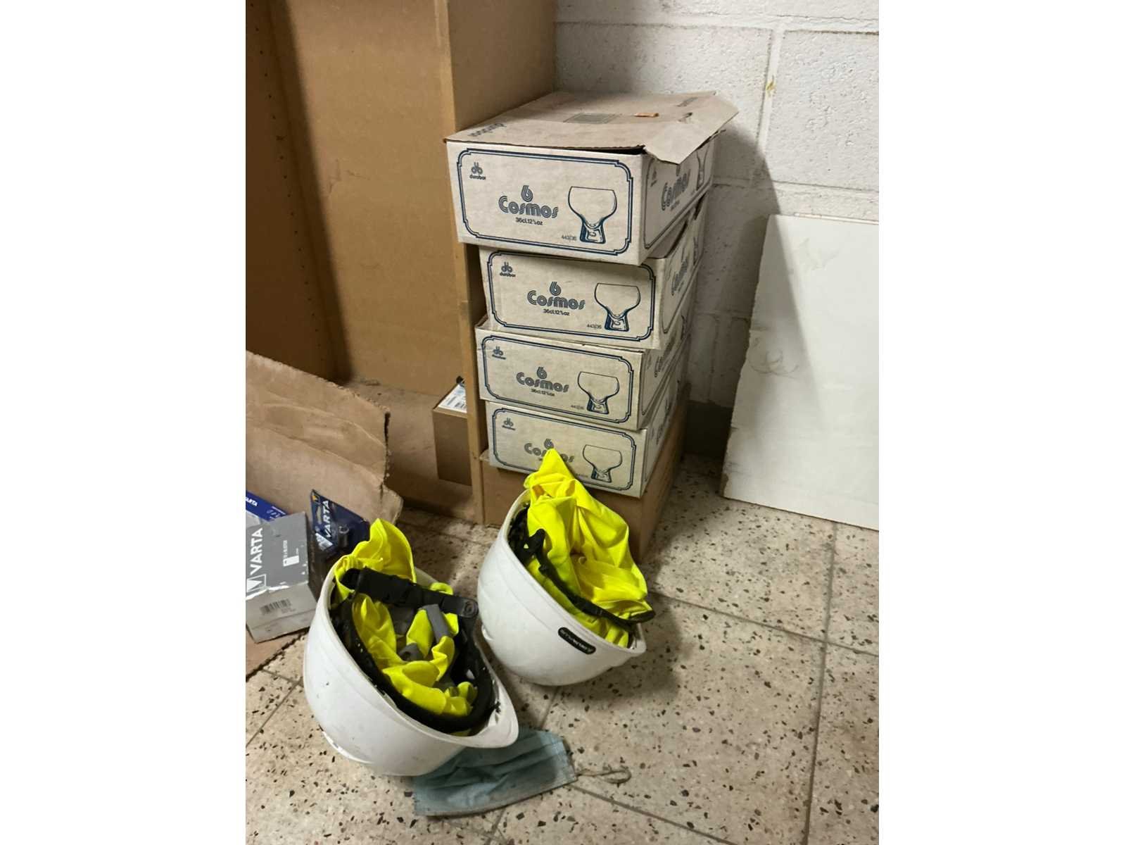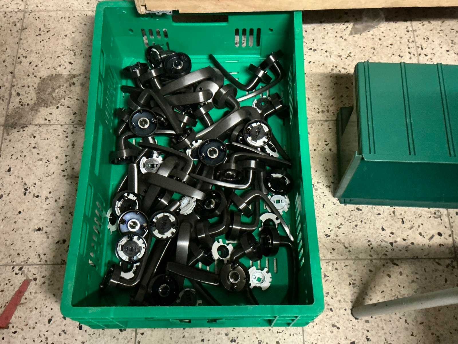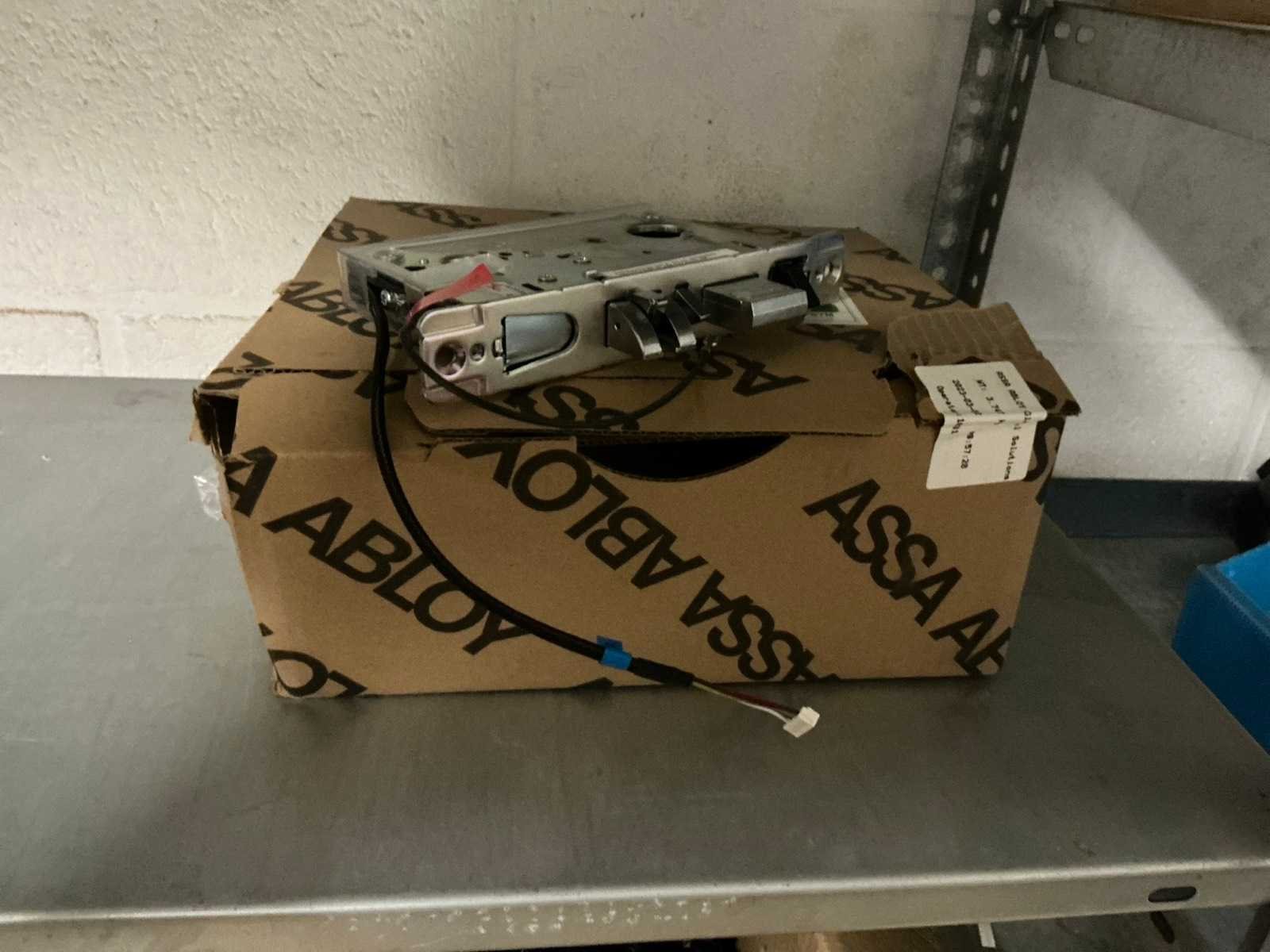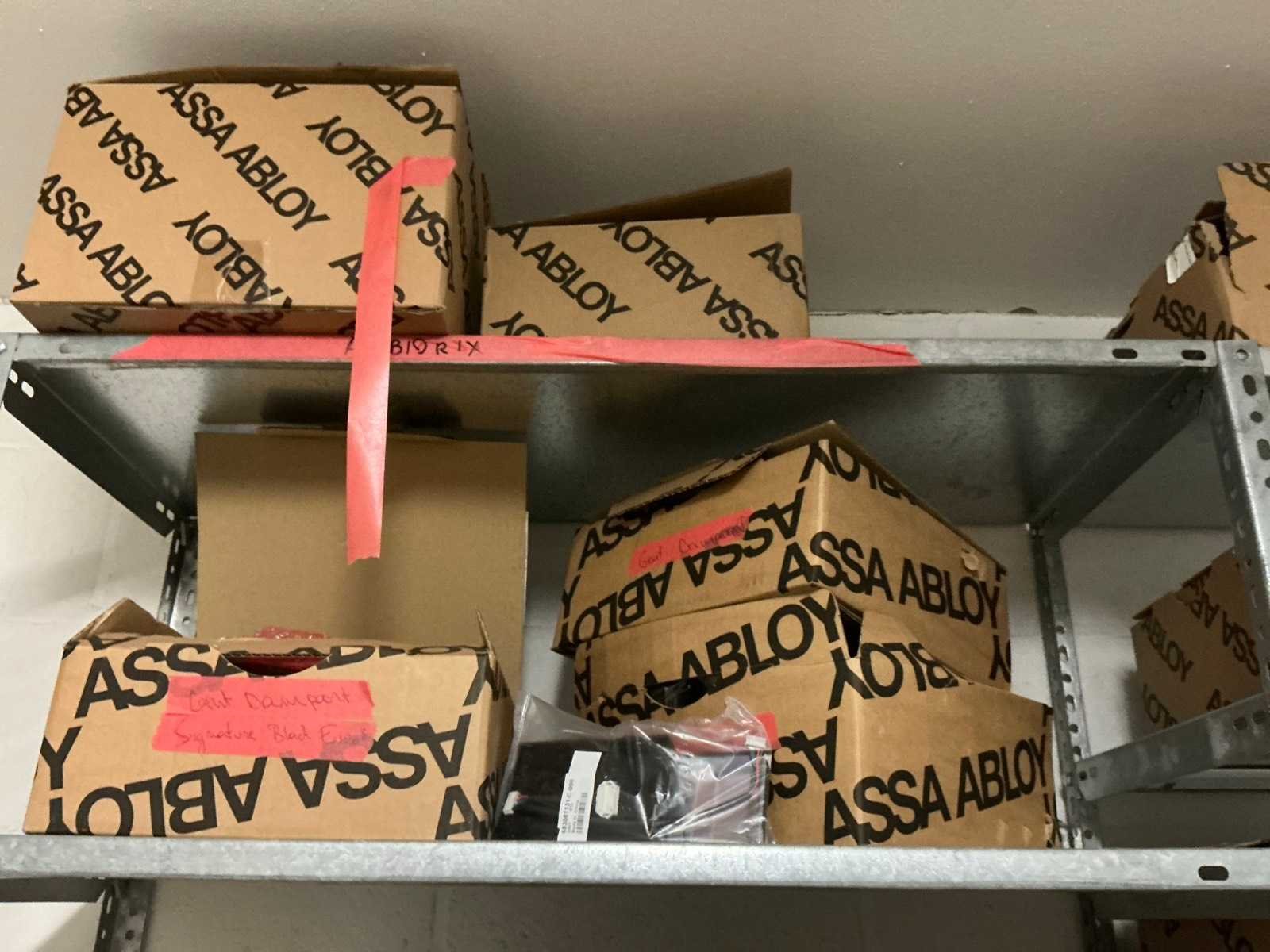 Waaronder bestaande uit: Partij diverse deursloten, Kunststof batterijhouders, Klinken, klinkonderdelen, Elektrische sloten, Kunststof afdekkapjes voor kaartlezers, Slotafdekplaten, Divers bevestigingsmateriaal voor sloten waaronder schroeven en bouten, 1 alu deur voorzien van glas, 1 kunstlederen 2-persoons bedframe, Waaronder liggende in circa 5 lm metalen opbergrek voorzien van 6 en 7 leggers, hoogte circa 250cm, 1 houten bijzettafel voorzien van metalen onderstel, 4 metalen bijzetstoelen voorzien van kunststof zit en rug, Uitgezonderd genummerde kavels en eigendomsvoorbehoud, Afgifte volgens aanwijzing Nee