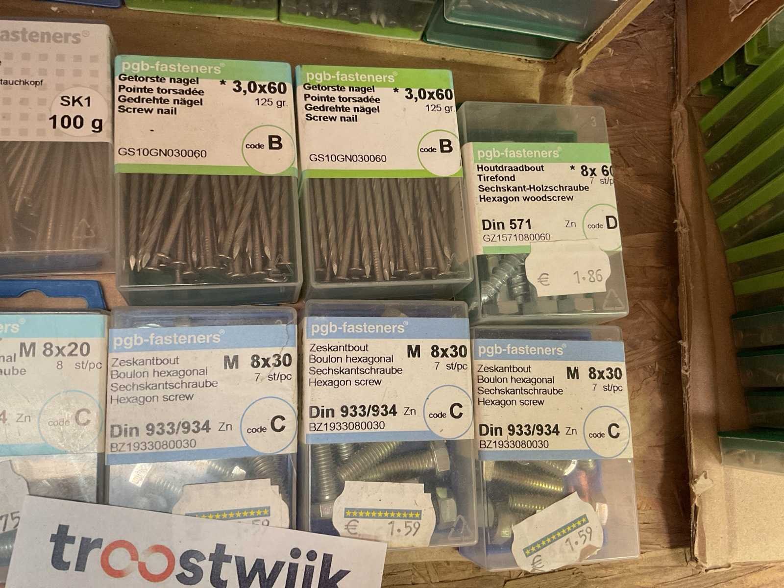 Houtschroeven; zeskantbouten; getorste nagels; puntduimen; nagels Nee