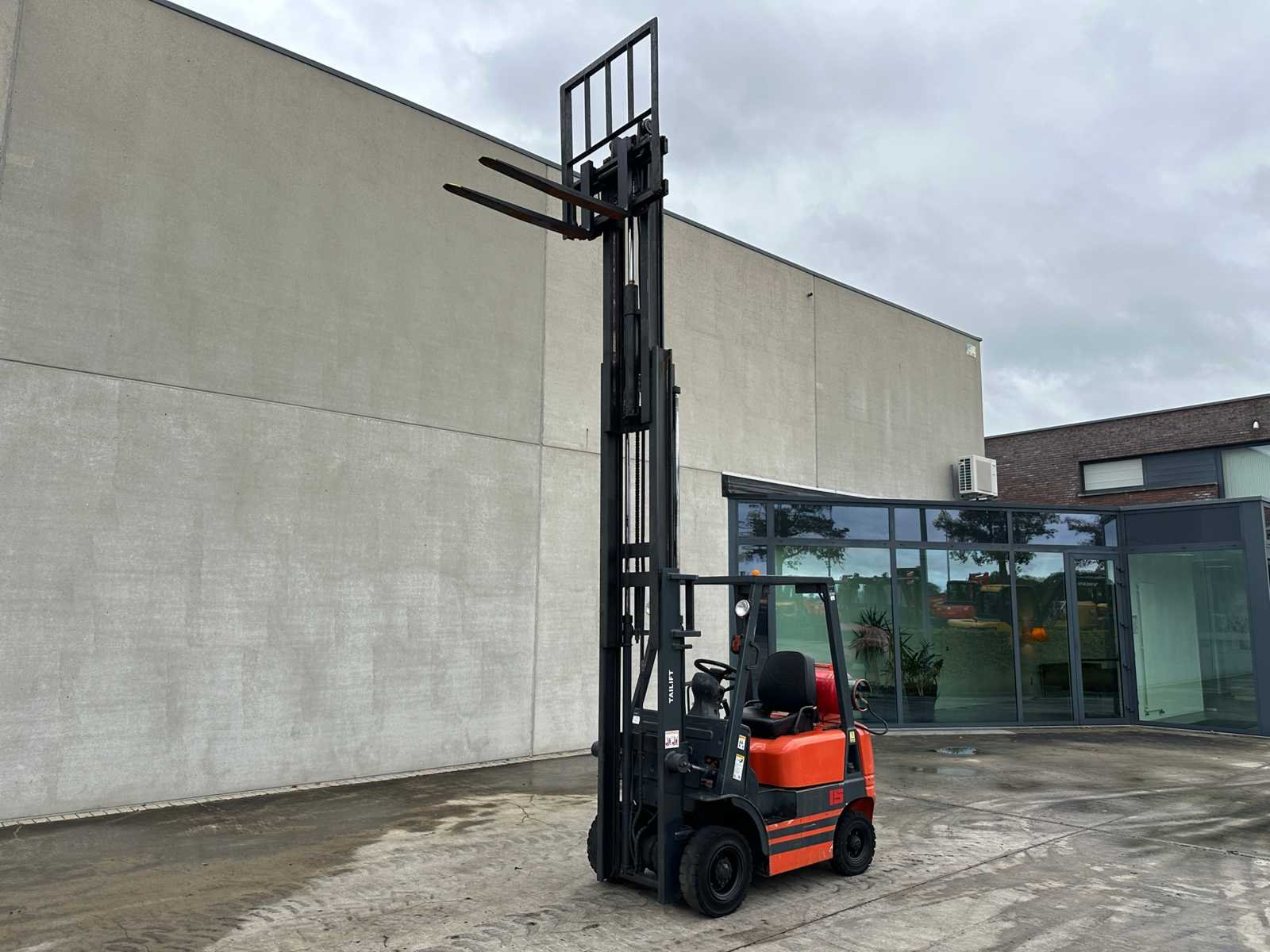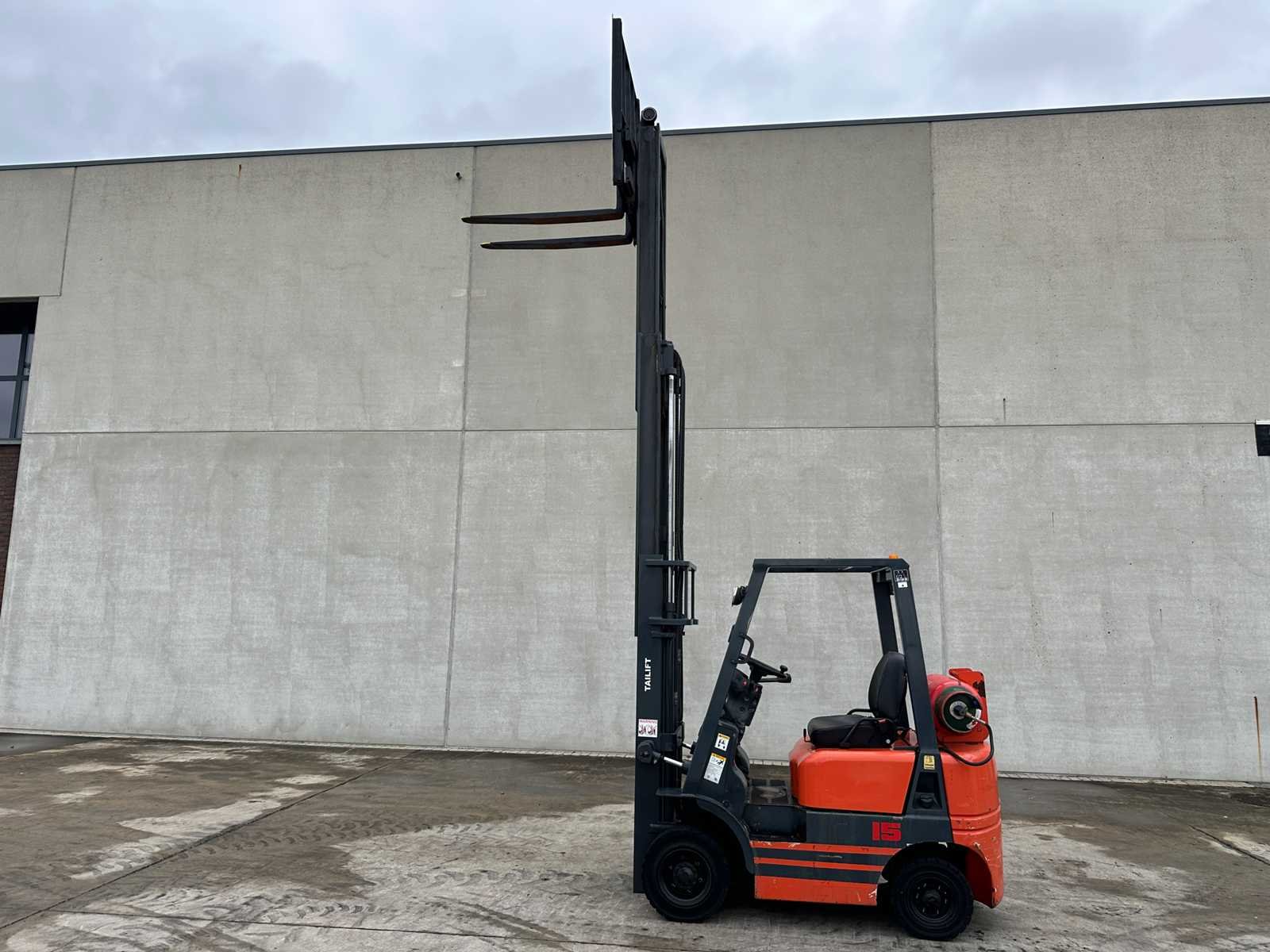 Geen documenten Side shift Nee Merk: Tailift Type: FG15 Bouwjaar: 2008 Serienummer: TA03440 Brandstof: Gas Aantal wielen: 4 Afgelezen urenstand: 4027 Side-shift: true Triple mast: true Eigen gewicht: 3270kg Hefvermogen: 1380kg Lepellengte: 1100mm Max. hefhoogte: 4400mm Vol rubber banden: true Totale afmeting L: 2300mm Totale afmeting Breedte: 1200mm Totale afmeting Hoogte: 2100mm LPG: true