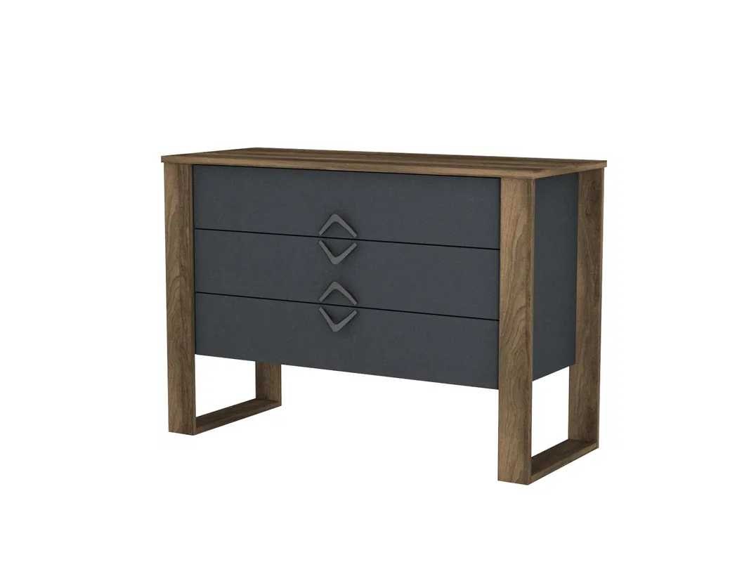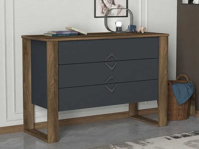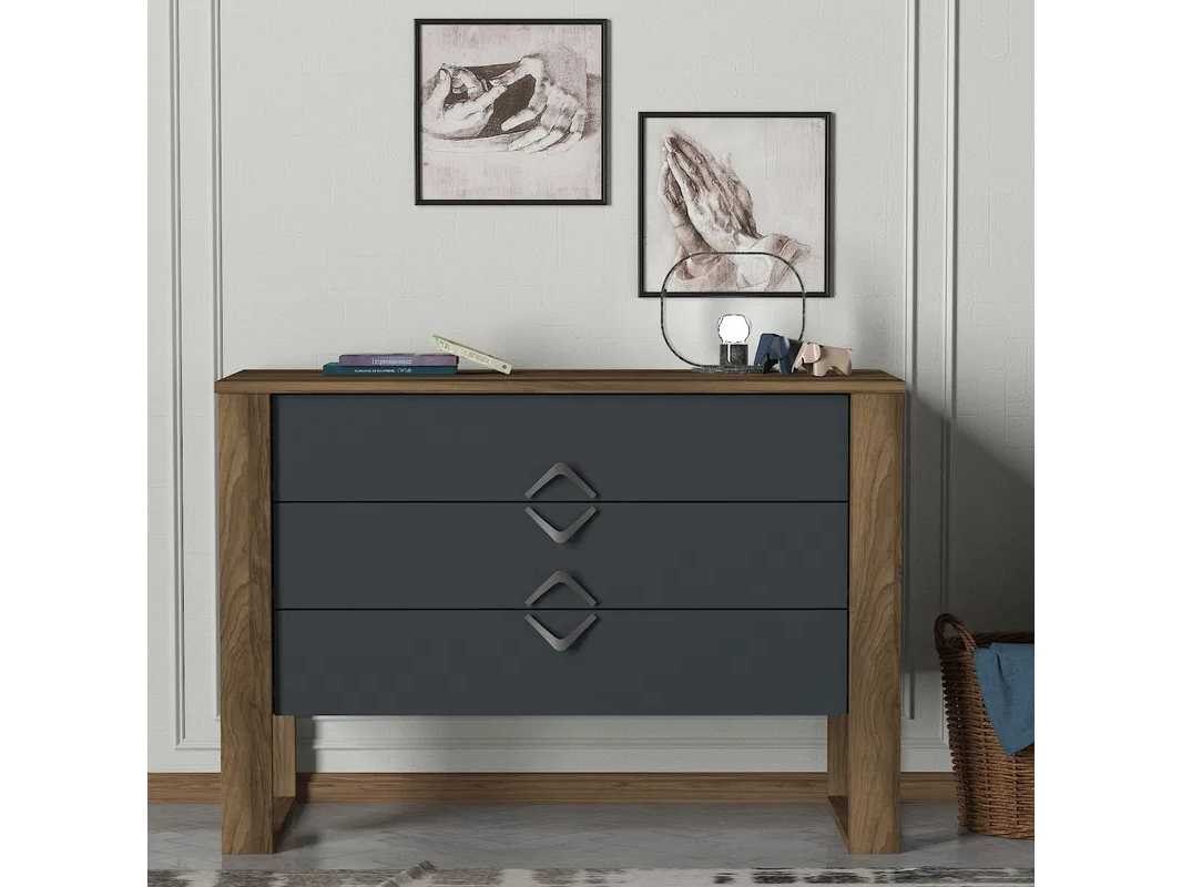 Moderne ladekast met drie lades, walnoot buitenafwerking en houtskoolkleurige lades