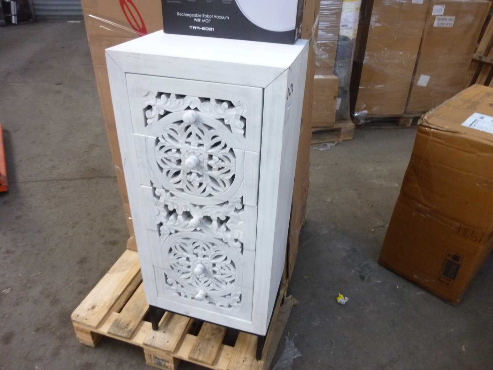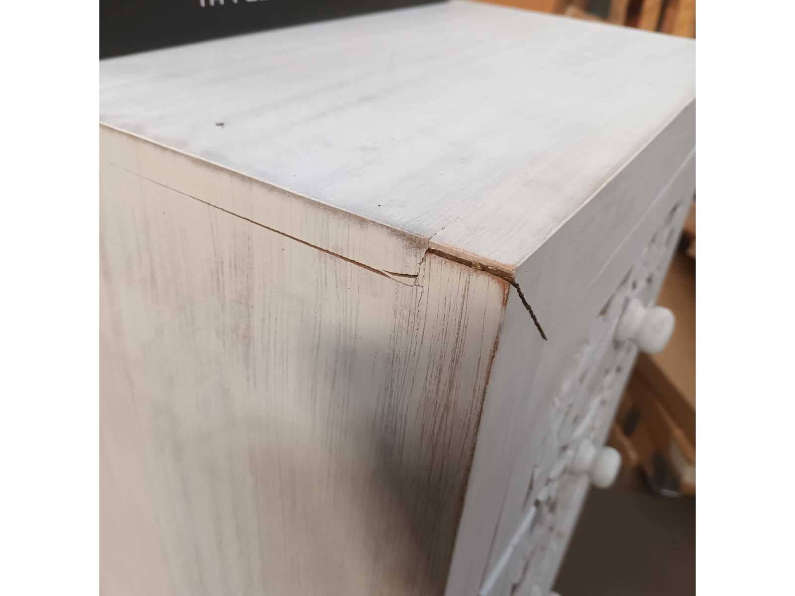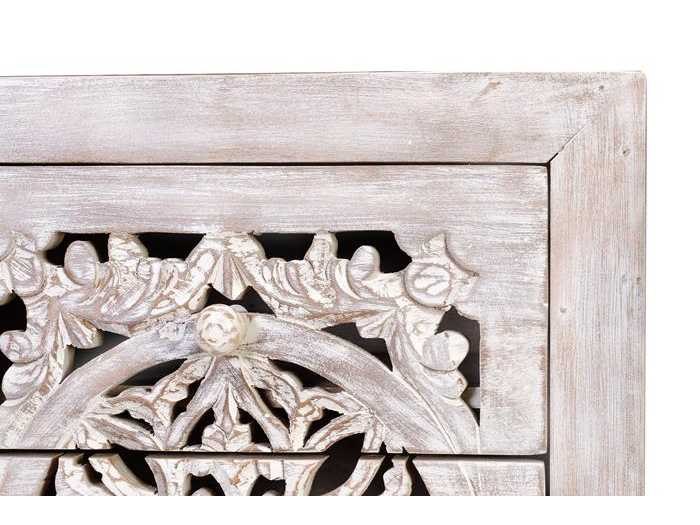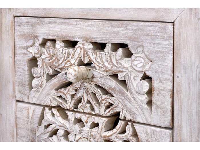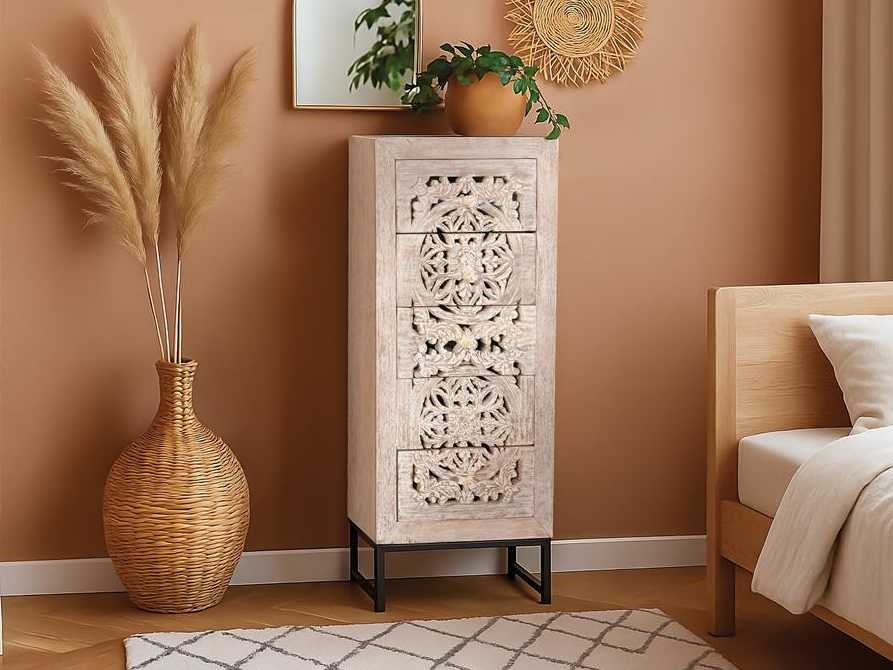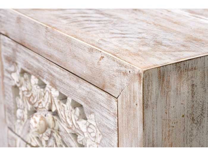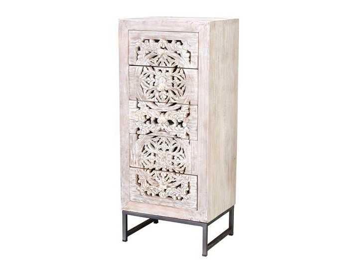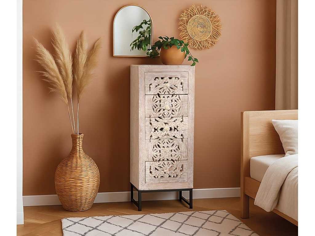 5-LADEKAST VAN HANDGESNEDEN MANGO-HOUT EN METALEN POTEN AFMETINGEN: 105x45x35cm VOLUME: 0,23 m³ PAKKETTEN: 1 PAKKET VERPAKKINGSMATEN: 109x51x42cm GEWICHT: 27 KG Non