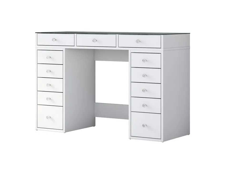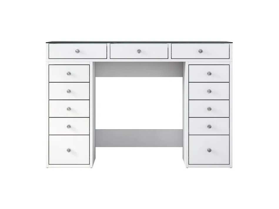 Productbeschrijving: Deze make-up kaptafel is geschikt voor woonkamers en slaapkamers. Het bevat aan beide zijden meerdere opberglades. Het is gemaakt van melaminespaanplaat. De afmetingen zijn 120 cm breed, 79,8 cm hoog en 44,5 cm diep. Non