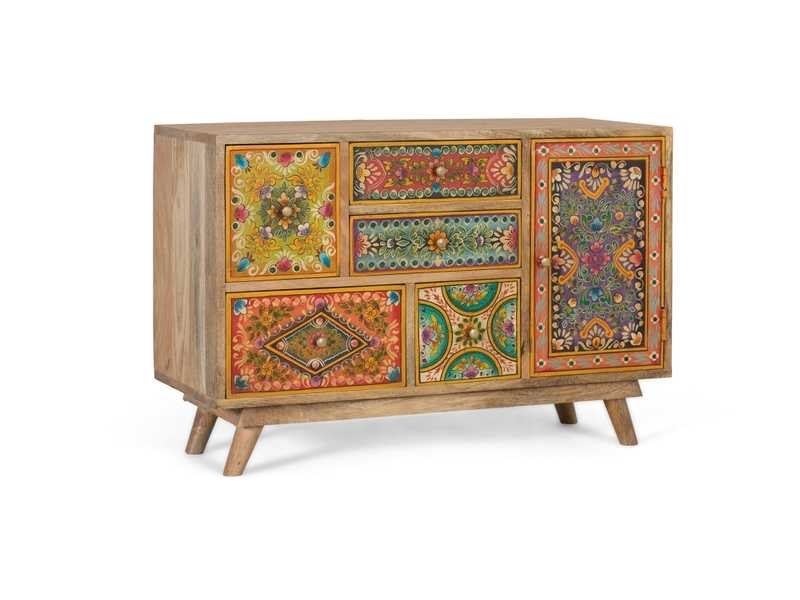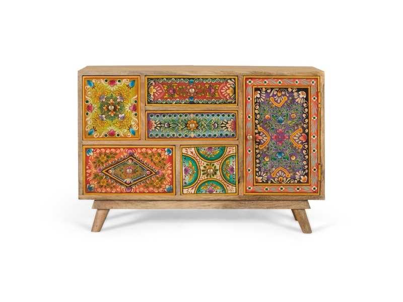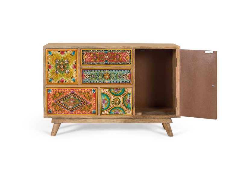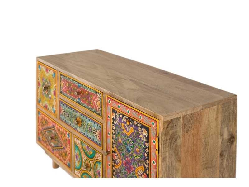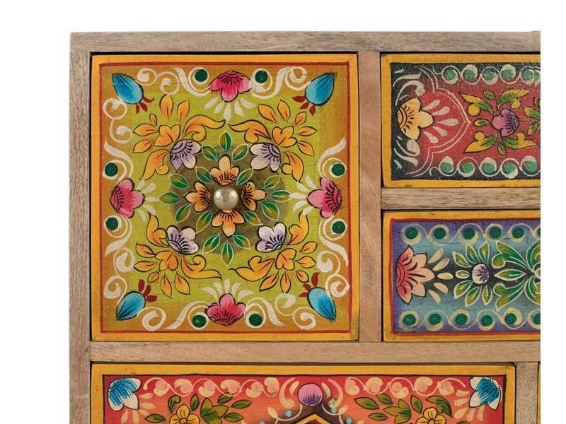 Handgemaakte ladekast van mangohout, met rechthoekig frame en lage poten. Het heeft meerdere lades en een deur, allemaal versierd met kleurrijke handgeschilderde patronen die het een etnische en bohemien stijl geven. Ideaal als decoratief en functioneel stuk in een woonkamer, gang of slaapkamer. Elke voorkant heeft een uniek patroon, waardoor het een uniek meubelstuk vol persoonlijkheid is. DEURAFMETINGEN: 39 x 25 cm, BEENHOOGTE: 8 cm, BINNENSTE PLANK: 30 x 25 cm, DEKSEL: 1,6 cm Non