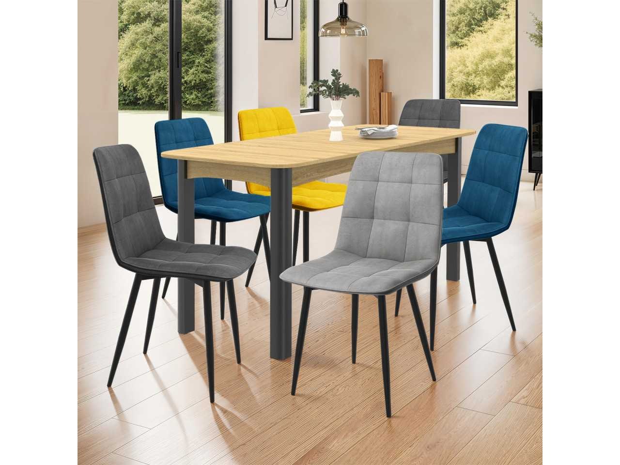 Set van 6 fluwelen stoelen in kleuren blauw x2, donkergrijs x2, lichtgrijs, geel