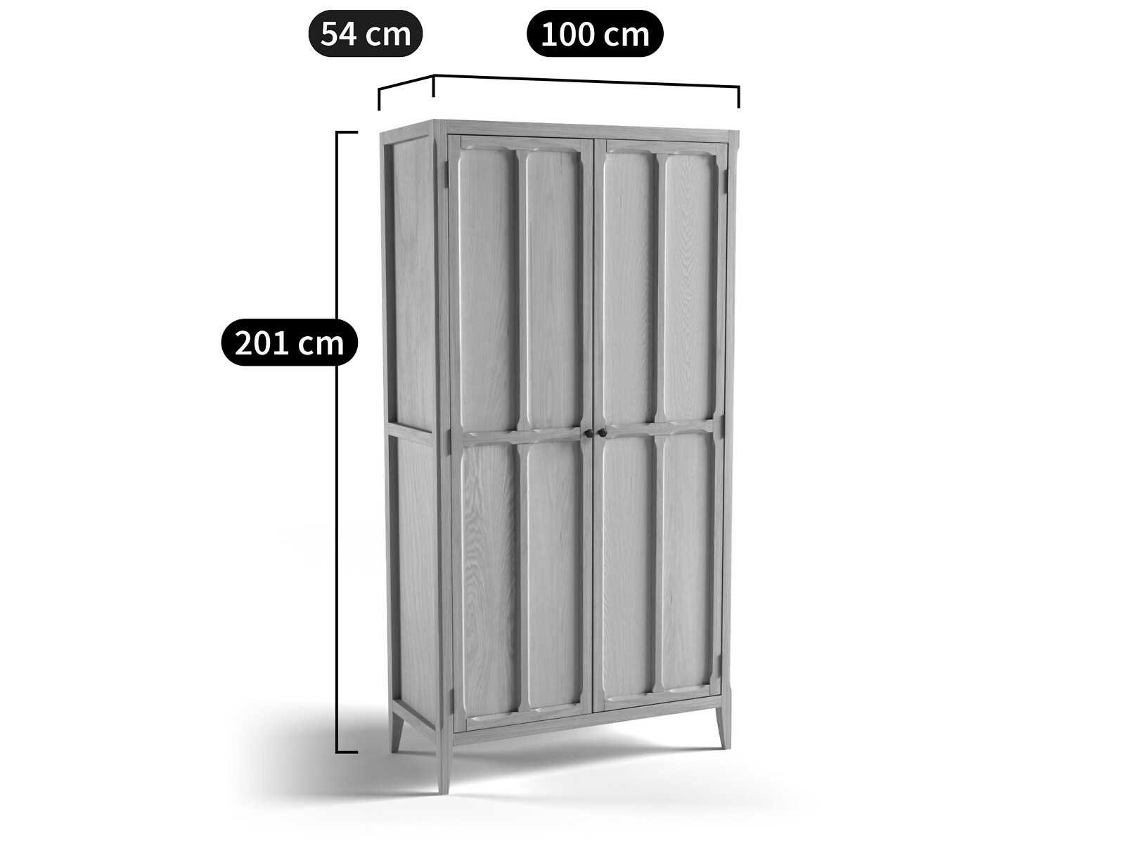 Beschrijving • 2 deuren • 1 plank + 1 hangrek • MDF, matte nitrocellulose lakafwerking voor grijs • MDF, gelakte afwerking in eiken, nitrocellulosevernis voor eikenhout • Zwarte metalen knopgrepen Afmetingen Totaal: • Breedte: 100 cm • Hoogte: 201 cm • Diepte: 54 cm Handig: • Topnis: W92 x H34,4 x D37,7 cm • Kledingkast W92 x H142,1 x D37,7 cm • Gewicht: 53,6 kg Non