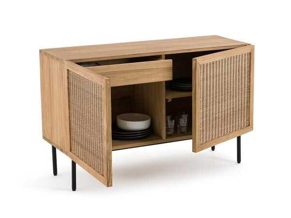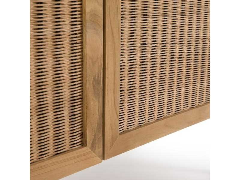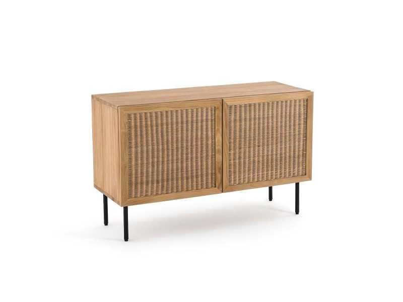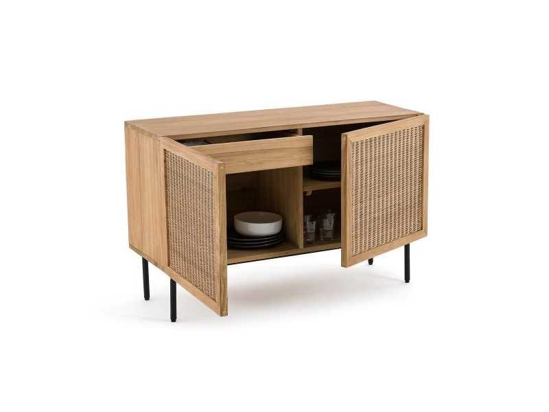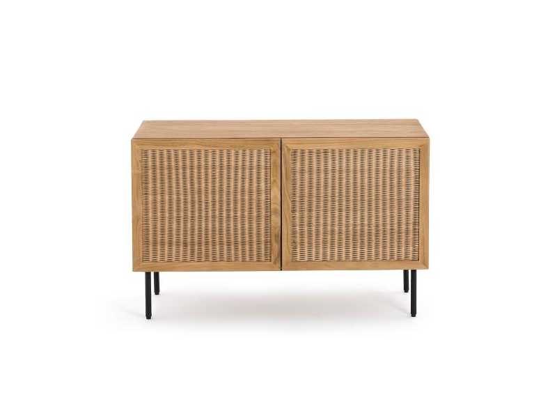 Beschrijving - Geassembleerde doos, frame en achterkant in FSC-gecertificeerde® massief teak, nitrocellulose afwerking - Gevlochten rotanvoorkant - Riem en basis in buisstaal, zwarte verf, epoxy-afwerking - 2 deuren met zachtsluitende scharnieren - Links: 1 grote nis met 1 verticale scheiding en 1 lade op een houten loper - Rechts: 2 nissen met 1 verwijderbare en verstelbare plank - Verstelbare plastic glijbanen - Voeten om te bevestigen Afmetingen Totaal - Breedte: 120 cm - Hoogte: 76 cm - Diepte: 45,5 cm Behulpzaam 1 grote nis: W57 x H38 x D41cm 1 lade op houten geleidingen: W52,5 x H9 x D31cm Non