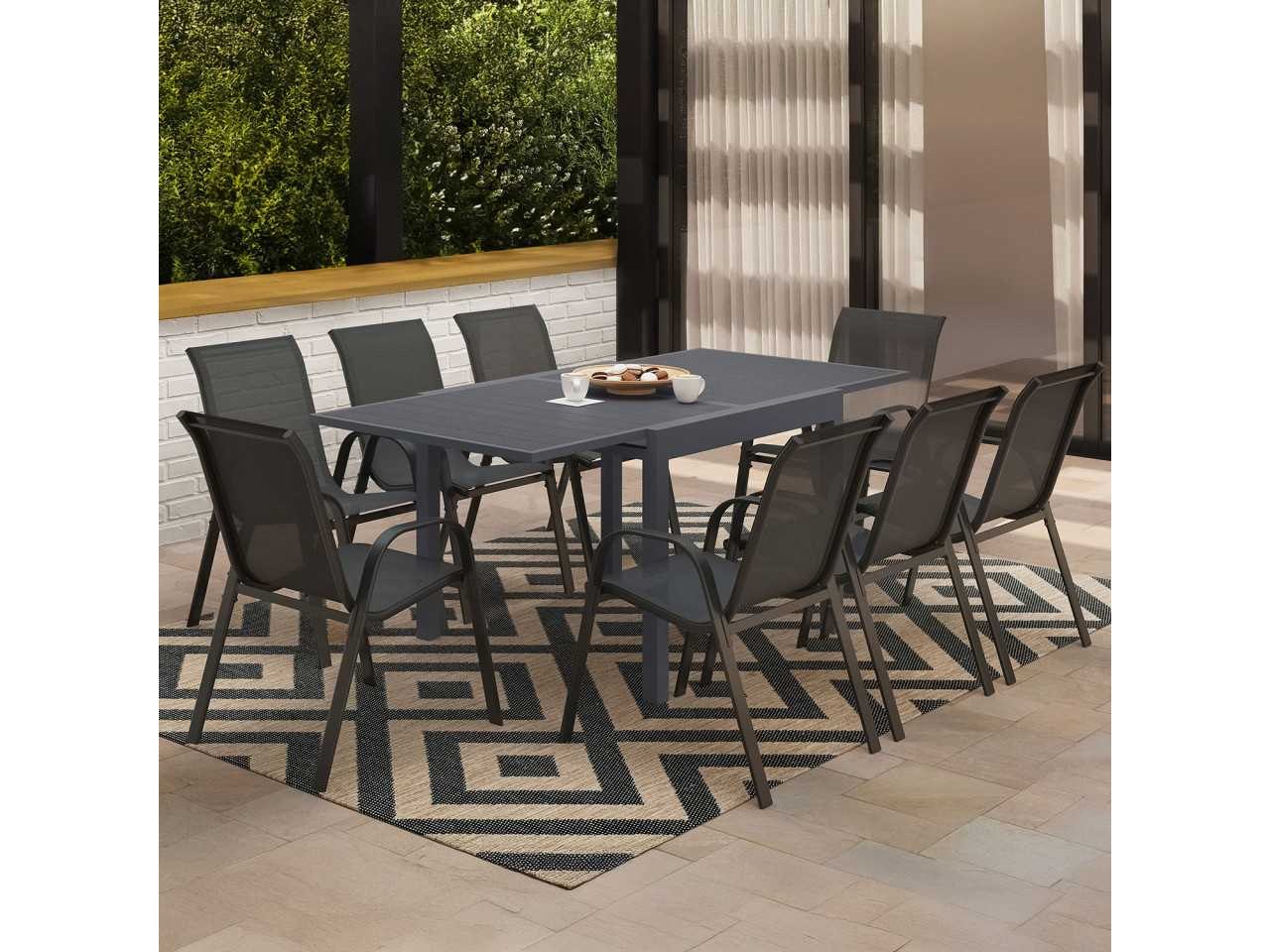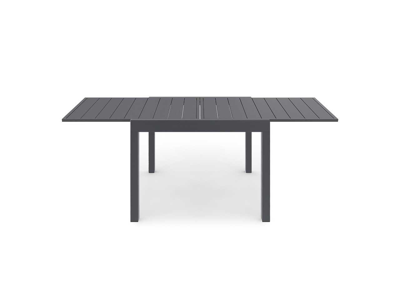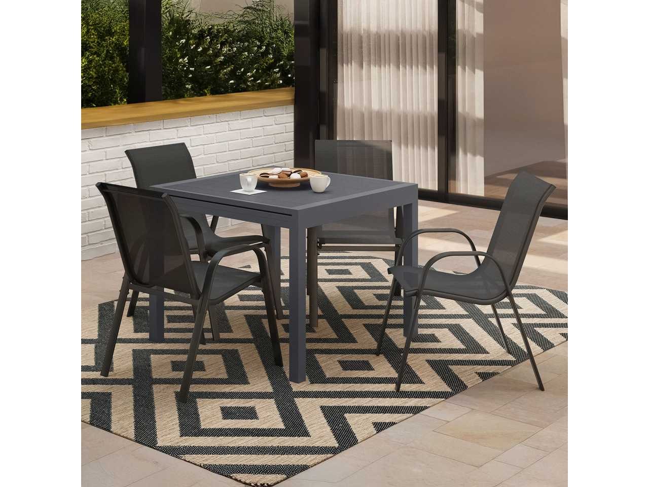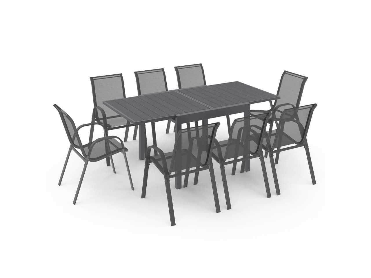 Technische beschrijving Tafelafmetingen: (L) 90/180 x (W) 90 x (H) 73 cm Materialen: aluminium frame, polyhouten plaat Kleur: grijze structuur, grijze bovenkant Trayafmetingen: (E) 2,5 x (L) 90 x (W) 82,5 cm Beenafmetingen: (W) 5 x (H) 65 cm Ruimte tussen de poten: (W) 80 x (H) 65 cm Dikte van de structuur: 8,5 cm Polywood plankenafmetingen: (L) 78,5 x (W) 9,4 x (E) 1,4 cm Afstand tussen de planken: 0,4 cm Productgewicht: 26,5 kg Verpakkingsafmetingen: (L) 98,5 x (B) 98,5 x (H) 15 cm Stoelafmetingen: (L) 51,5 x (W) 68 x (H) 84 cm Materialen: Stalen constructie / Texieel voor de zitplaats Kleur: Structuur en antracietgrijs textieleen Armleuningsafmetingen: (W) 4,2 x (H) 58,5 cm x (E) 13 mm Zitafmetingen: (L) 42 x (W) 45 x (H) 41,5 cm Rugleuning: (W) 42 x (H) 47 cm Stel jezelf in orde: Ja Hardware inbegrepen: Ja Non
