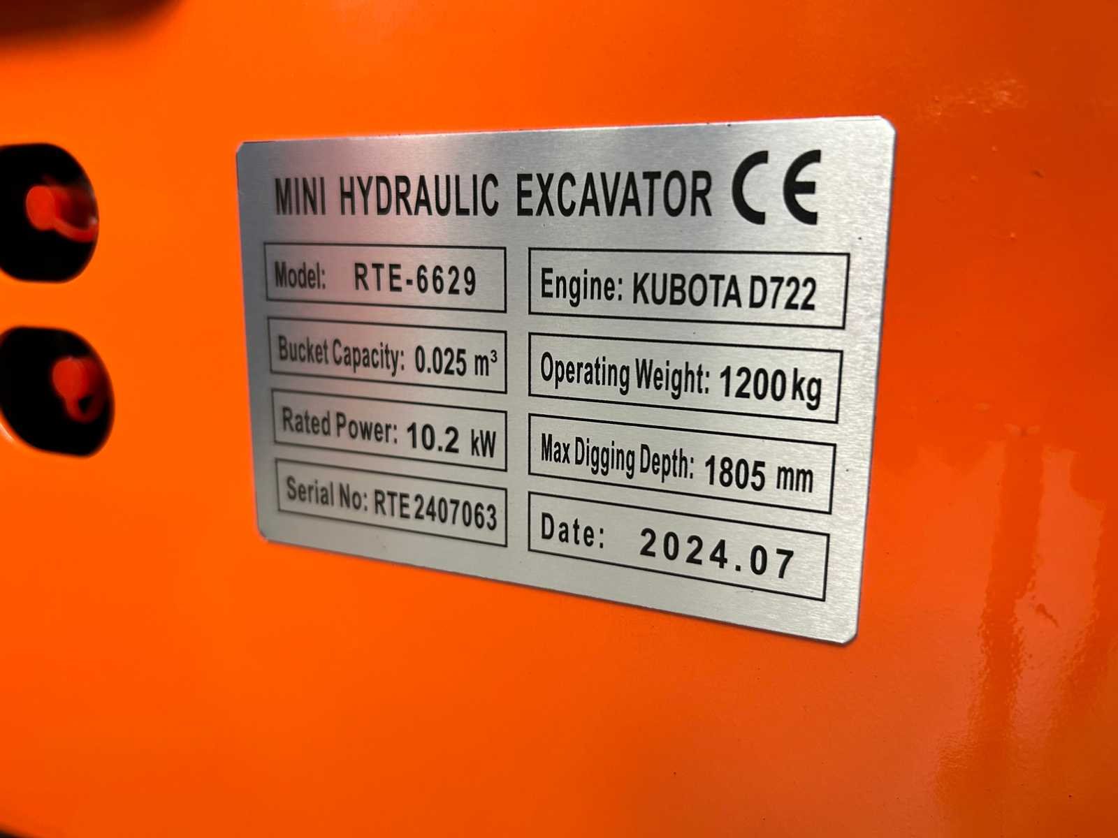Ongebruikt; zwenkarm; motor Kubota D722 EURO5; bucket capaciteit 0,025m3; v.v. verlichting; 6629 Nee Merk: RTE Type: 12-6 Bouwjaar: 2025 Merk motor: Kubota Motorvermogen (kW): 10.20kW Aantal cilinders: 3 Brandstof: Diesel Max. graafdiepte: 1805mm Inclusief graafbak: Yes Graafbak afm. l: 380mm Graafbak afm. b: 225mm Graafbak afm. h: 310mm Rups breedte: 180mm Eigen gewicht: 1200kg Totale afmeting L: 2300mm Totale afmeting Breedte: 820mm Totale afmeting Hoogte: 2200mm