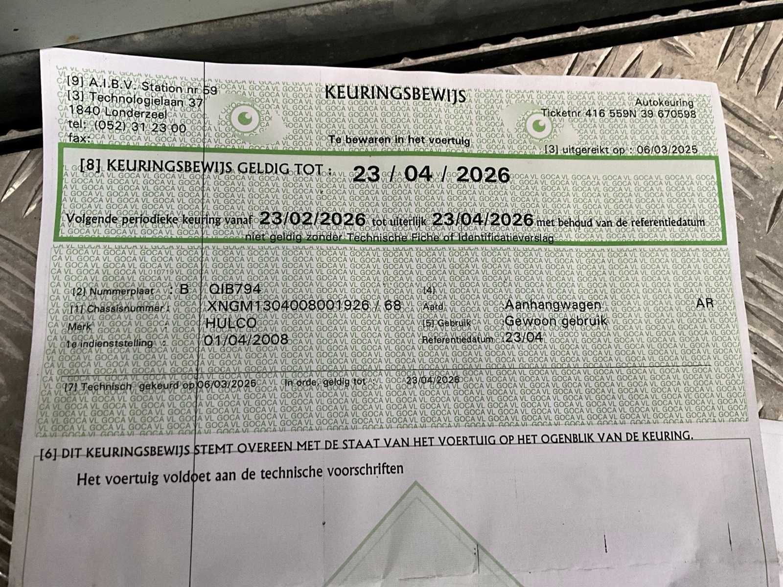 Zonder inhoud Nee Merk: Hulco Type: M1 Bouwjaar: 2008 Chassisnummer: XNGM1304008001926 Aantal assen: 2 Laadbak afmeting l: 304cm Laadbak afmeting b: 200cm Ledig gewicht: 640kg Laadvermogen: 2360kg Datum eerste toelating: 1/4/2008 APK vervaldatum: 23/4/2026 Nationaliteit documenten: België