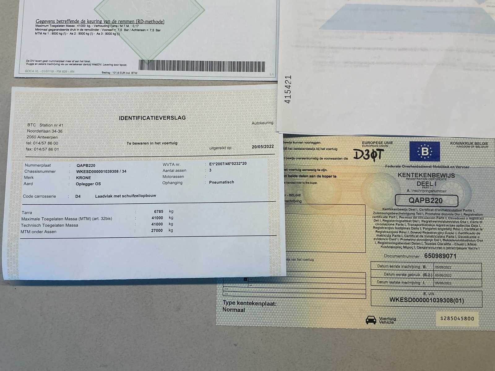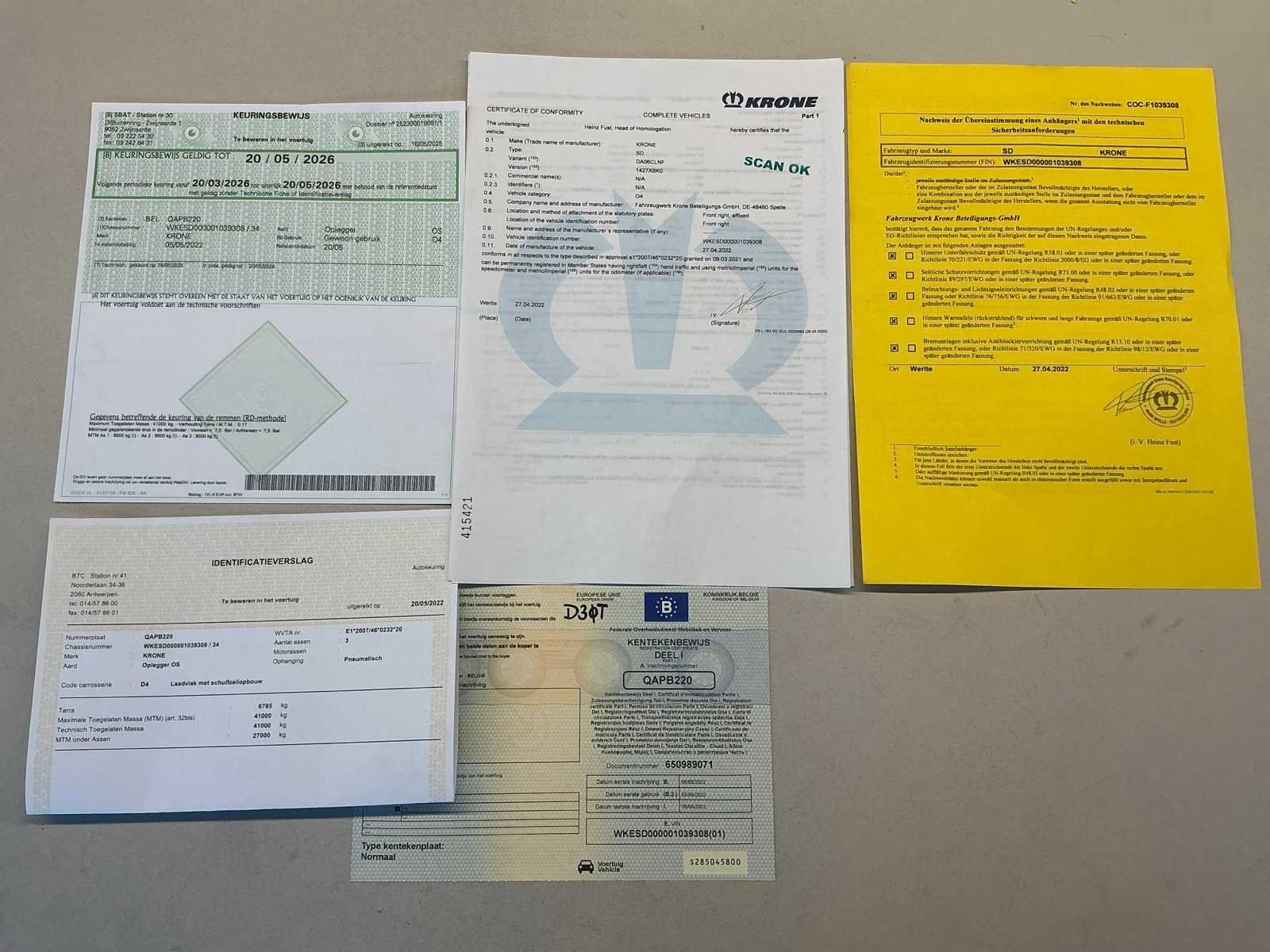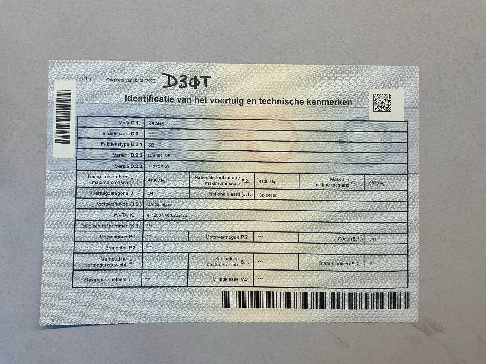 Documenten: Inschrijvsbewijs deel 1+2, gelijkvormigheidsattest, ID verslag, keuringsbewijs 20/05/2026, TUV document Nee Merk: Krone Type: SD Bouwjaar: 2022 Chassisnummer: WKESD000001039308 Laadbak afmeting l: 1386cm Laadbak afmeting b: 255cm Zeiltrailer: true Datum eerste toelating: 05/05/2022 Kentekenpapieren compleet?: true Nationaliteit documenten: België