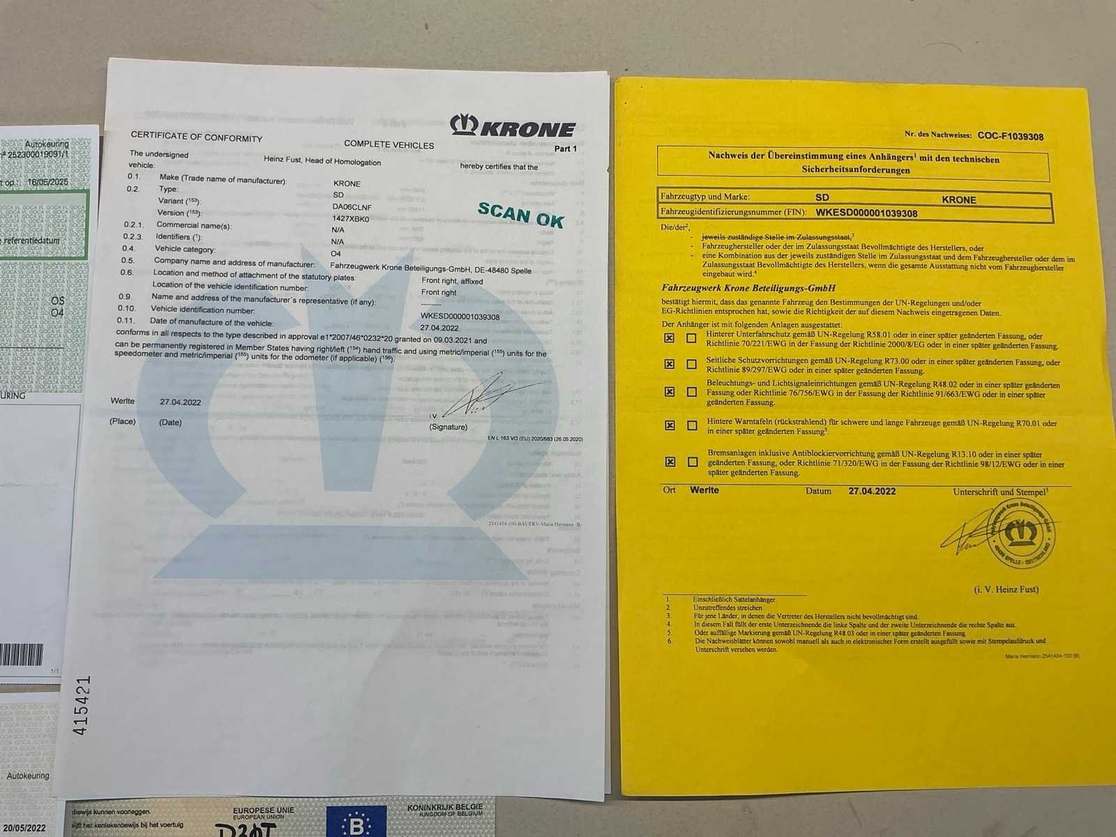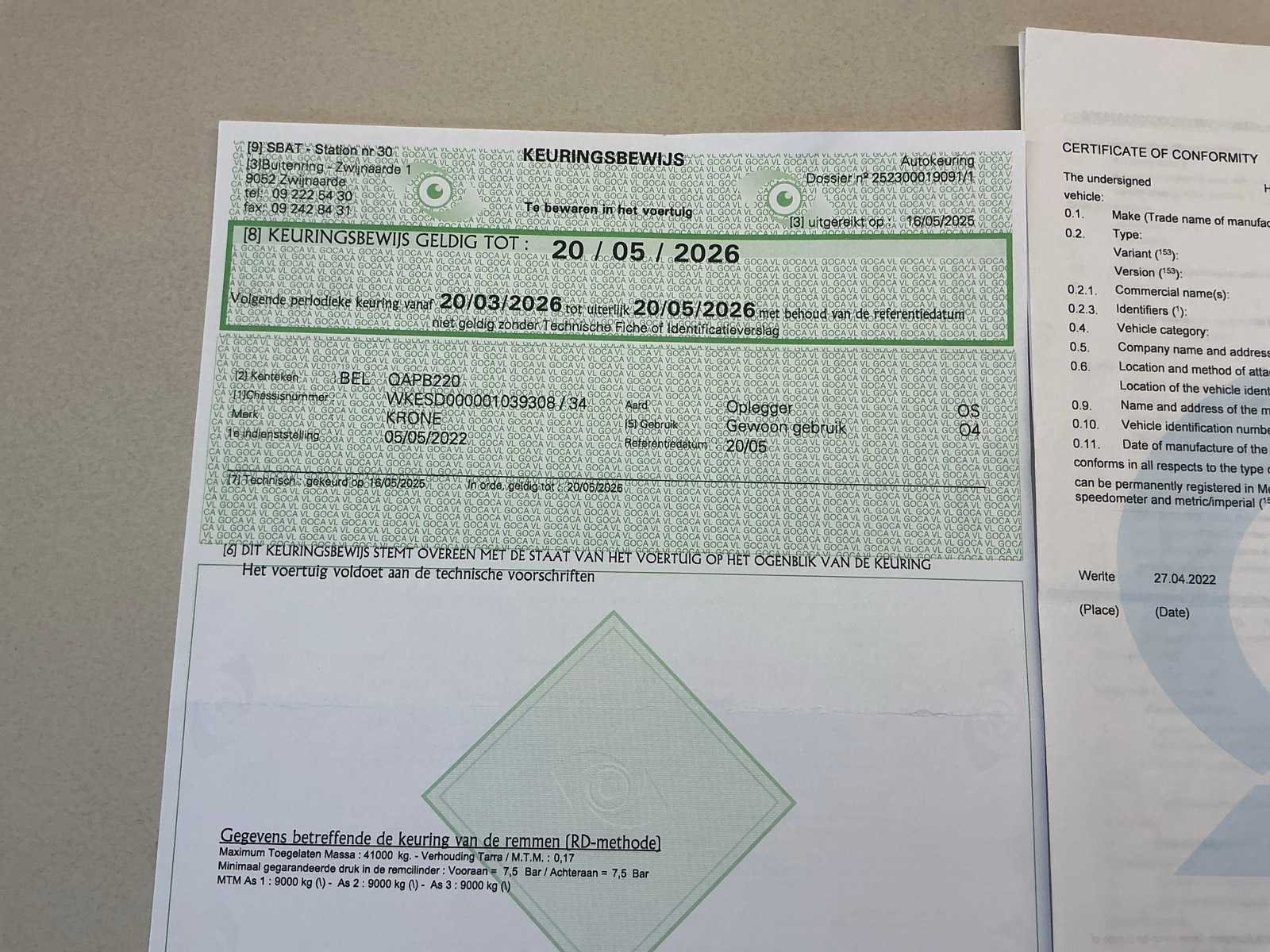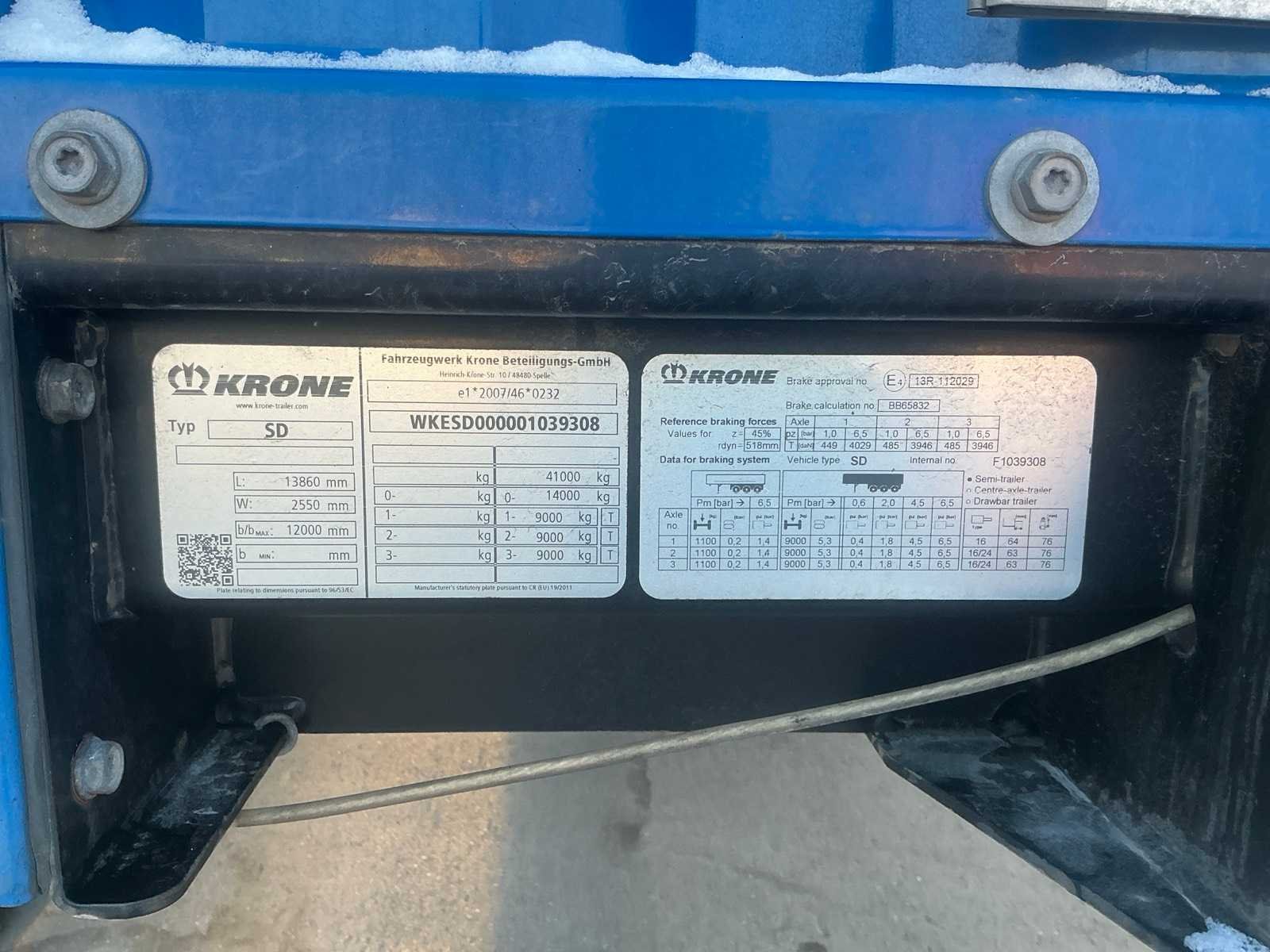 Documenten: Inschrijvsbewijs deel 1+2, gelijkvormigheidsattest, ID verslag, keuringsbewijs 20/05/2026, TUV document Nee Merk: Krone Type: SD Bouwjaar: 2022 Chassisnummer: WKESD000001039308 Laadbak afmeting l: 1386cm Laadbak afmeting b: 255cm Zeiltrailer: true Datum eerste toelating: 05/05/2022 Kentekenpapieren compleet?: true Nationaliteit documenten: België