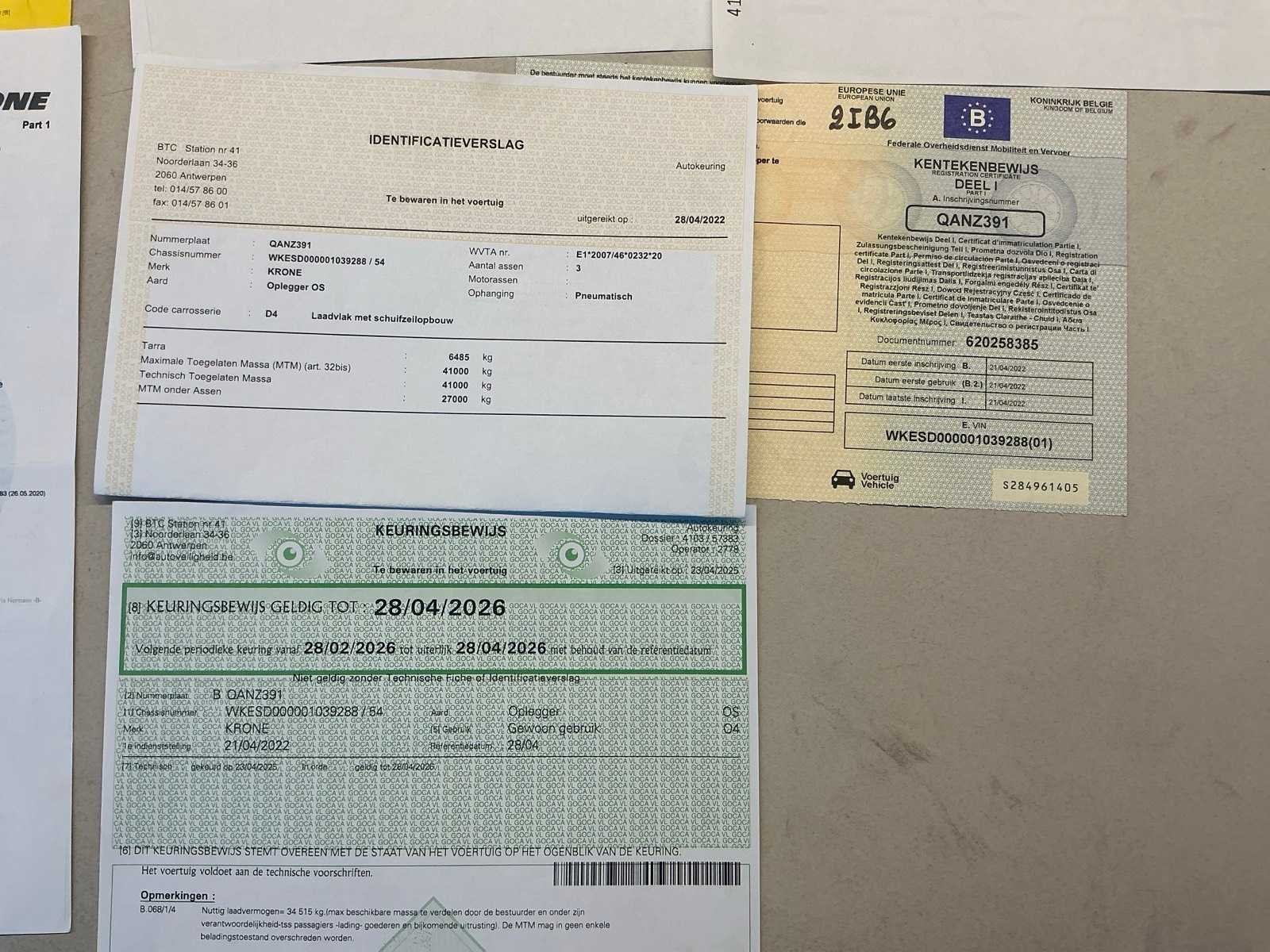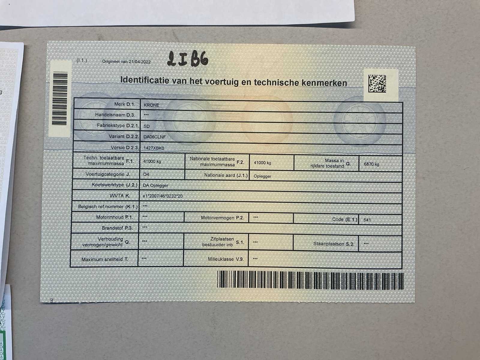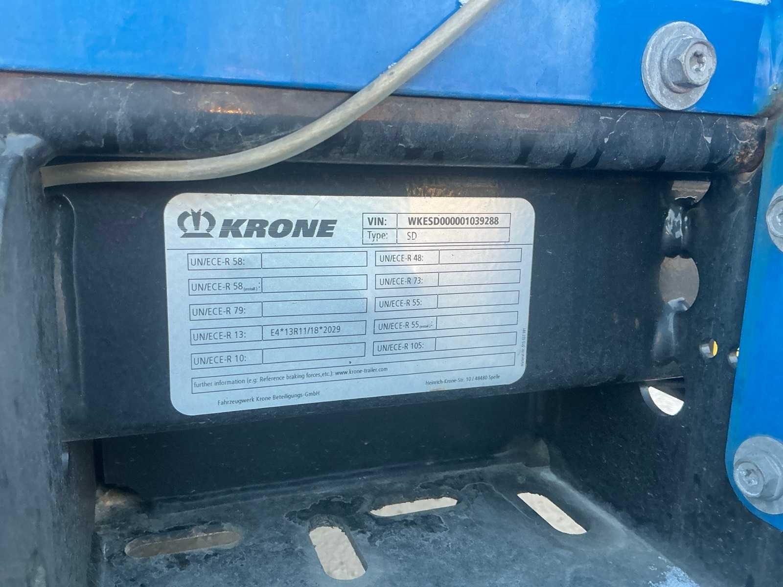 Documenten: Inschrijvsbewijs deel 1+2, gelijkvormigheidsattest, ID verslag, keuringsbewijs 28/04/2026, TUV document Nee Merk: Krone Type: SD Bouwjaar: 2022 Chassisnummer: WKESD000001039288 Laadbak afmeting l: 1386cm Laadbak afmeting b: 255cm Zeiltrailer: true Datum eerste toelating: 21/04/2022 Kentekenpapieren compleet?: true Nationaliteit documenten: België