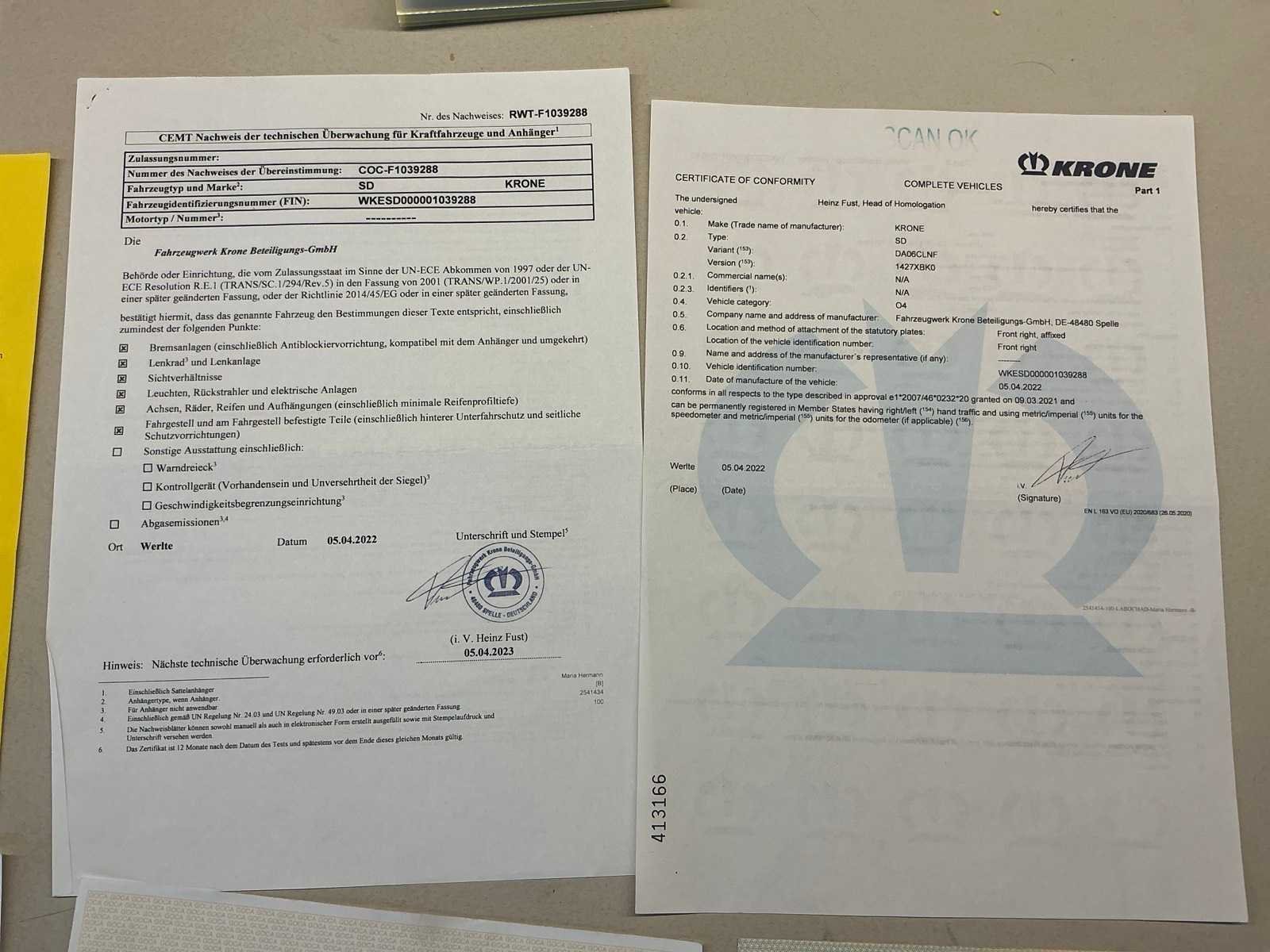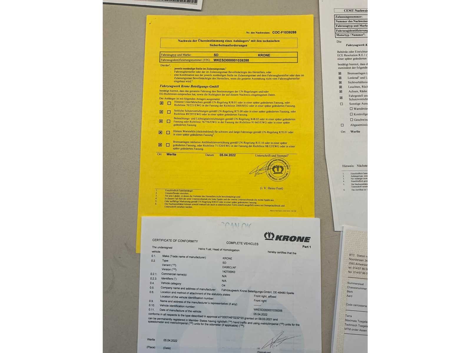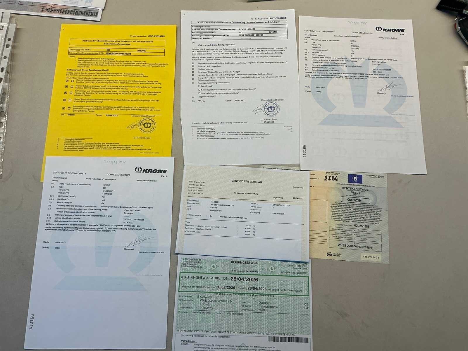 Documenten: Inschrijvsbewijs deel 1+2, gelijkvormigheidsattest, ID verslag, keuringsbewijs 28/04/2026, TUV document Nee Merk: Krone Type: SD Bouwjaar: 2022 Chassisnummer: WKESD000001039288 Laadbak afmeting l: 1386cm Laadbak afmeting b: 255cm Zeiltrailer: true Datum eerste toelating: 21/04/2022 Kentekenpapieren compleet?: true Nationaliteit documenten: België