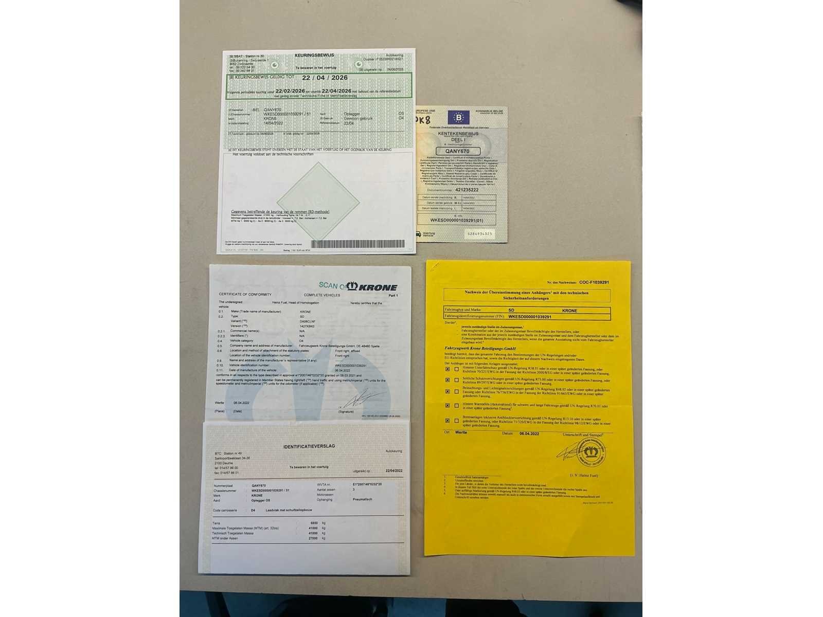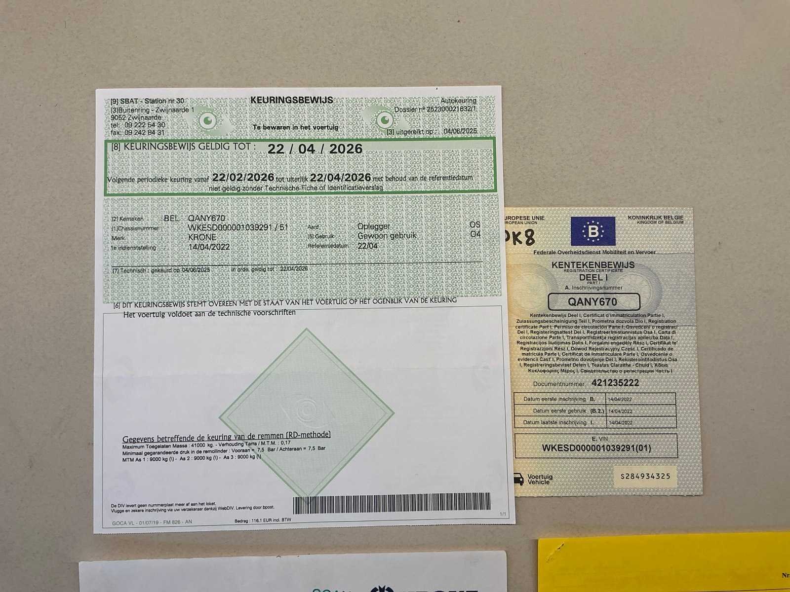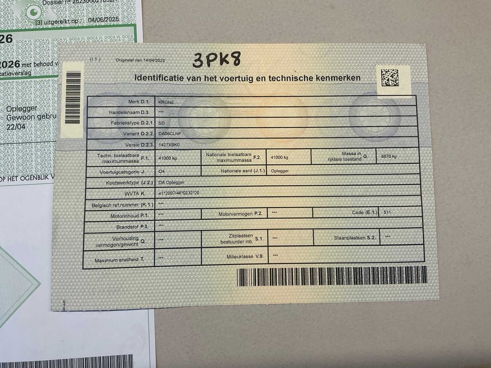 Documenten: Inschrijvsbewijs deel 1+2, gelijkvormigheidsattest, ID verslag, keuringsbewijs 22/04/2026 Nee Merk: Krone Type: SD Bouwjaar: 2022 Chassisnummer: WKESD000001039291 Aantal assen: 3 Laadbak afmeting l: 1386cm Laadbak afmeting b: 255cm Zeiltrailer: true Datum eerste toelating: 14/04/2022 Kentekenpapieren compleet?: true Nationaliteit documenten: België