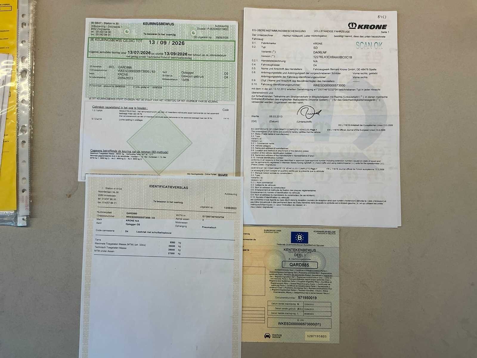 Documenten: Inschrijvsbewijs deel 1+2, gelijkvormigheidsattest, ID verslag, keuringsbewijs 13/09/2026, TUV document Nee Merk: Krone Type: SD Bouwjaar: 2013 Chassisnummer: WKESD000000573000 Aantal assen: 3 Laadbak afmeting l: 1386cm Laadbak afmeting b: 255cm Zeiltrailer: true Datum eerste toelating: 22/04/2013 Kentekenpapieren compleet?: true Nationaliteit documenten: België
